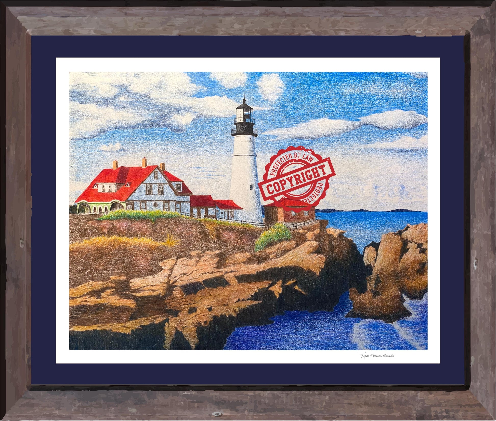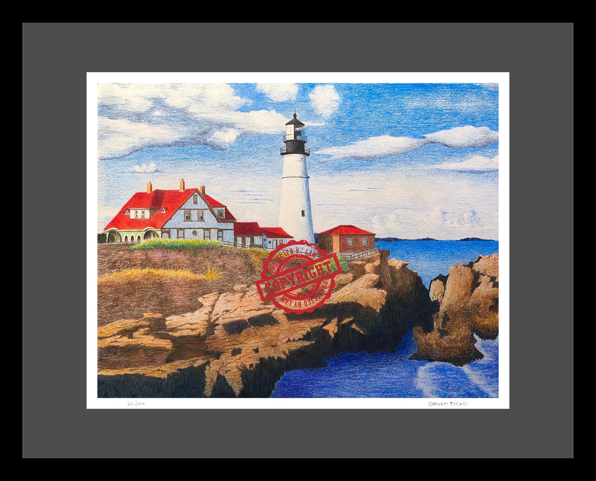 Limited edition giclee lighthouse art print from original artwork hand-drawn and hand-colored.