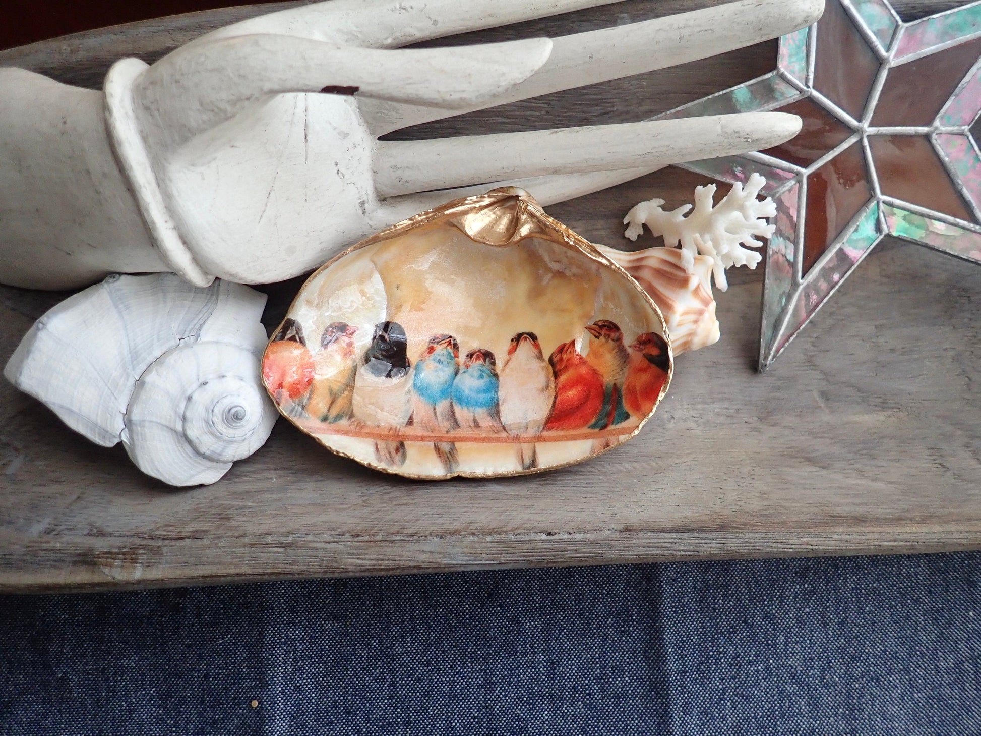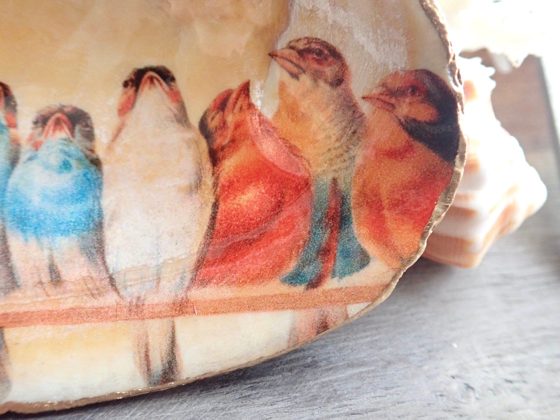 Decoupage Clam Shell Trinket Dish Bird Lover Art