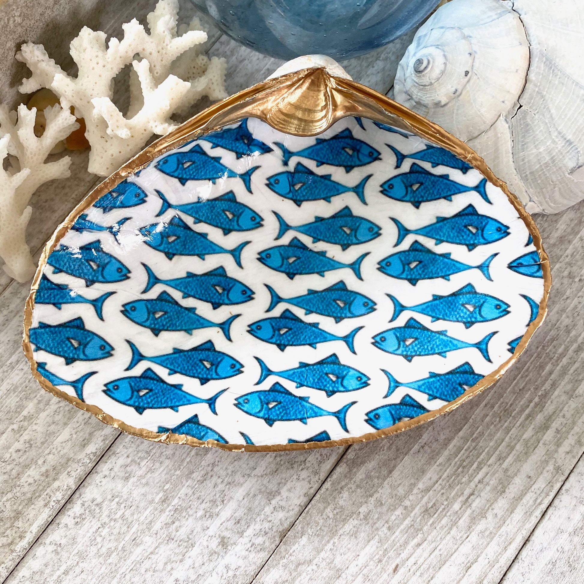 Decoupage Blue & White Clam Shell Ring Dish – Fish Art Coastal Jewelry Holder, Nautical Gift