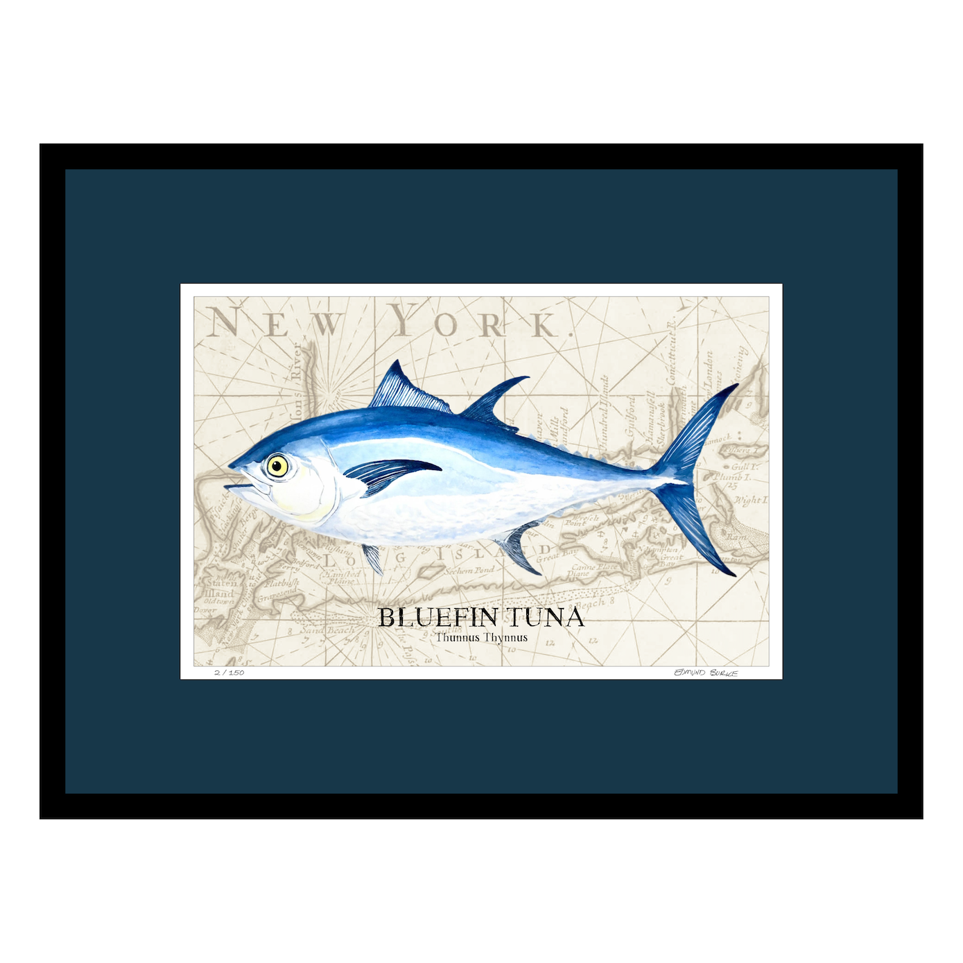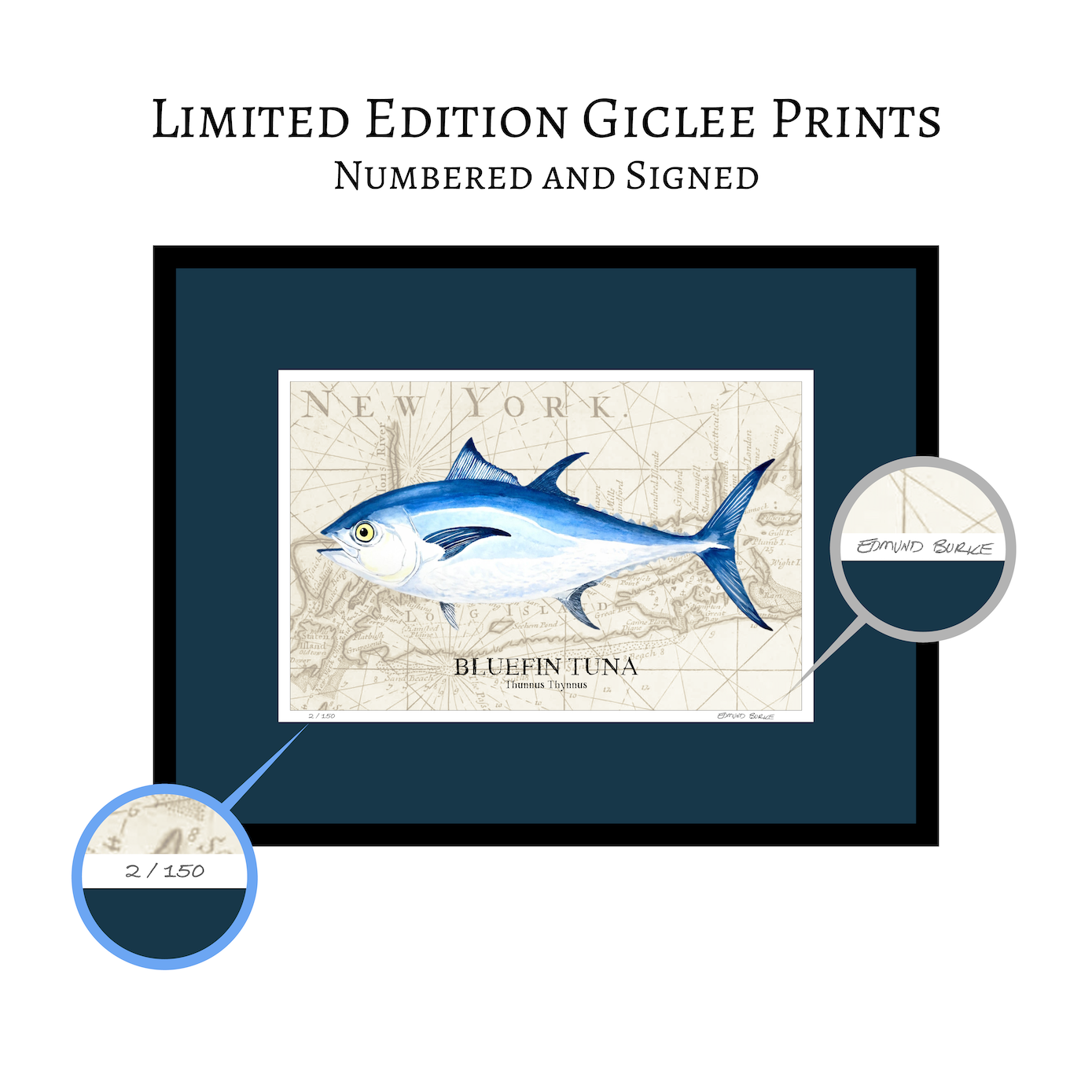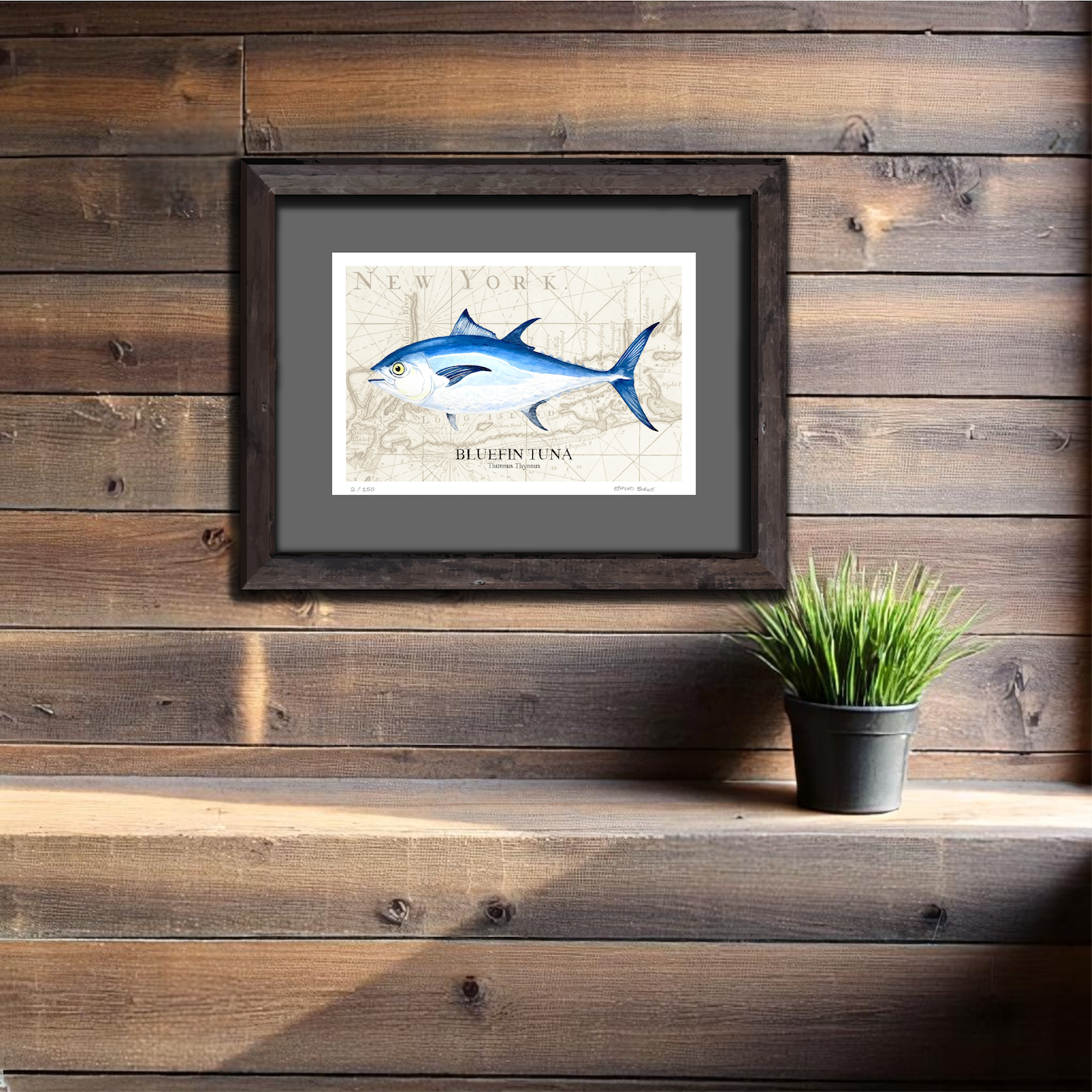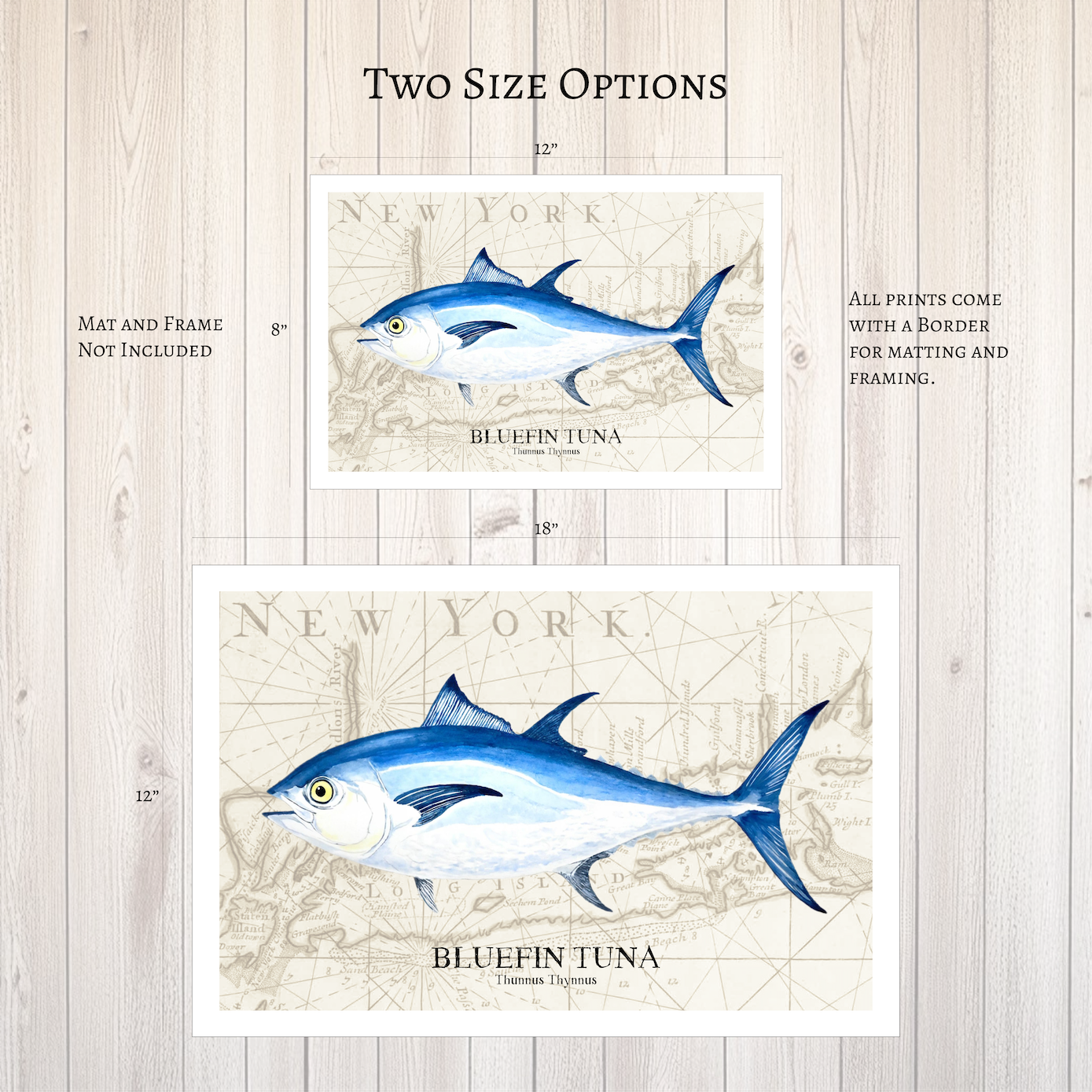 Bring the power of the ocean and the heritage of Long Island together in this original watercolor print of a bluefin tuna set on an antique nautical map of Long Island. The deep blues and silvery tones of the bluefin tuna capture the beauty of this legendary fish, while the vintage map background adds history, depth, and a coastal charm that makes this piece truly unique.