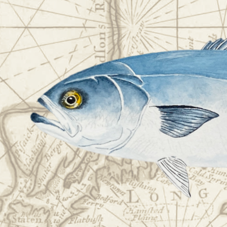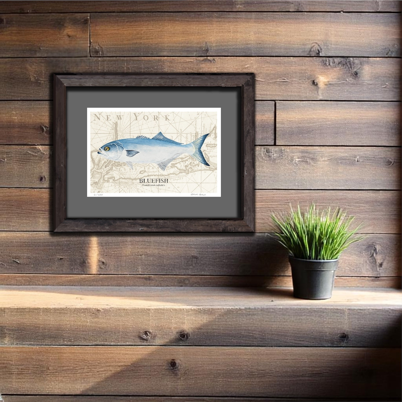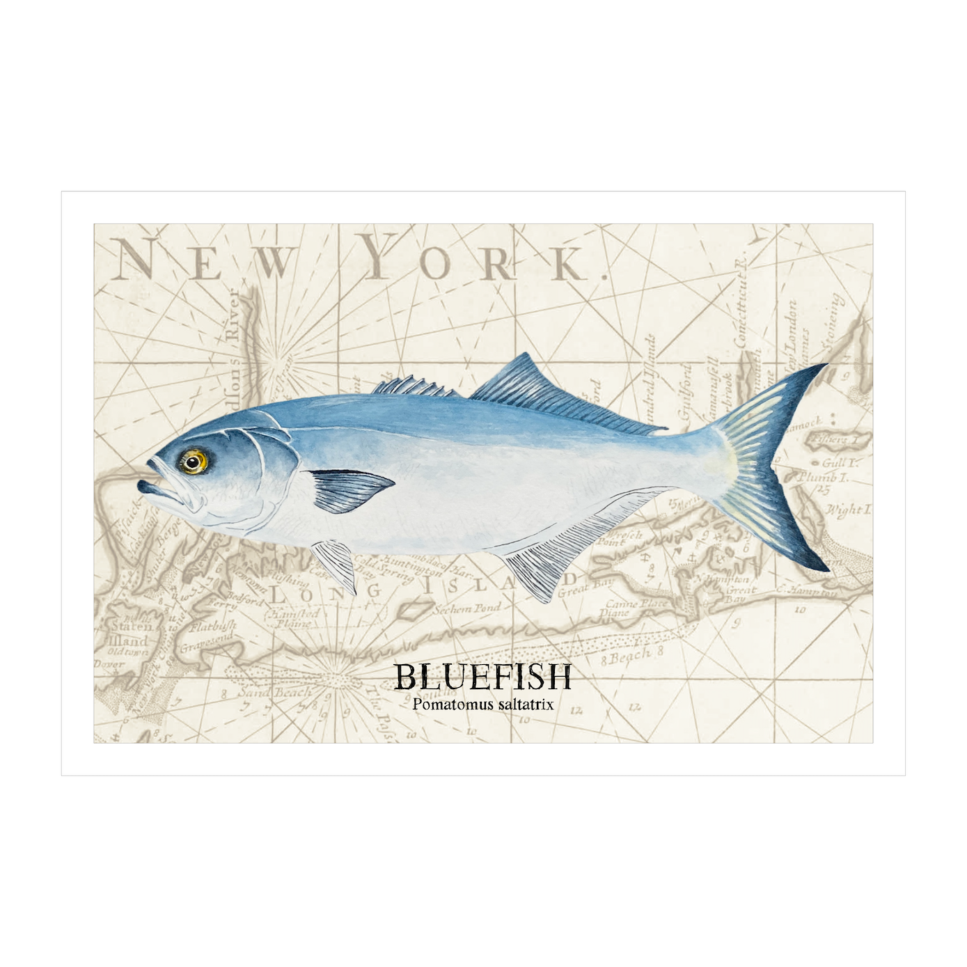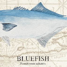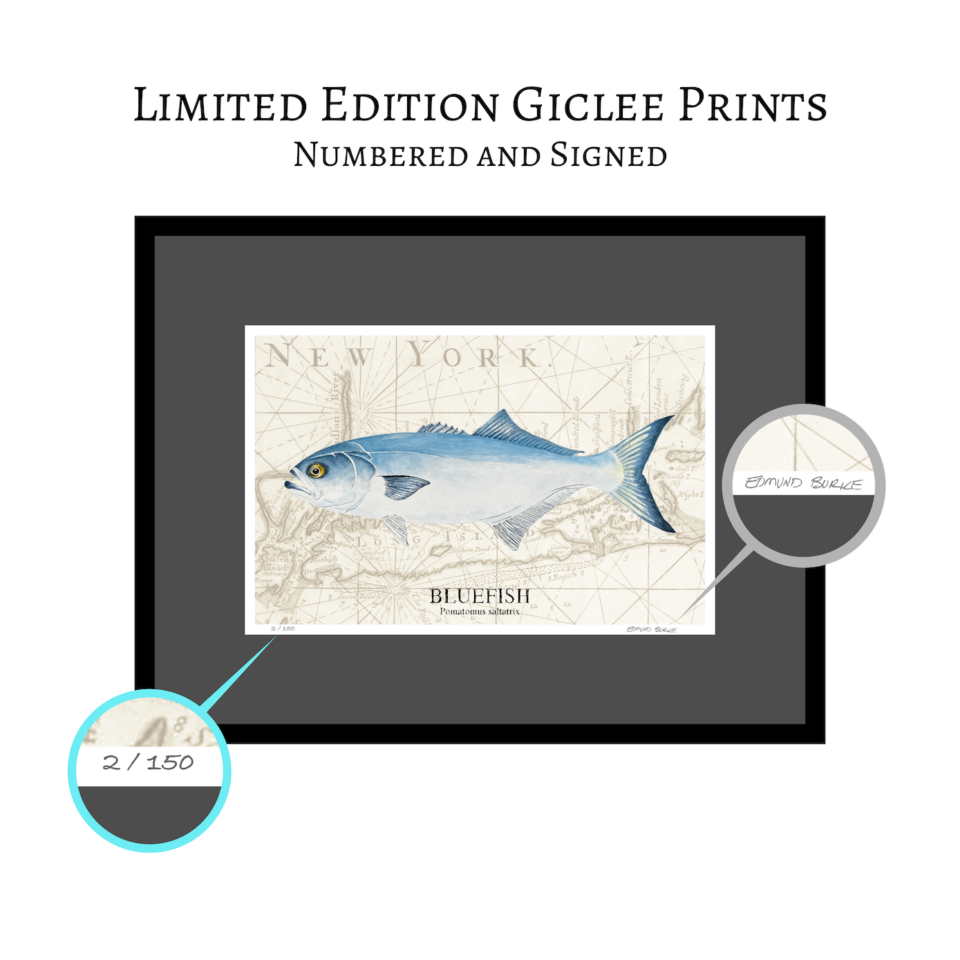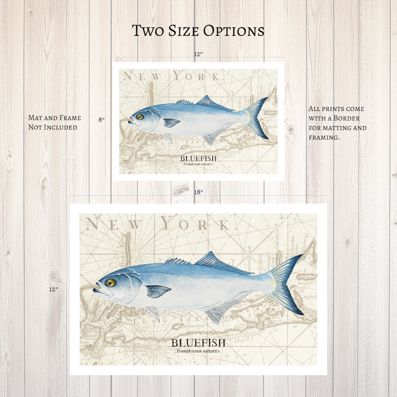 Each print is created from my original watercolor painting, professionally reproduced on archival, acid-free paper to ensure vivid color and long-lasting quality. The layered effect of the bluefish against the vintage map background gives the piece both artistry and a sense of place, celebrating Long Island’s fishing heritage.