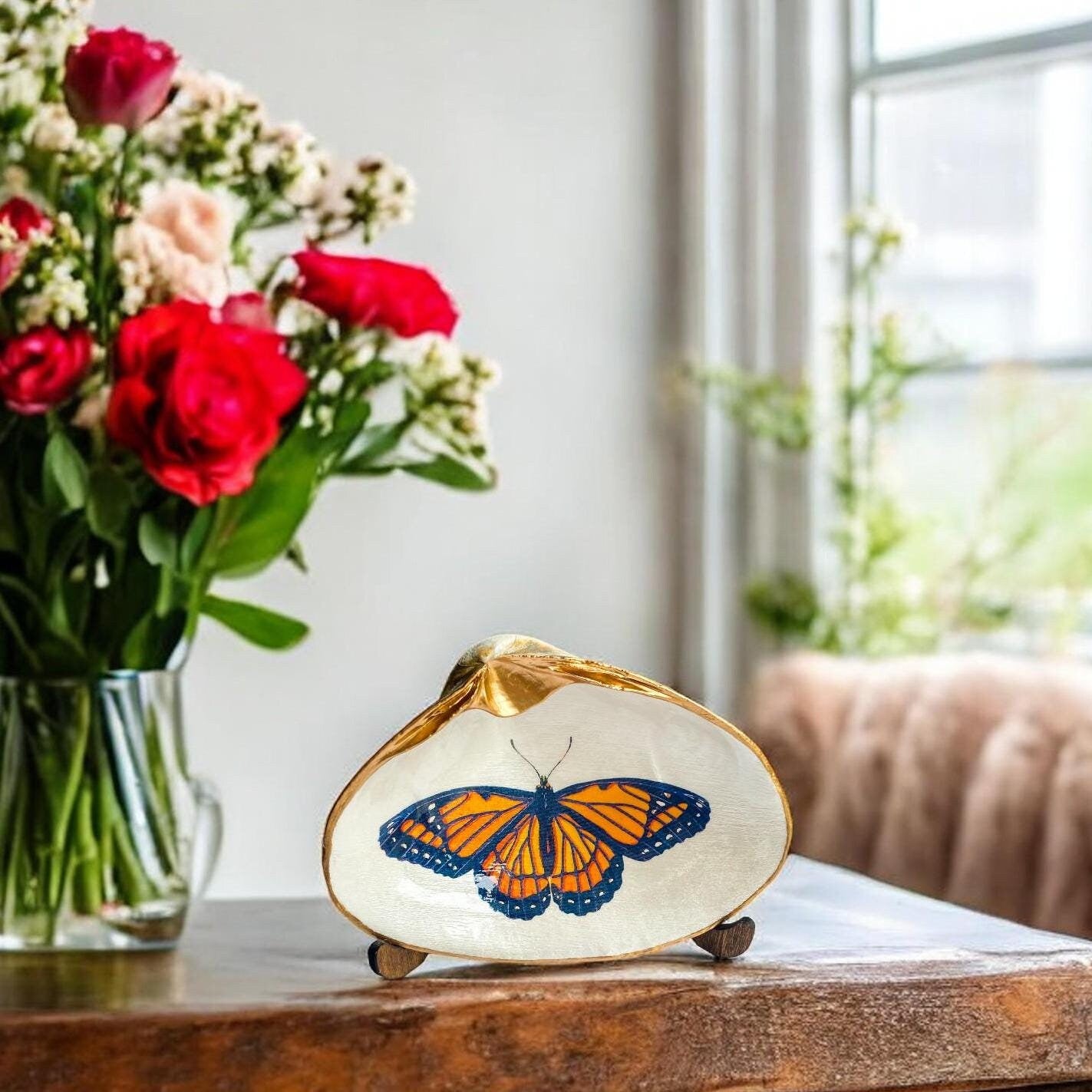 Decoupage Clam Shell Trinket Dish Monarch Butterfly Art