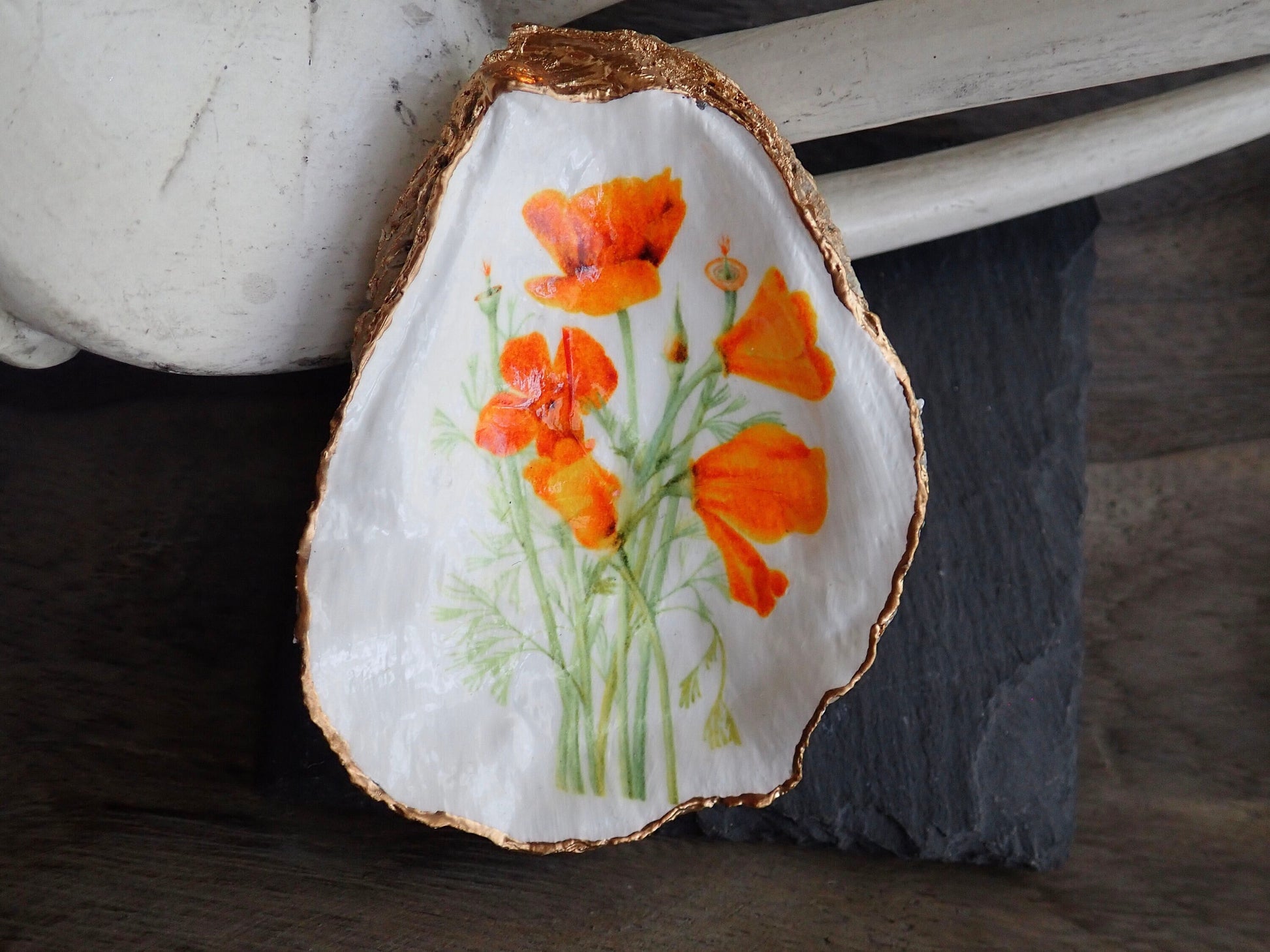 Decoupage Oyster Shell Trinket Dish California Poppy Flower Art