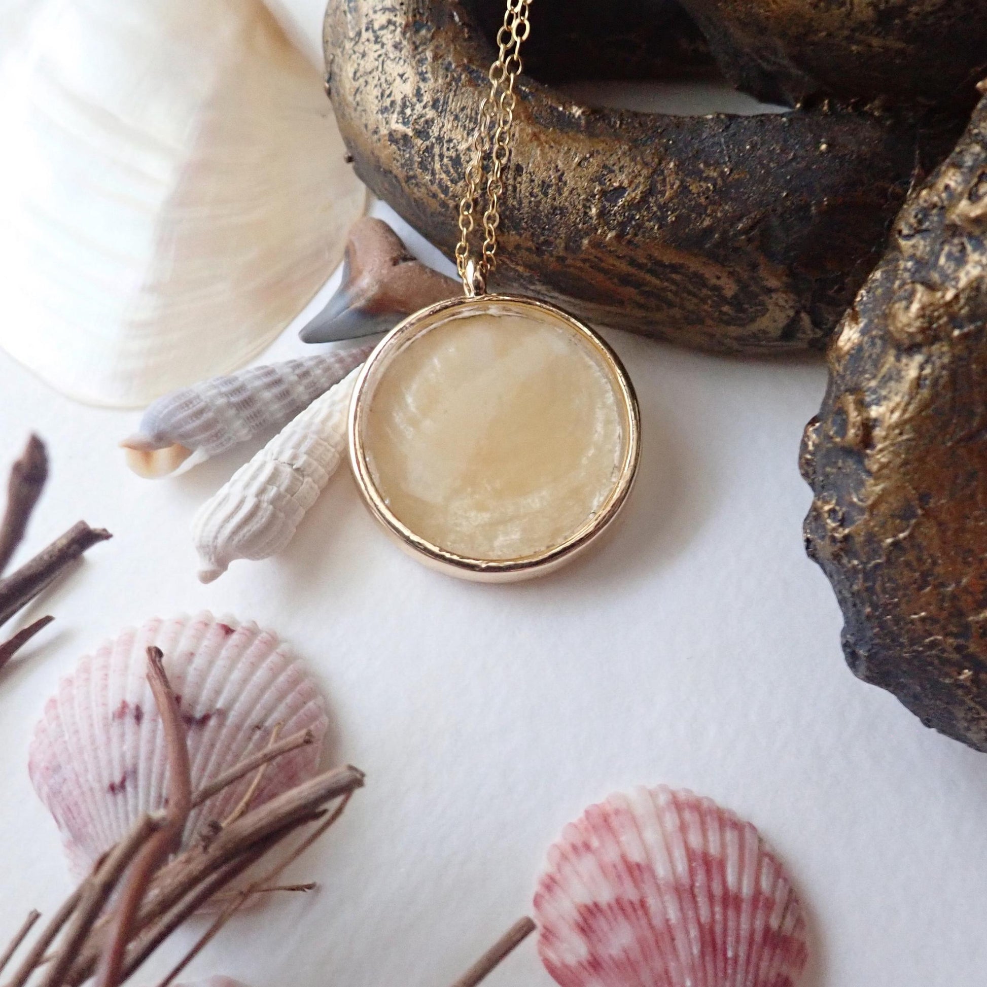Beautiful genuine Capiz, also known as Jingle Shells collected off the beautiful beaches of the Gulf Coast of Florida. We shape these to fit inside a gold plated bezel and encase it in a thick layer of resin. Would make an amazing and thoughtful gift for anyone who shares our fascination with the ocean and its creatures.