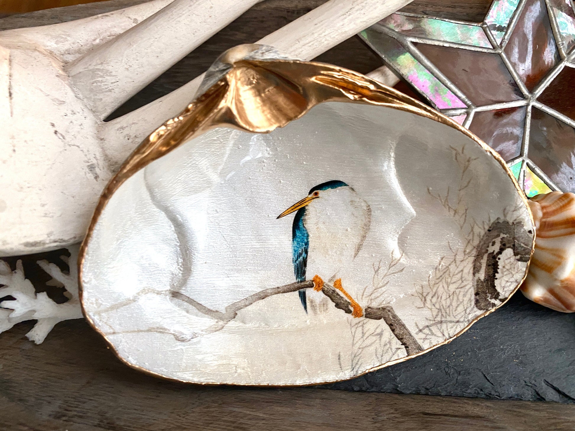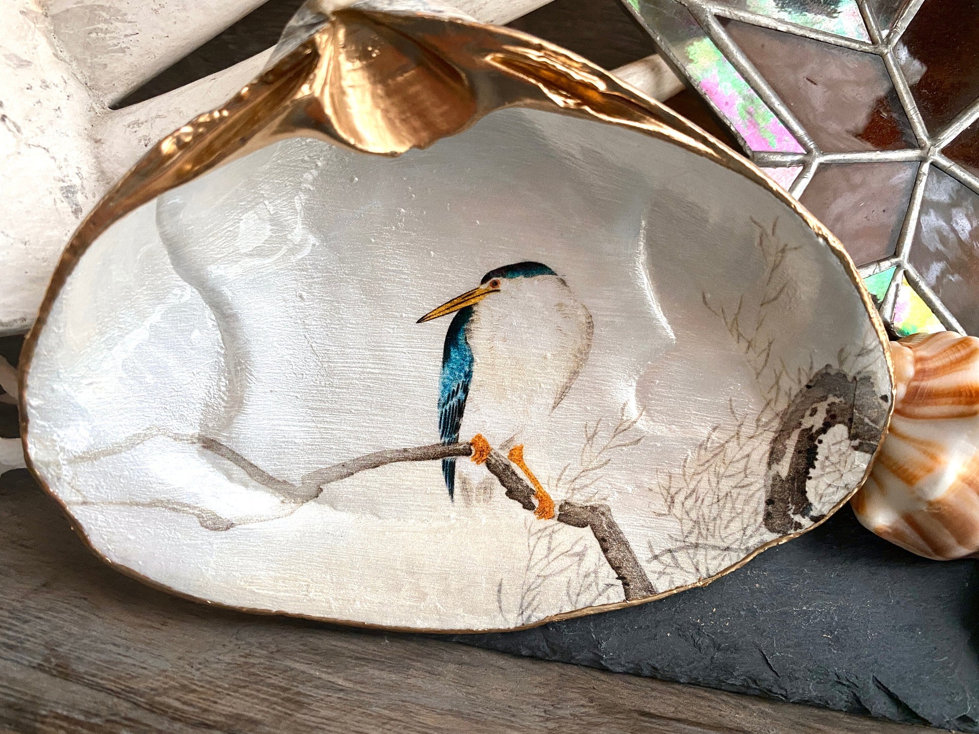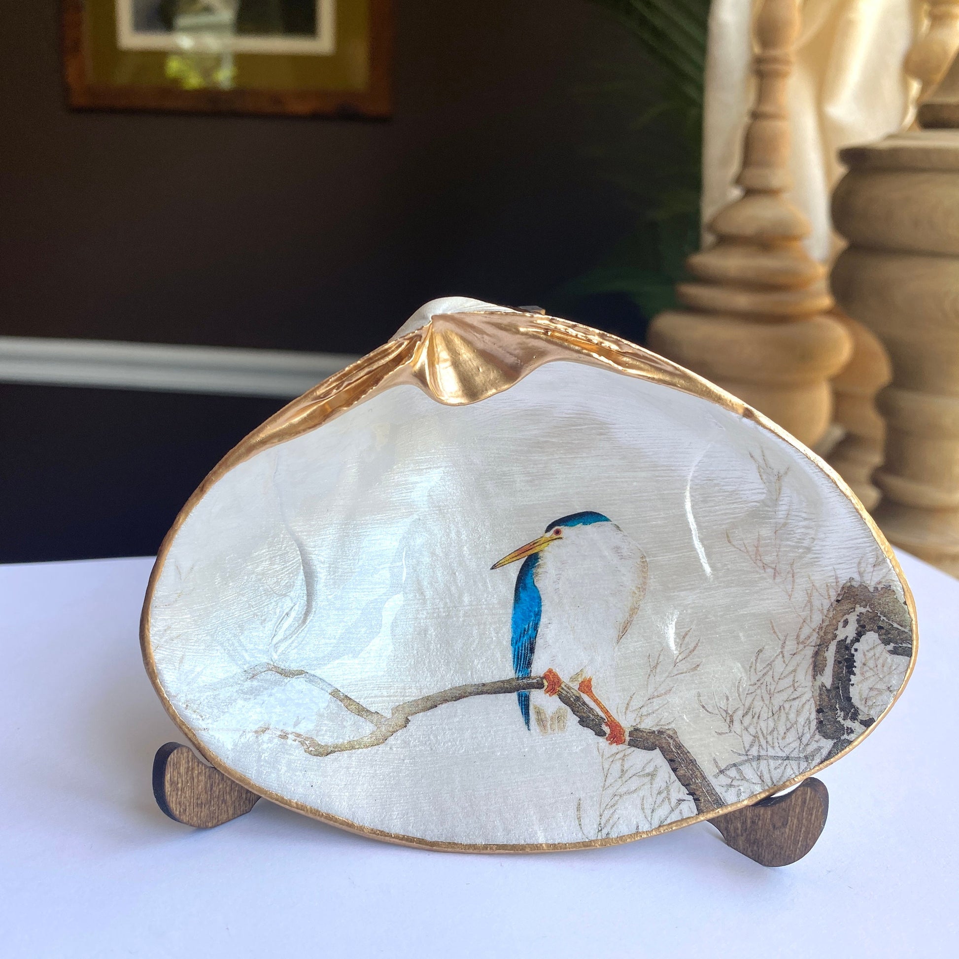 Decoupage Clam Shell Dish Night Heron Bird Art