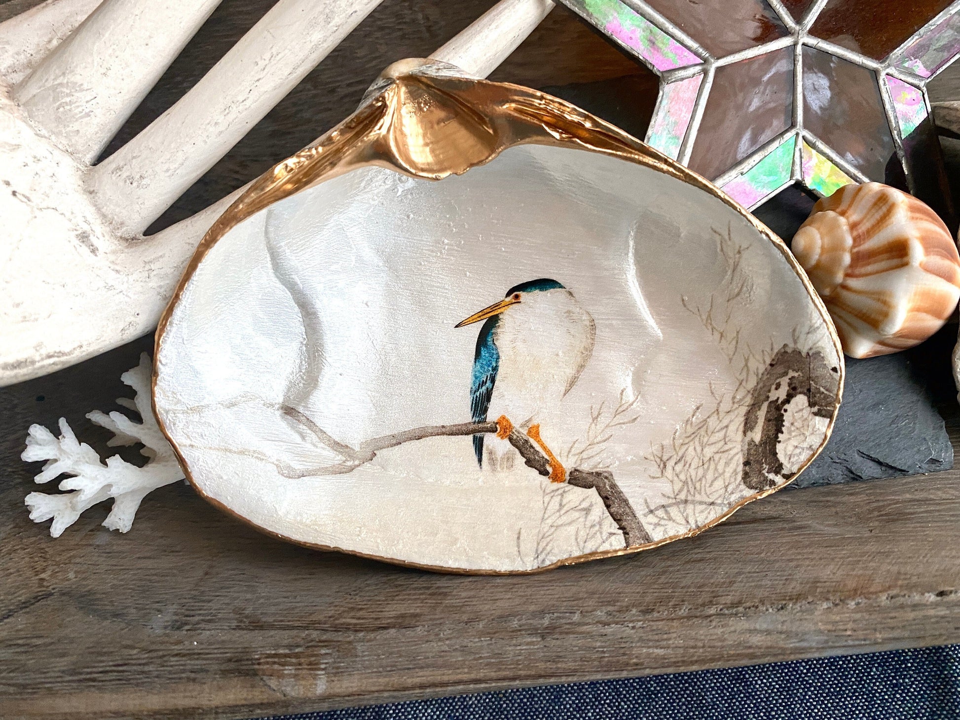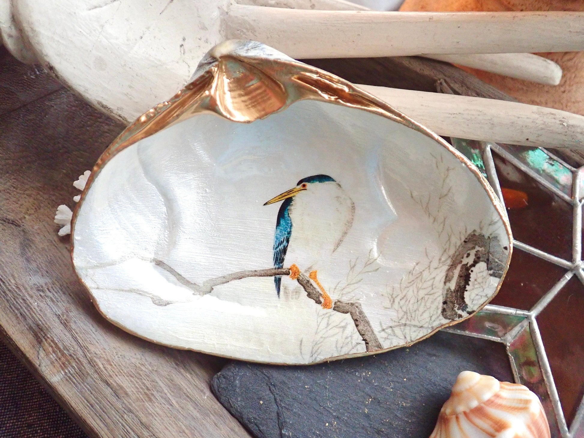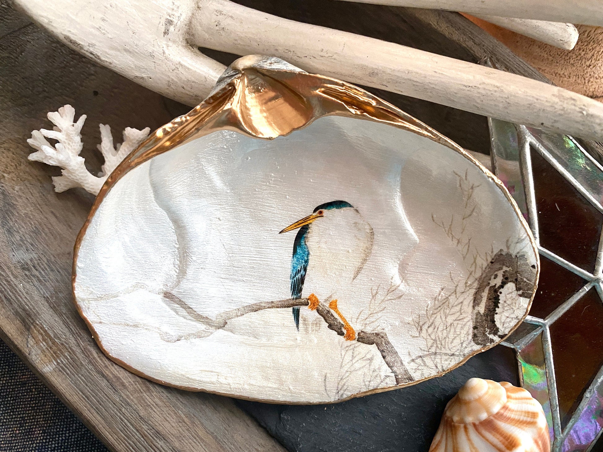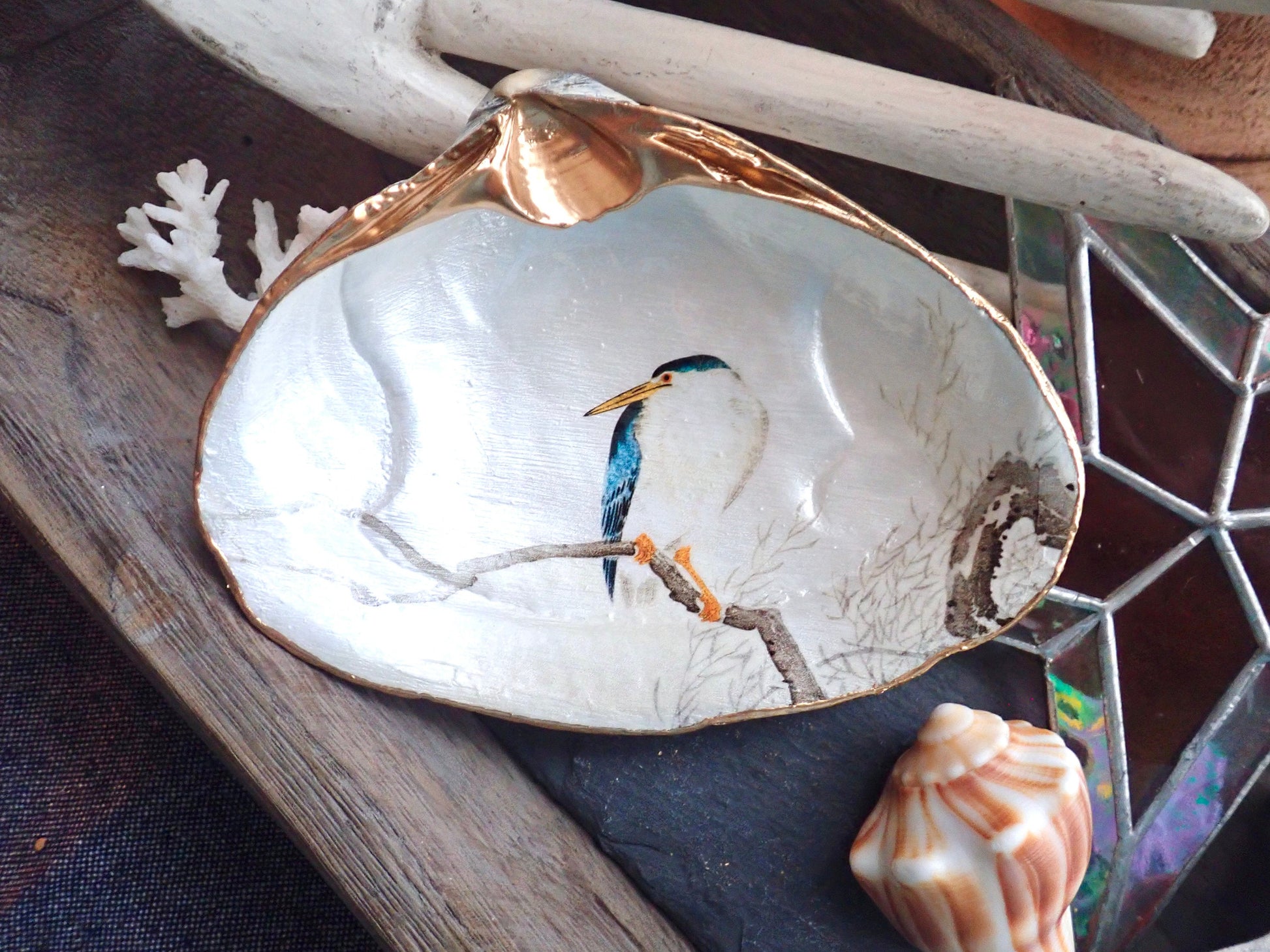 Decoupage Clam Shell Dish Night Heron Bird Art