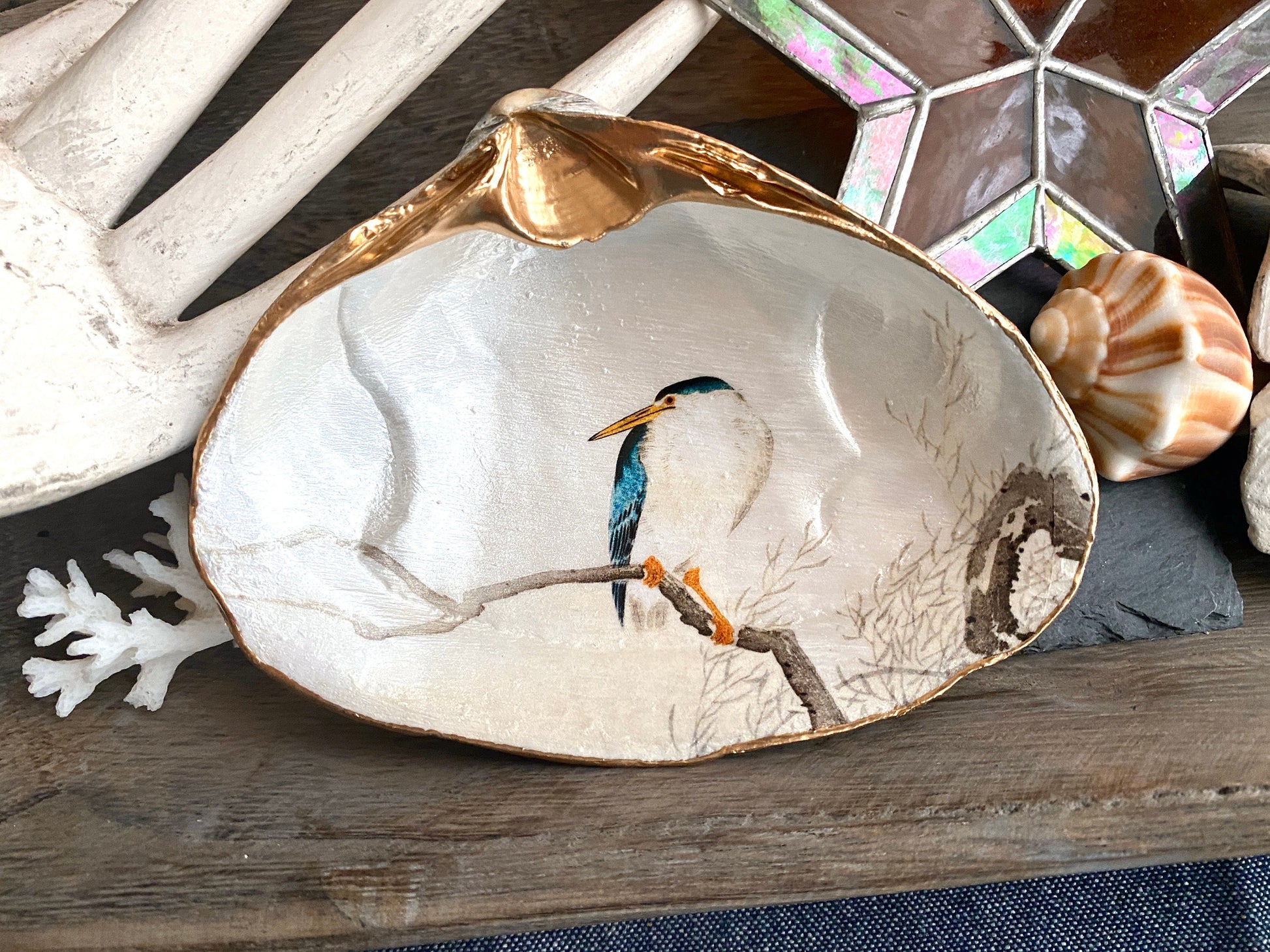 These decoupaged shells are hand-crafted with a fine level of detail. Images are carefully set on a base of white or pearl paint and sealed with multiple layers of lacquer to give a refined porcelain feel and look to them. A delicate edging of liquid gold leaf gives the finishing touch. Shell backs are left in their beautiful and natural state. Â These shells are thoroughly cleaned with soap and water - no harsh chemicals used.