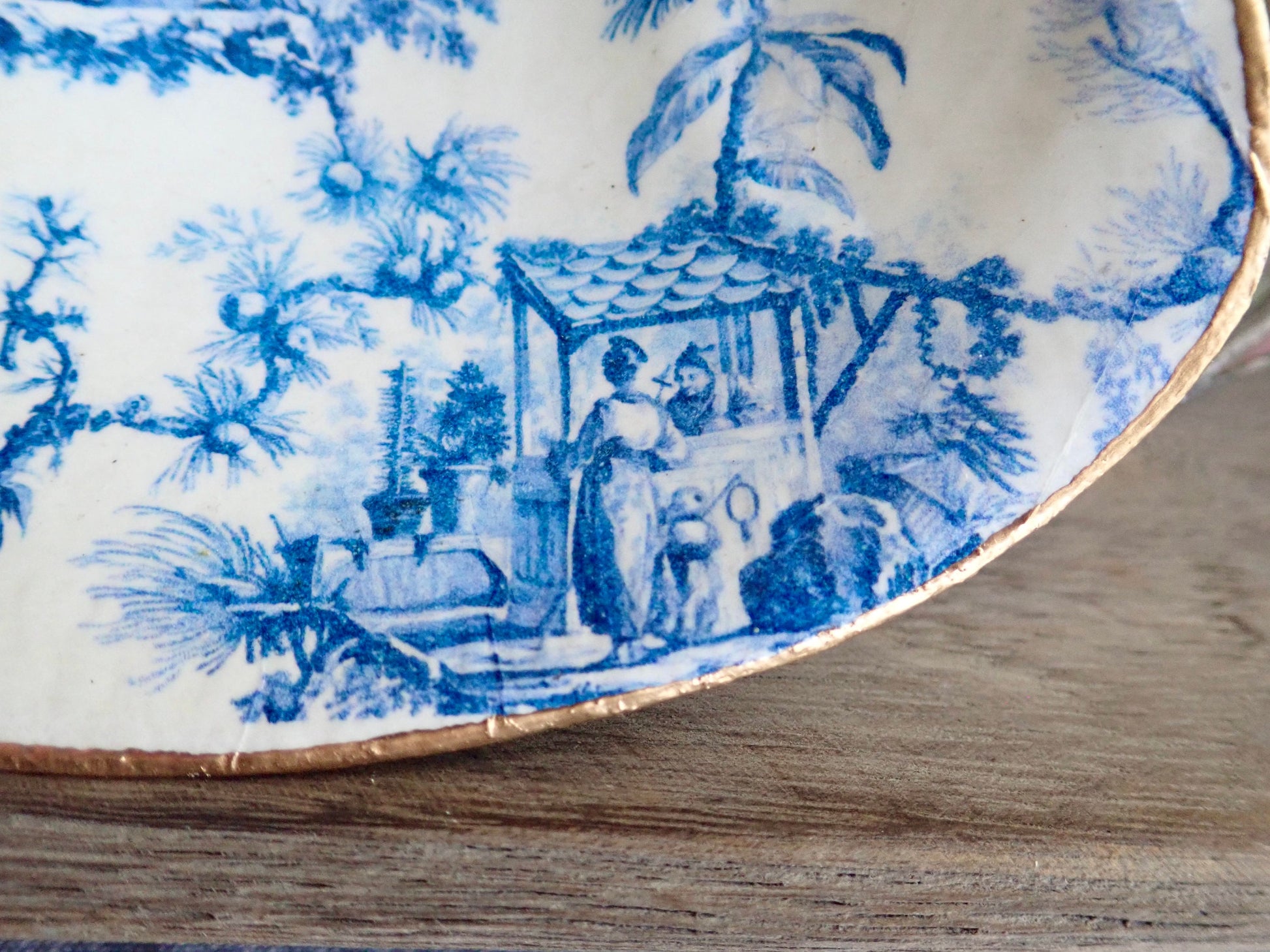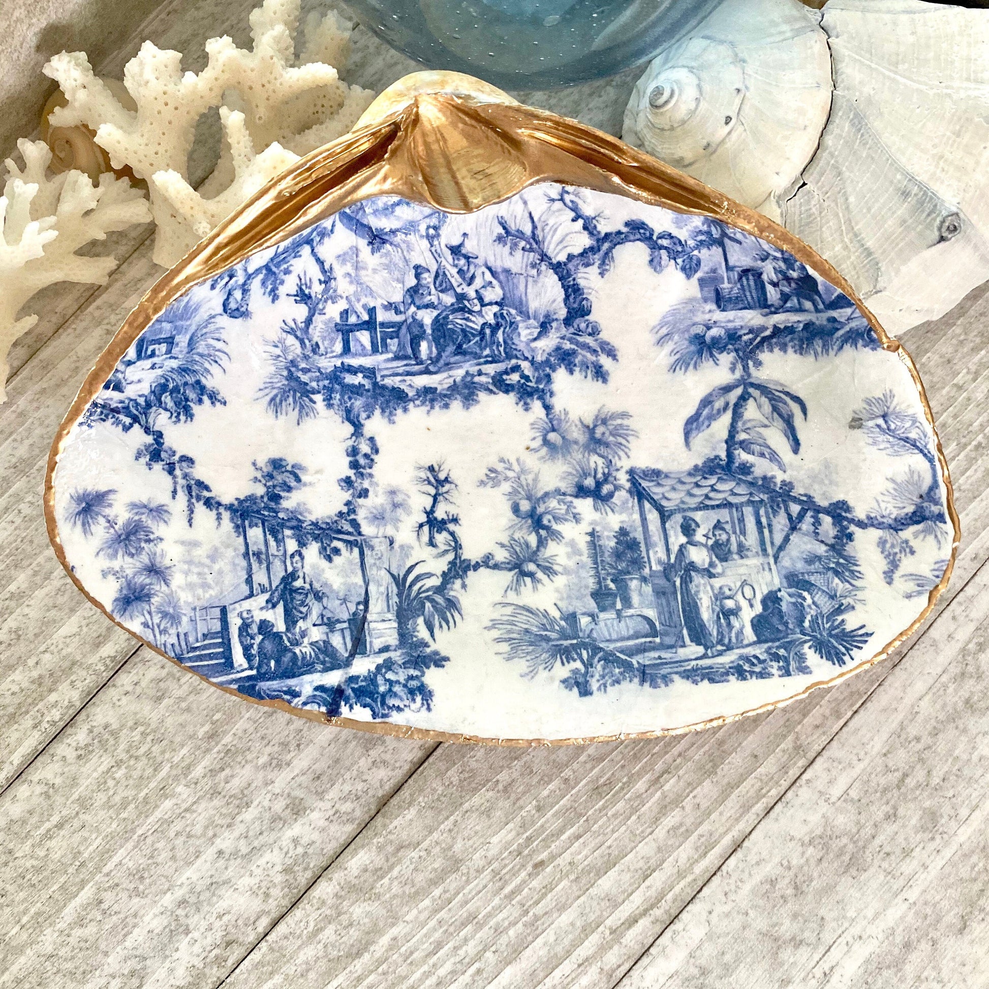 Blue & White Decoupage Clam Shell Trinket Dish Chinoiserie Art
