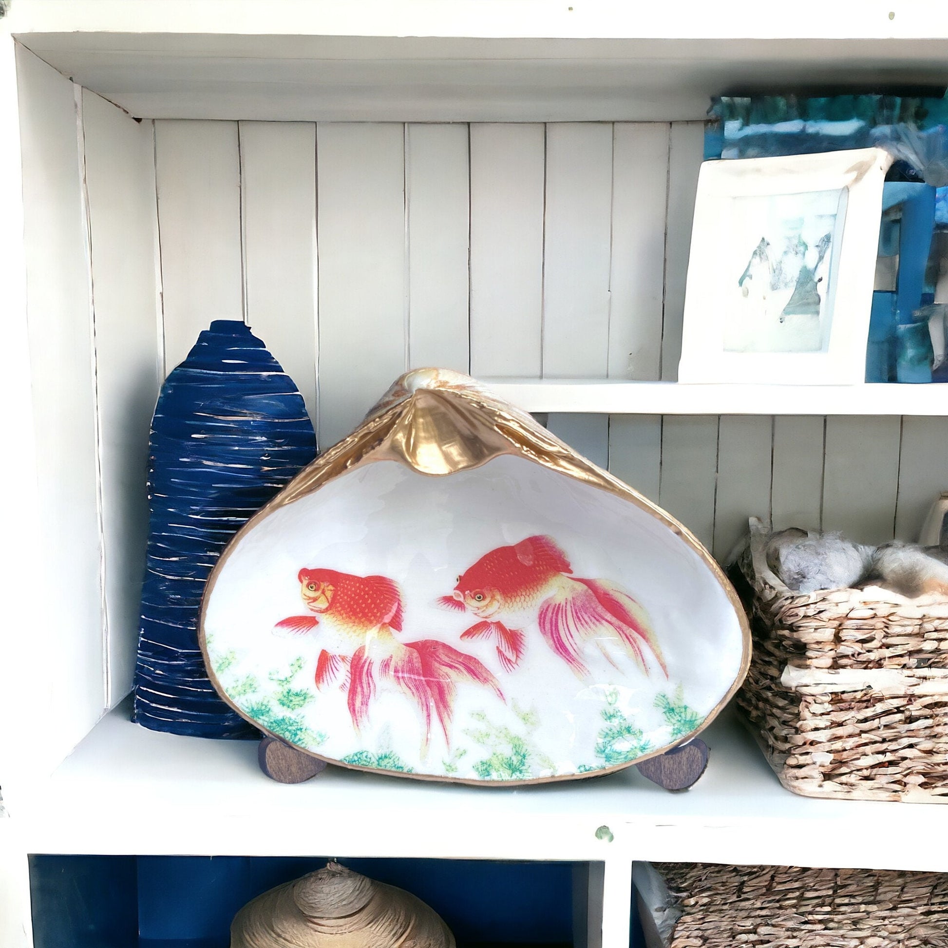 A beautifully crafted decoupage clam shell featuring the work of Japanese printmaker Ohara Koson. He is widely known for his bird and flower prints but occasionally he would choose other themes from nature like we have here. Goldfish were first brought to Japan in 1502 by Chinese traders and they were sold to samurai and nobility as highly prized pets. In China, they had come to symbolize good luck and good fortune and this association continued in Japan where they served as a symbol of wealth, fortune, and good luck.