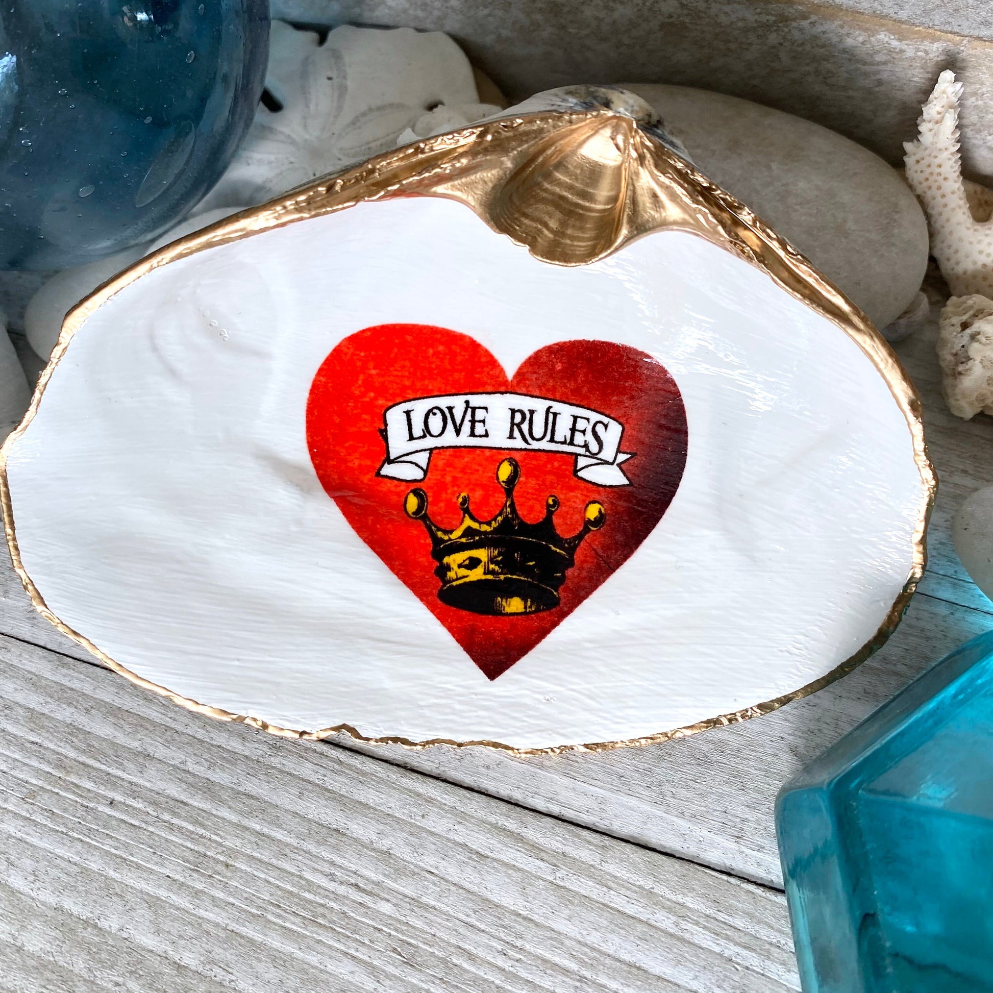 Decoupage Clam Shell Trinket Dish, "Love Rules" Valentine's Day Gift