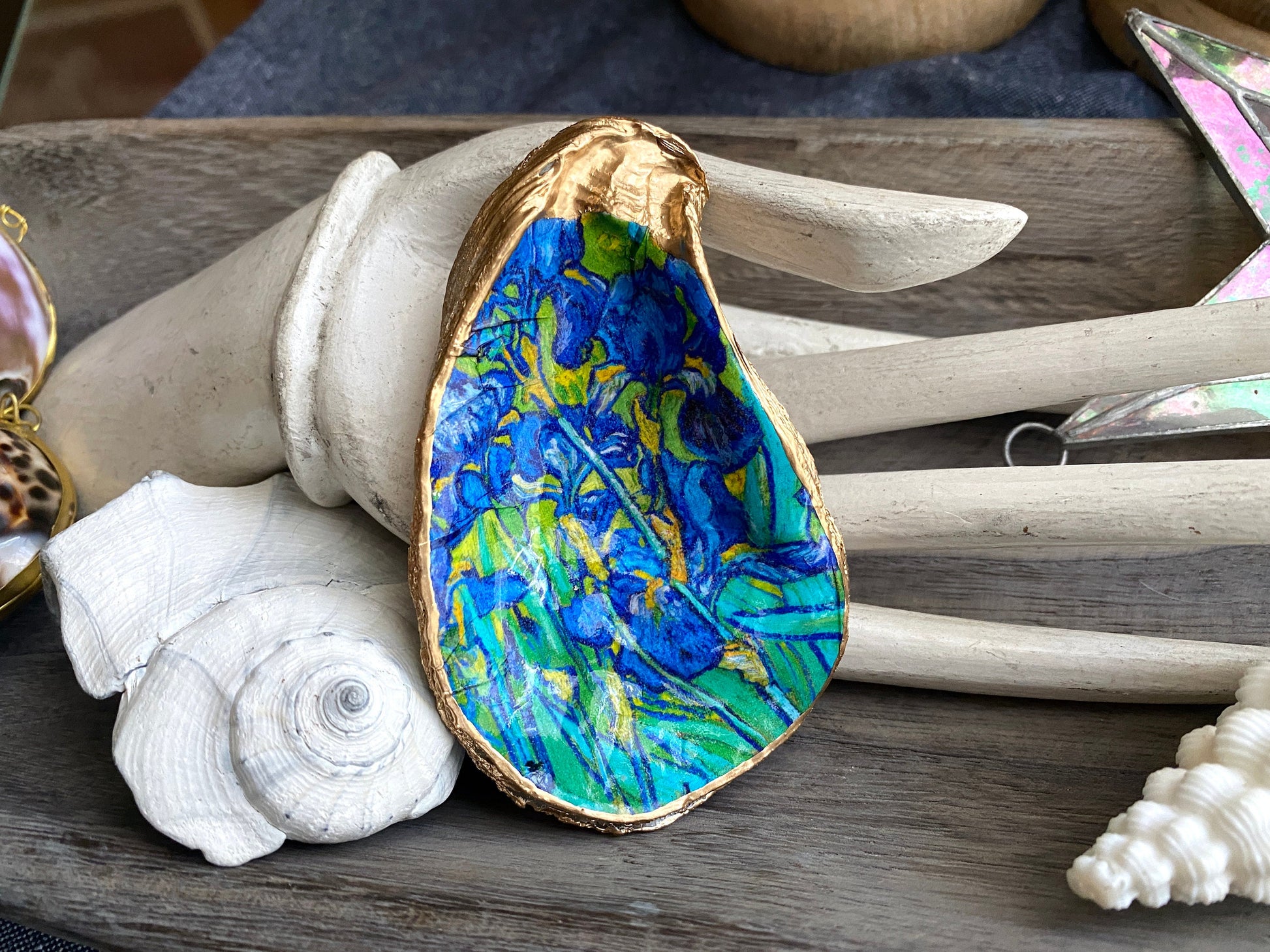 Decoupage Oyster Shell Ring Dish – Van Gogh-Inspired Painted Shell, Coastal Decor