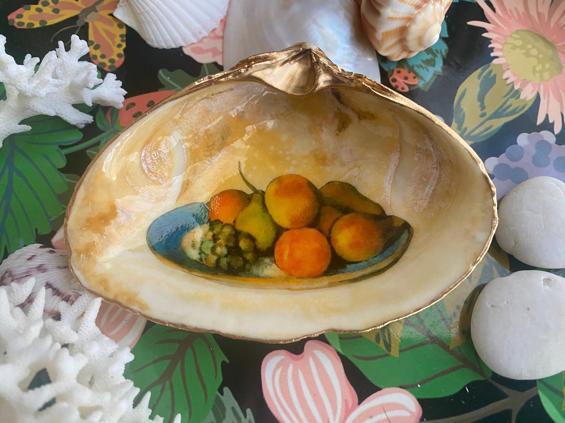 These decoupaged shells are hand-crafted with a fine level of detail. Images are carefully set on a base of white or pearl paint and sealed with multiple layers of lacquer to give a refined porcelain feel and look to them. A delicate edging of liquid gold leaf gives the finishing touch. Shell backs are left in their beautiful and natural state. These shells are thoroughly cleaned with soap and water - no harsh chemicals used.