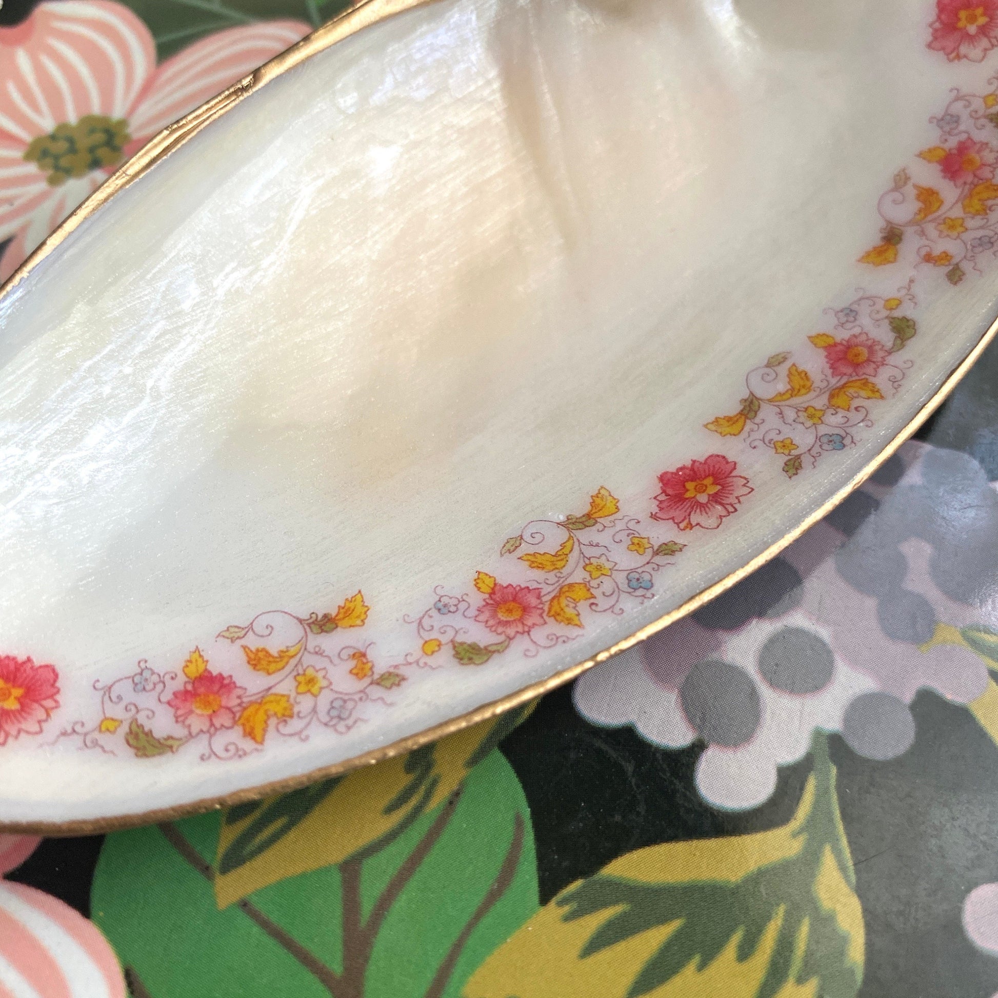A delicate clam shell from Florida's Gulf Coast adorned with a lovely antique china floral pattern, sealed in a high gloss finish, and edged with a fine rim of liquid gold leaf. An elegant trinket dish. Perfect for gifting for bridesmaids, housewarming, or any occasion.