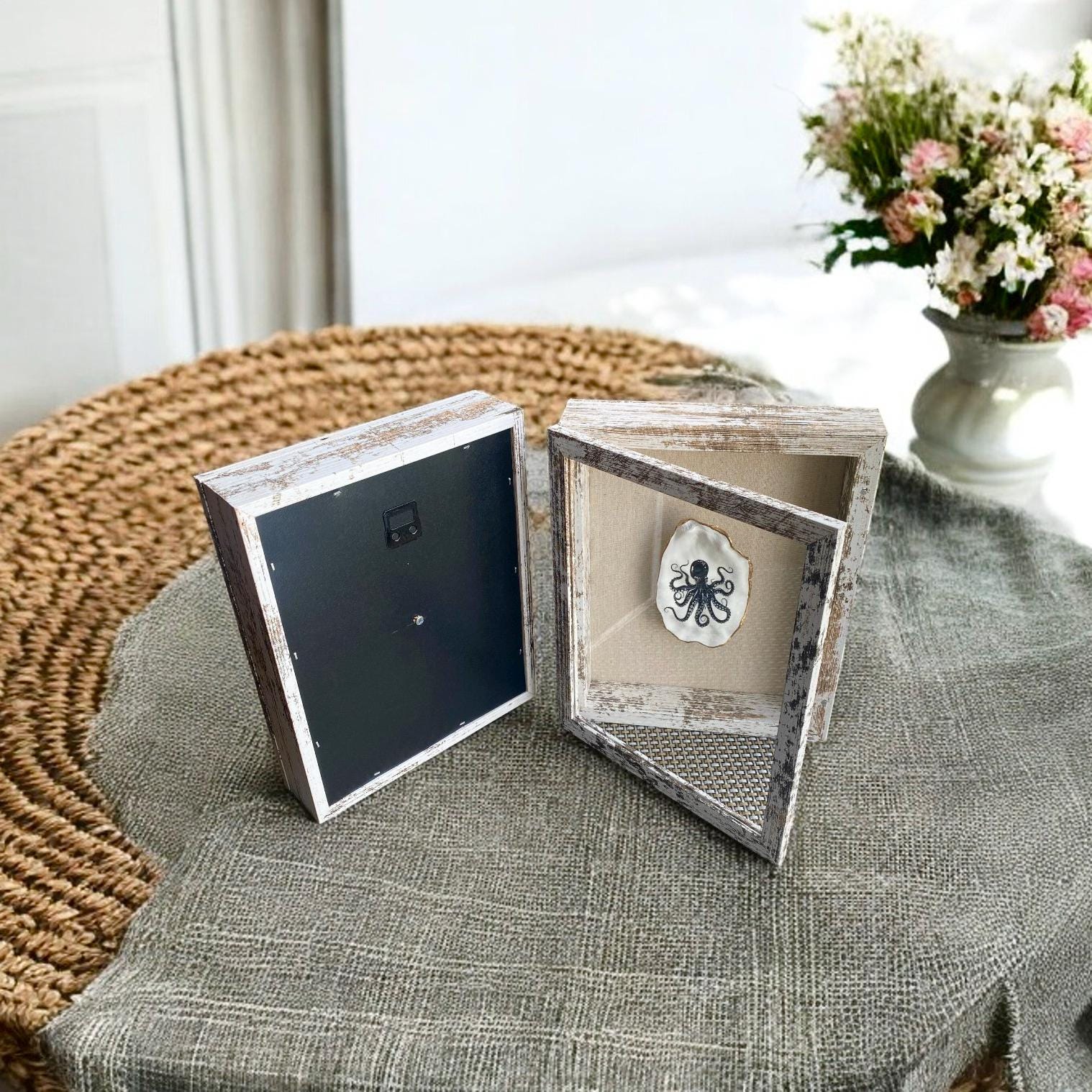Beautiful illustrations of octopi in black & white decoupaged on an ethically sourced oyster shell, delicately gilded with gold leaf paint and presented on a linen backing in a distressed wood shadow box. These make for perfect additions to your beach house decor. Each box is 8" wide by 10" tall and features magnetic closures to keep the door tightly shut. Notched hooks are installed on the backs for easy hanging. Boxes are deep enough for standing upright on their own for displaying on a shelf or desk. Great for gifting for anniversaries, birthdays, housewarming, or any occasion.