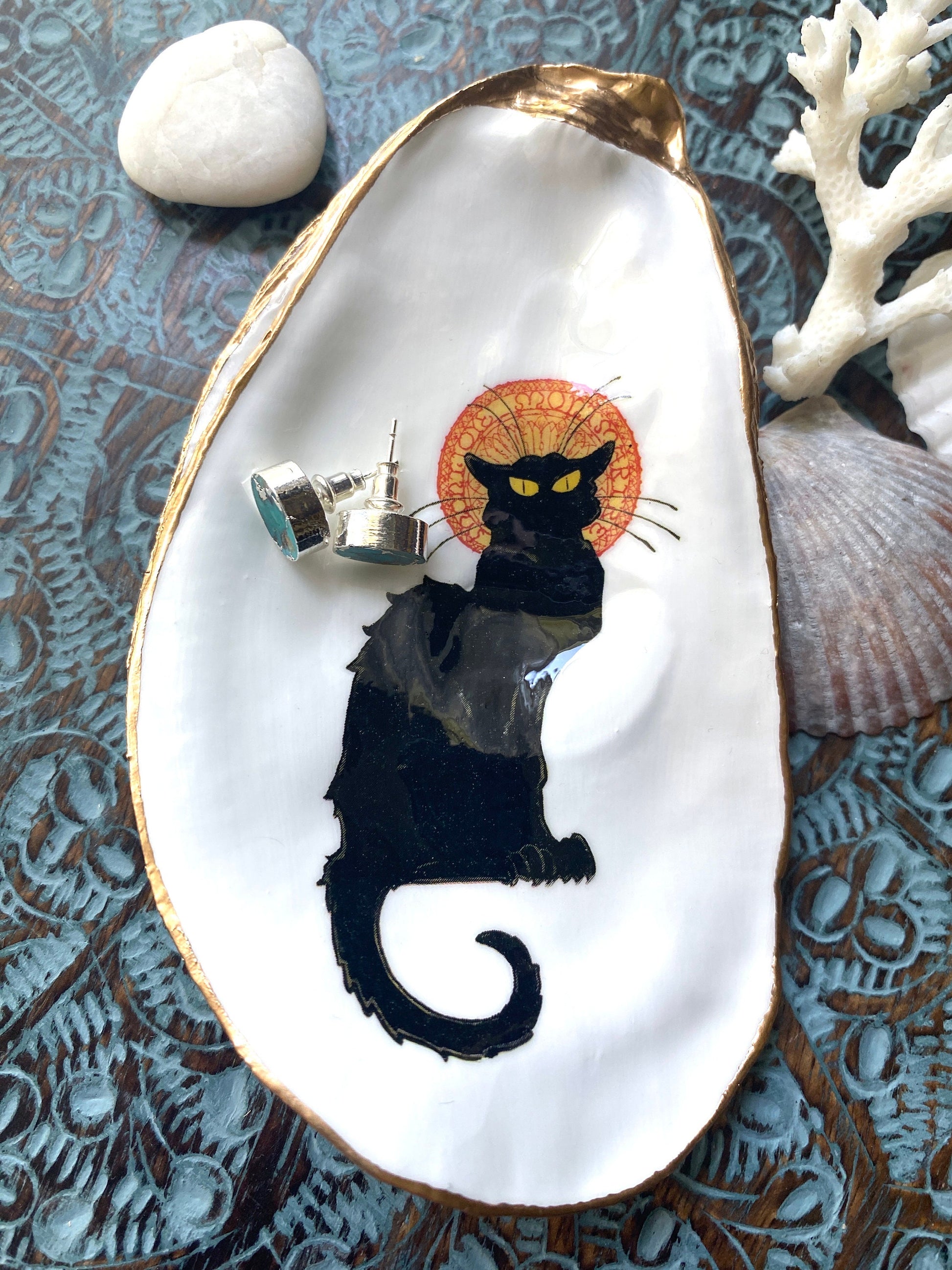 The beautiful and classic Art Nouveau Black Cat finds a new life in this large gilded oyster shell. A perfect home for trinkets and rings or as a lovely home accent.