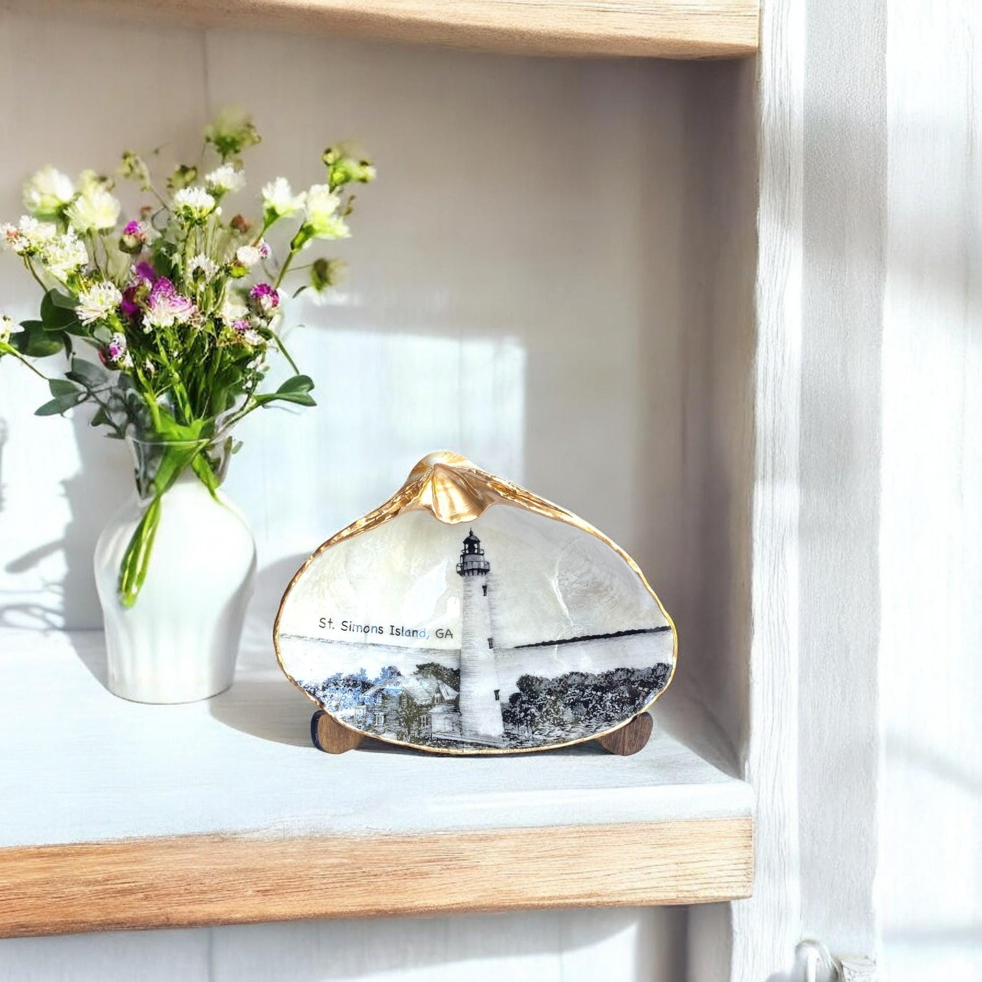 Decoupage Clam Shell Trinket Dish St. Simons Lighthouse Art