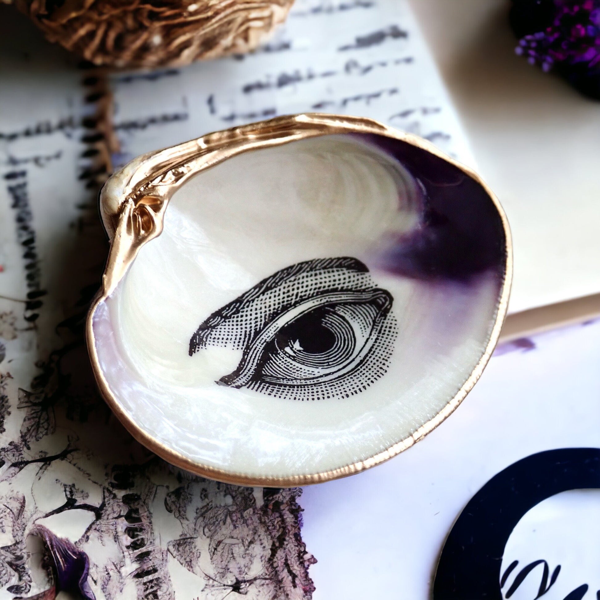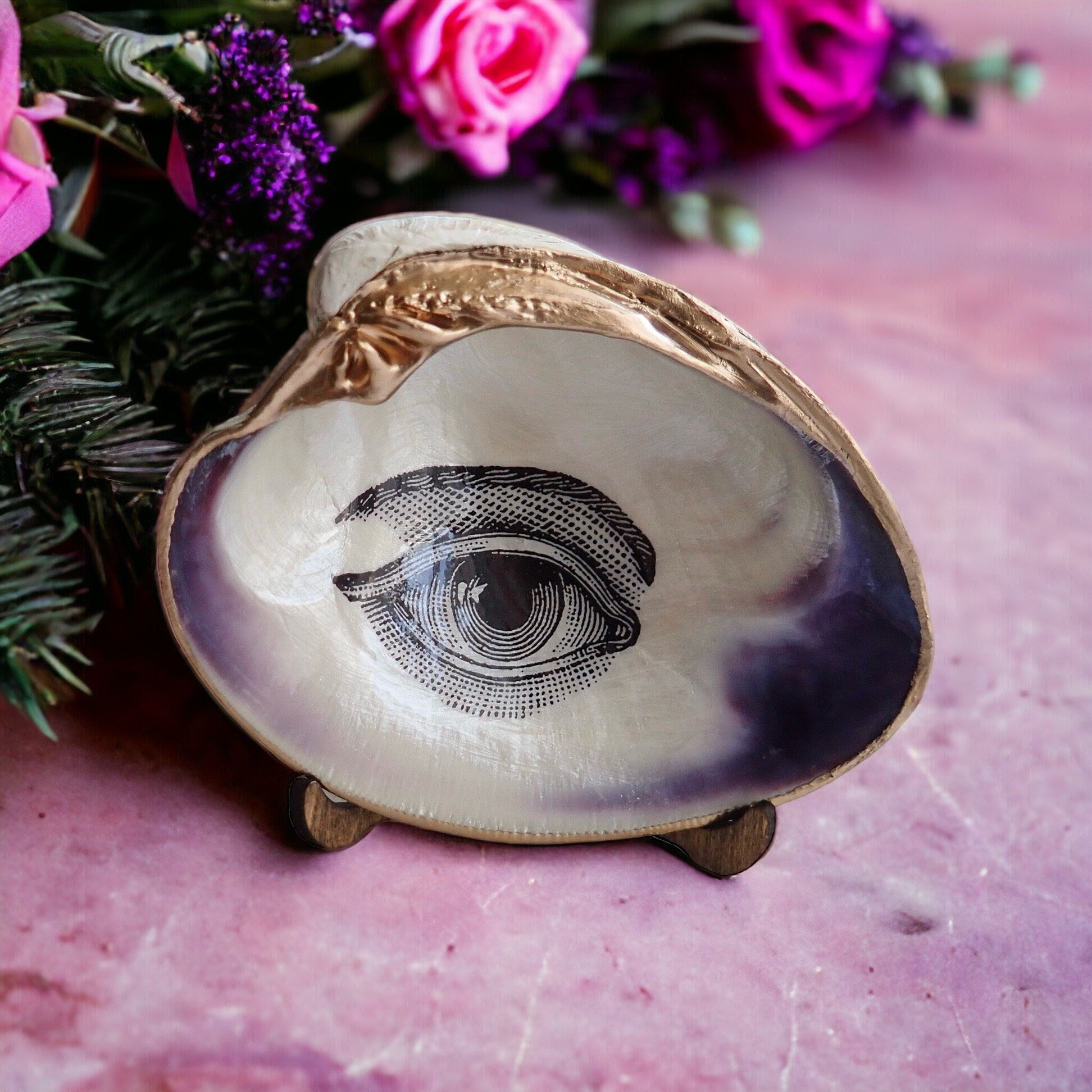 🐚 This piece is a part of our Legends & Lore series of decoupage wampum shells. The All-Seeing Eye, or Eye of Providence, is an ancient symbol that transcends any one religion. It is evidenced in Ancient Egyptian Lore as well as Hinduism and Christianity. It is a symbol of good luck, prosperity, and protection.