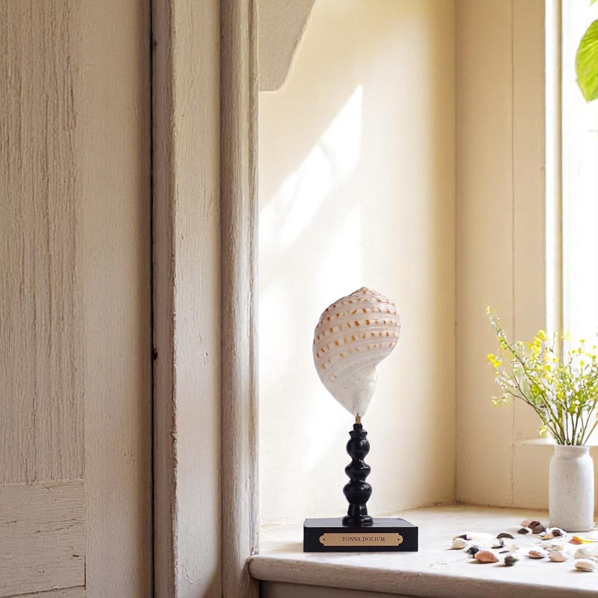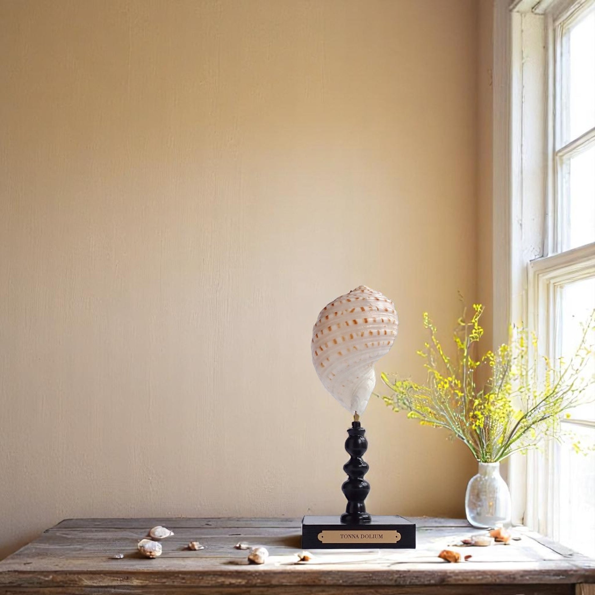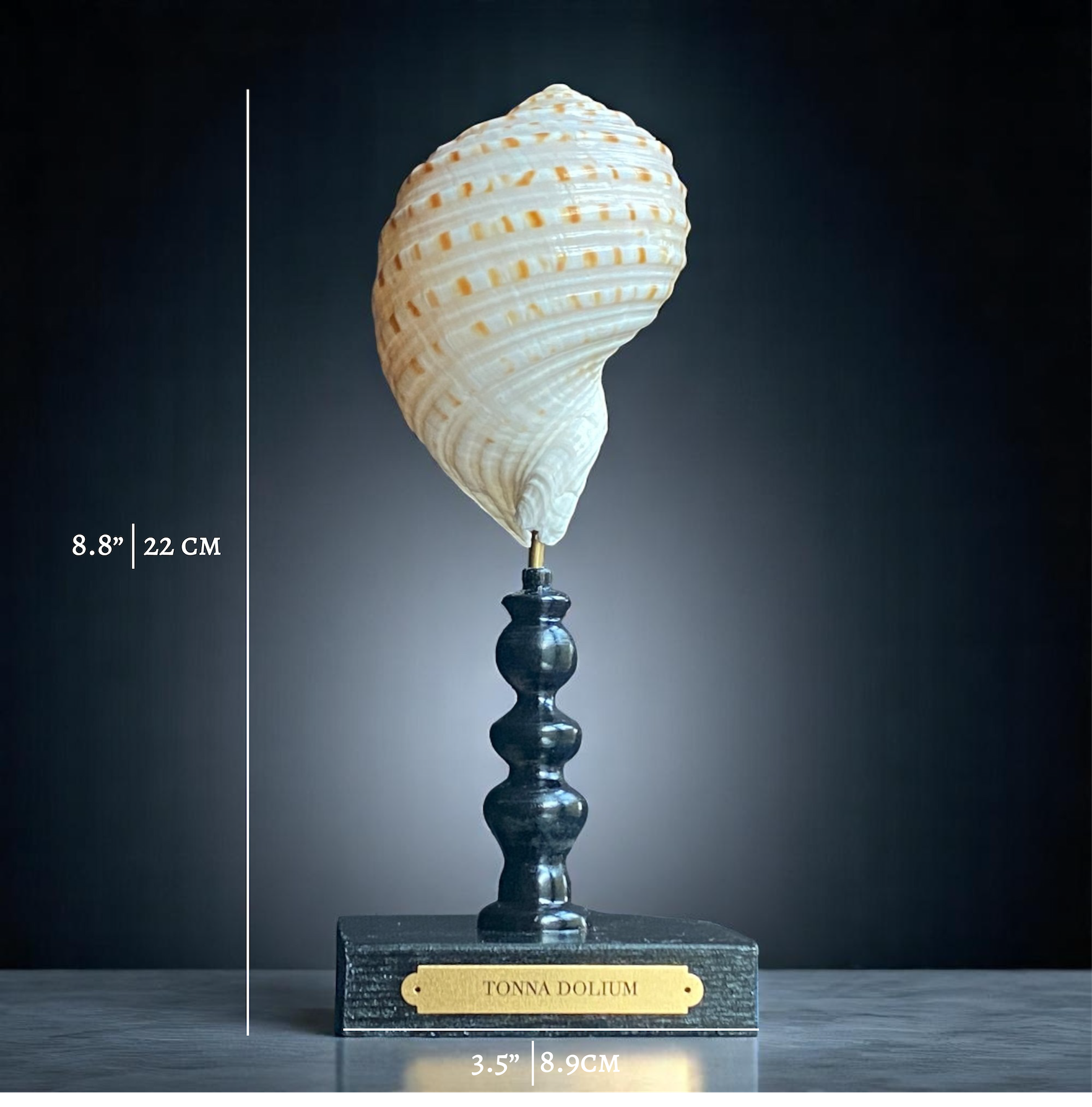 The Tonna dolium's large size, intricate ribbing, and vibrant coloration make it a prized specimen among shell collectors and marine decor enthusiasts. When mounted on a glossy black stand with a brass plaque, it serves as an elegant centerpiece, showcasing the natural beauty of marine life.