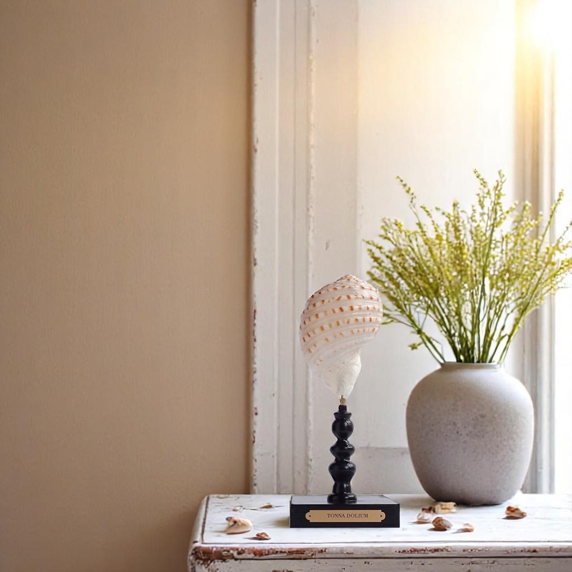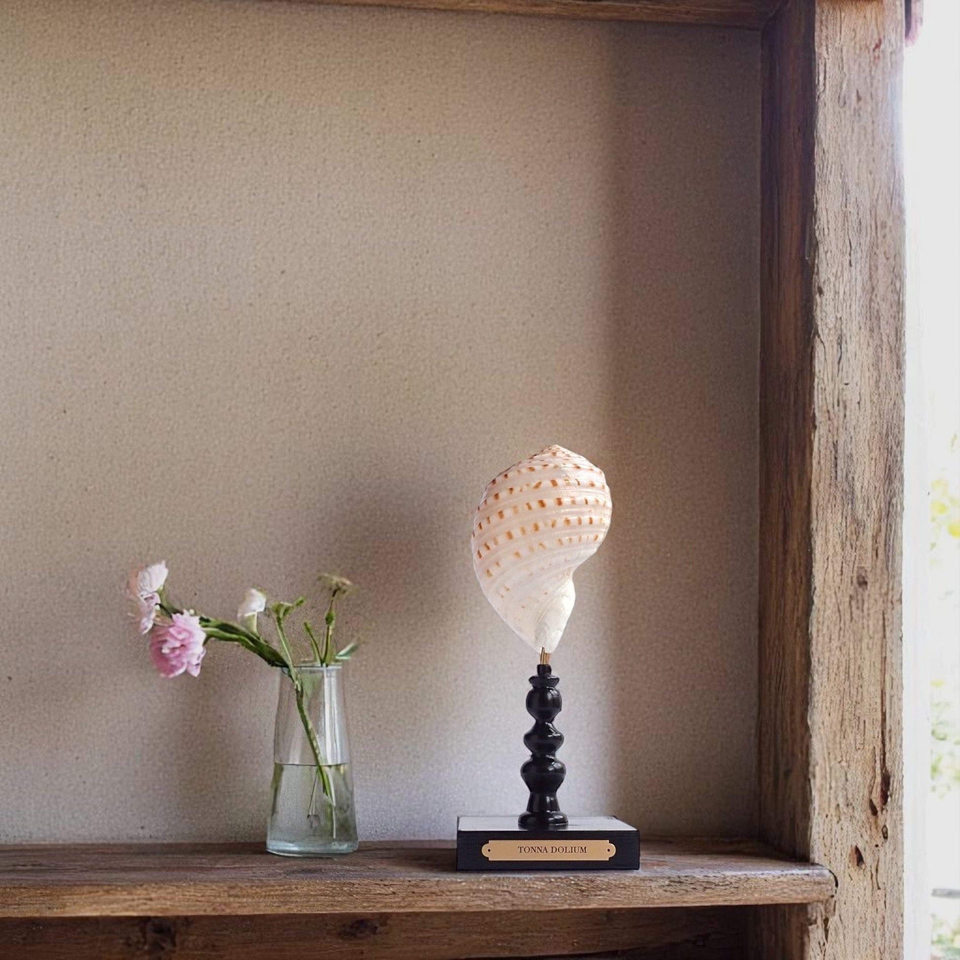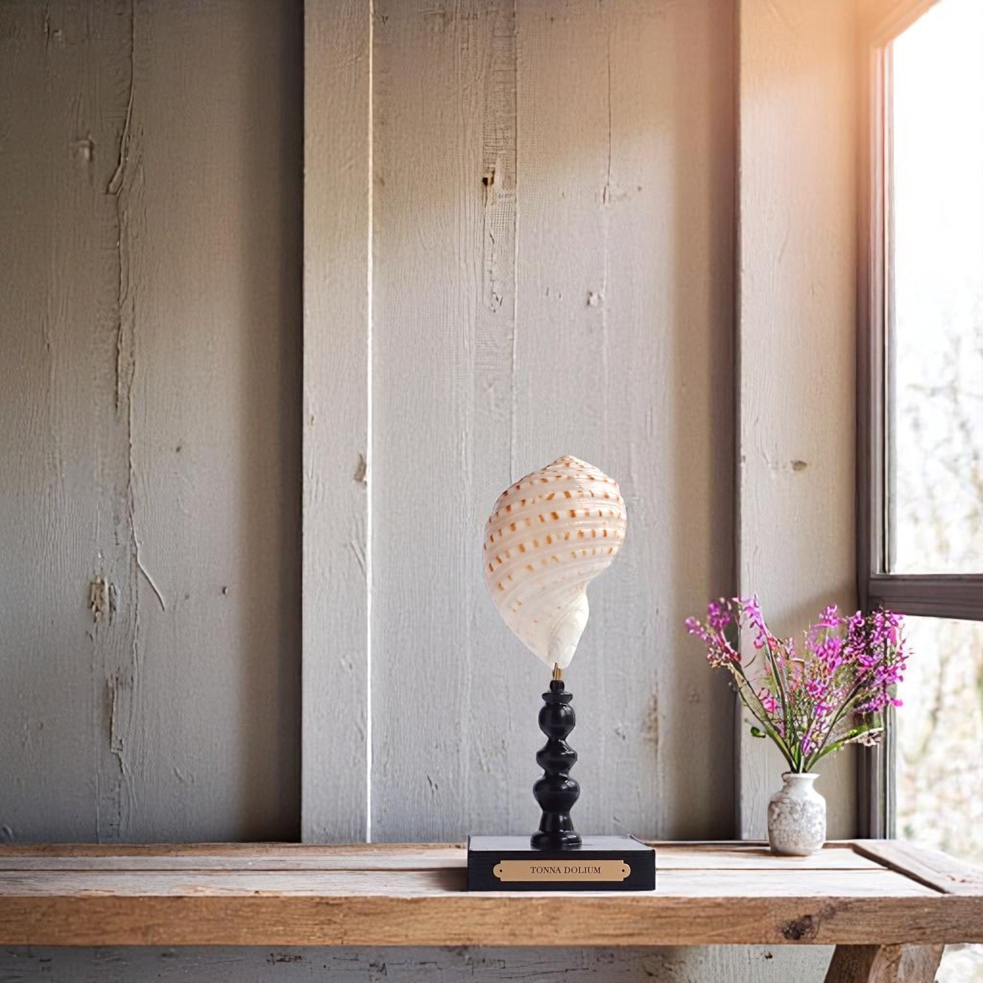 The Tonna dolium's large size, intricate ribbing, and vibrant coloration make it a prized specimen among shell collectors and marine decor enthusiasts. When mounted on a glossy black stand with a brass plaque, it serves as an elegant centerpiece, showcasing the natural beauty of marine life.