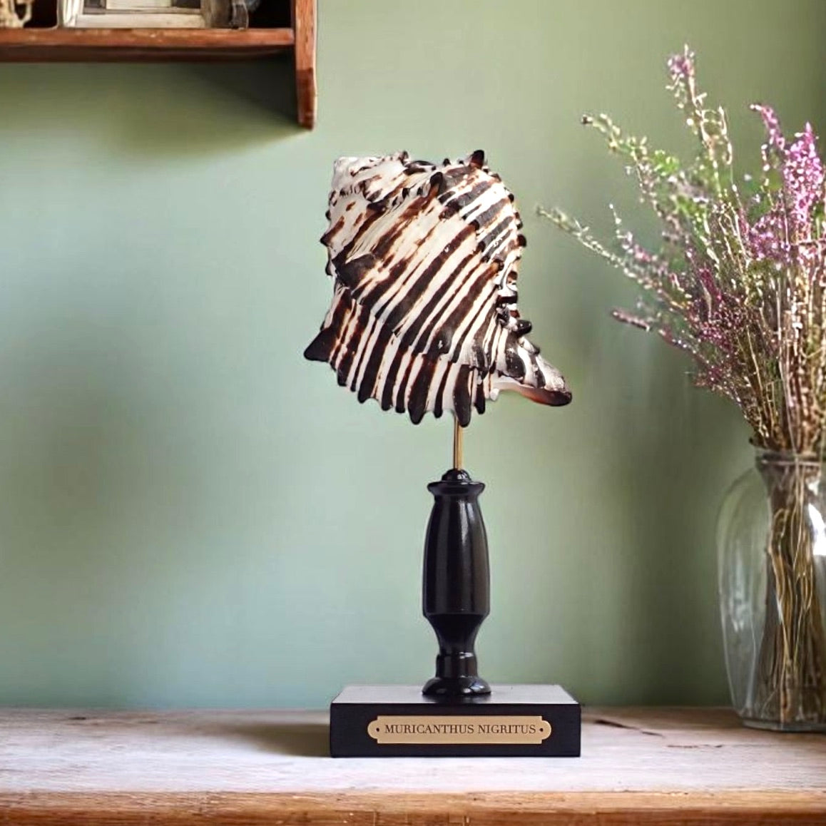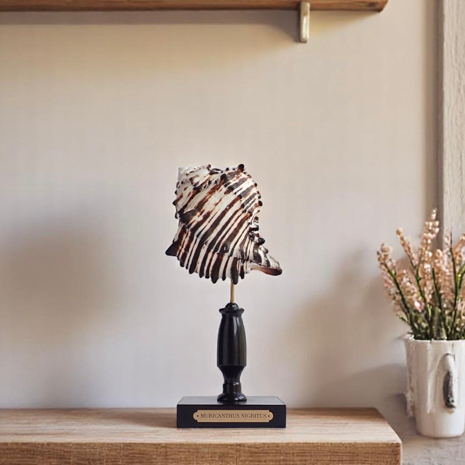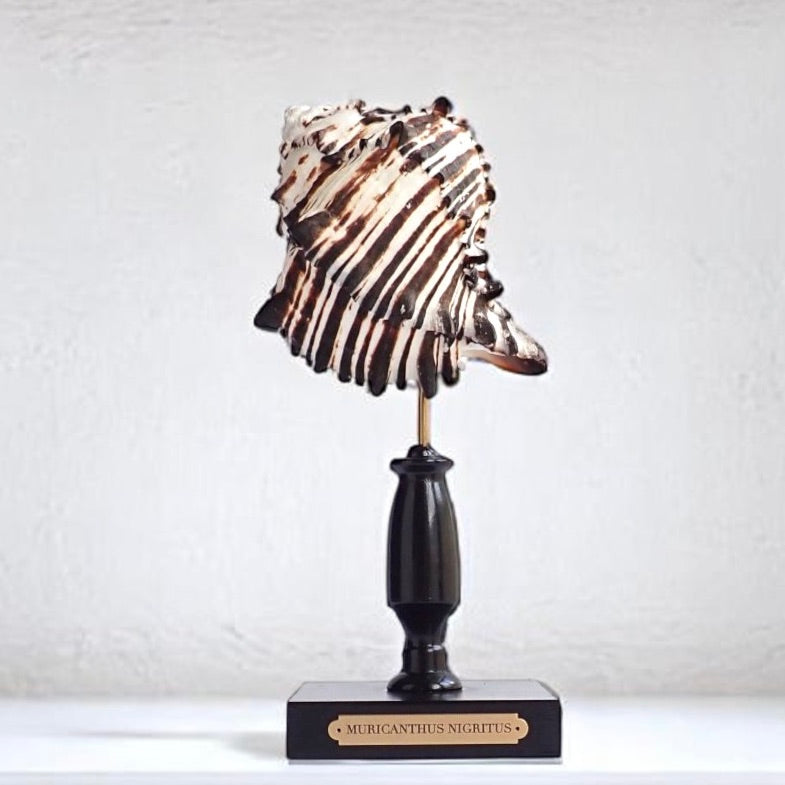 The Black Murex's coloration and spiny texture make it a standout display piece and when mounted on a glossy black stand with a brass plaque, it serves as an elegant centerpiece, showcasing the natural beauty of marine life.