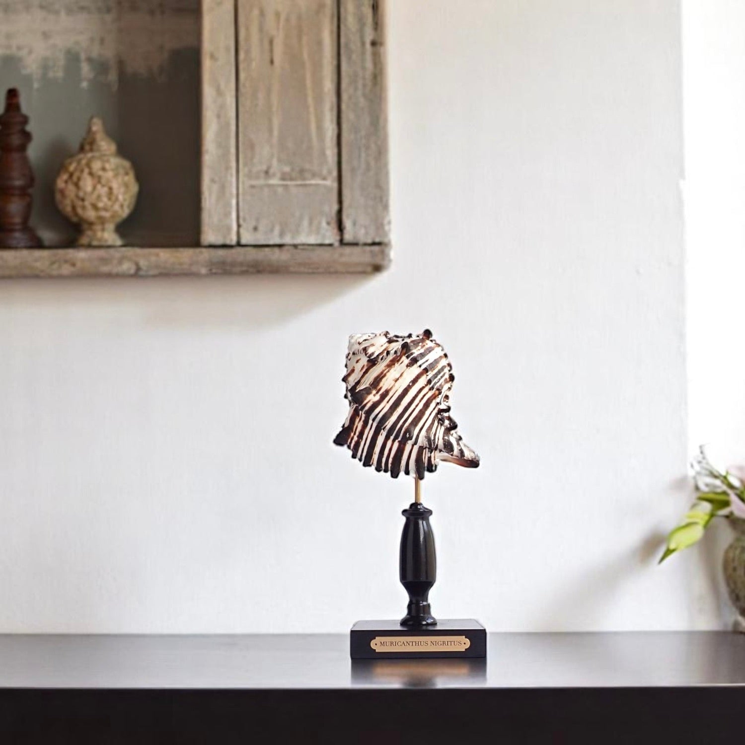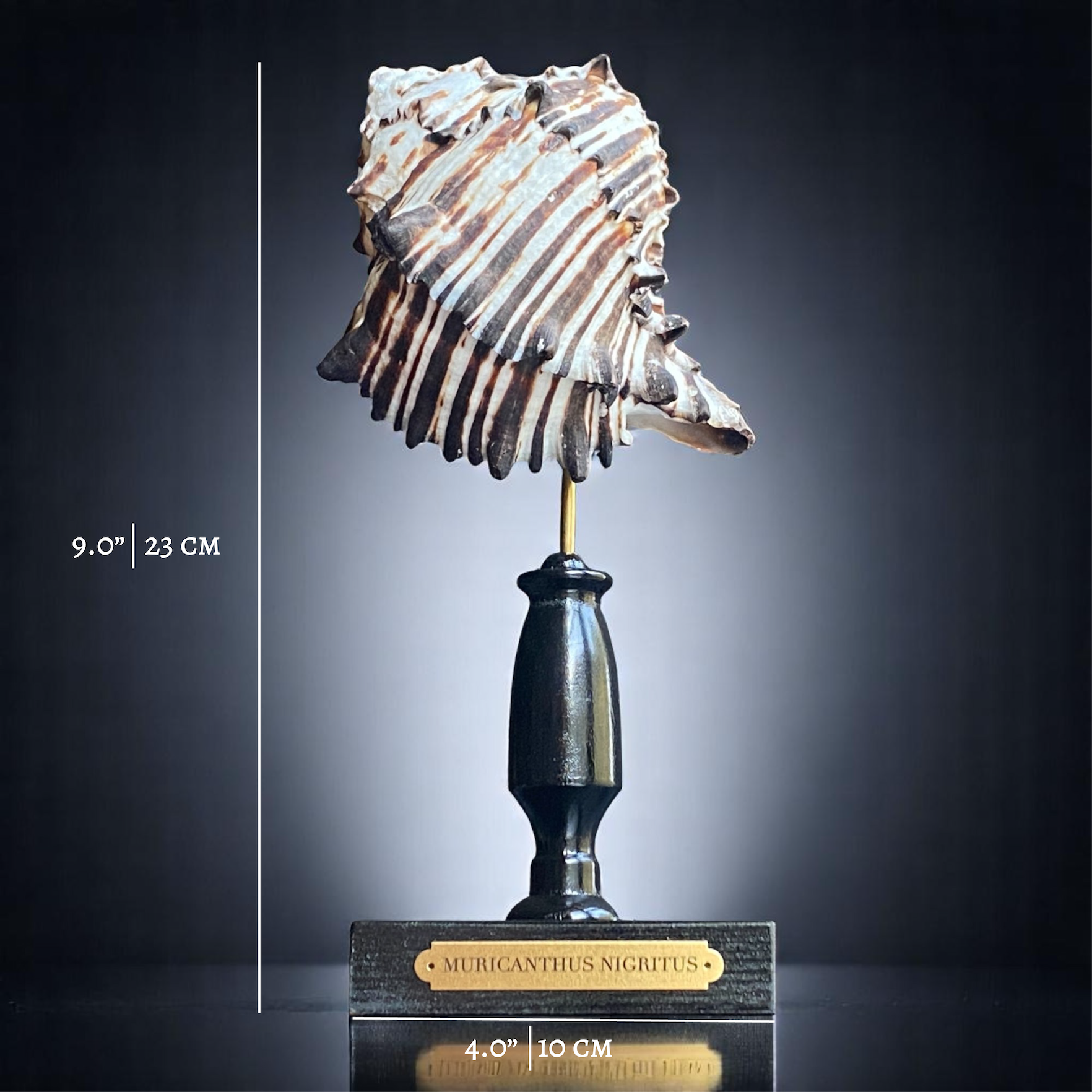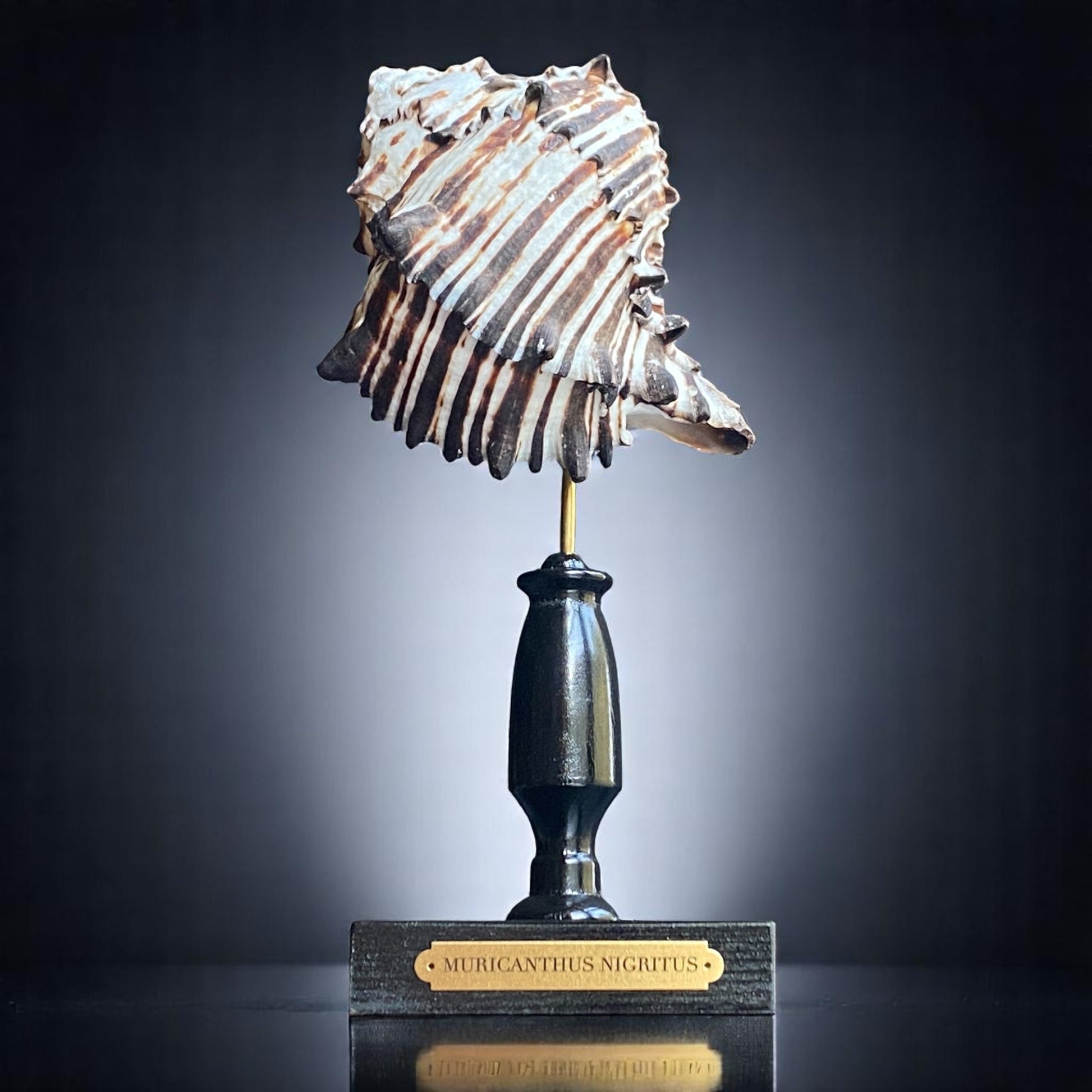 A stunning tropical shell displayed on a handmade glossy black stand with a brass plaque engraved with the Latin name for the species that called this shell its home.