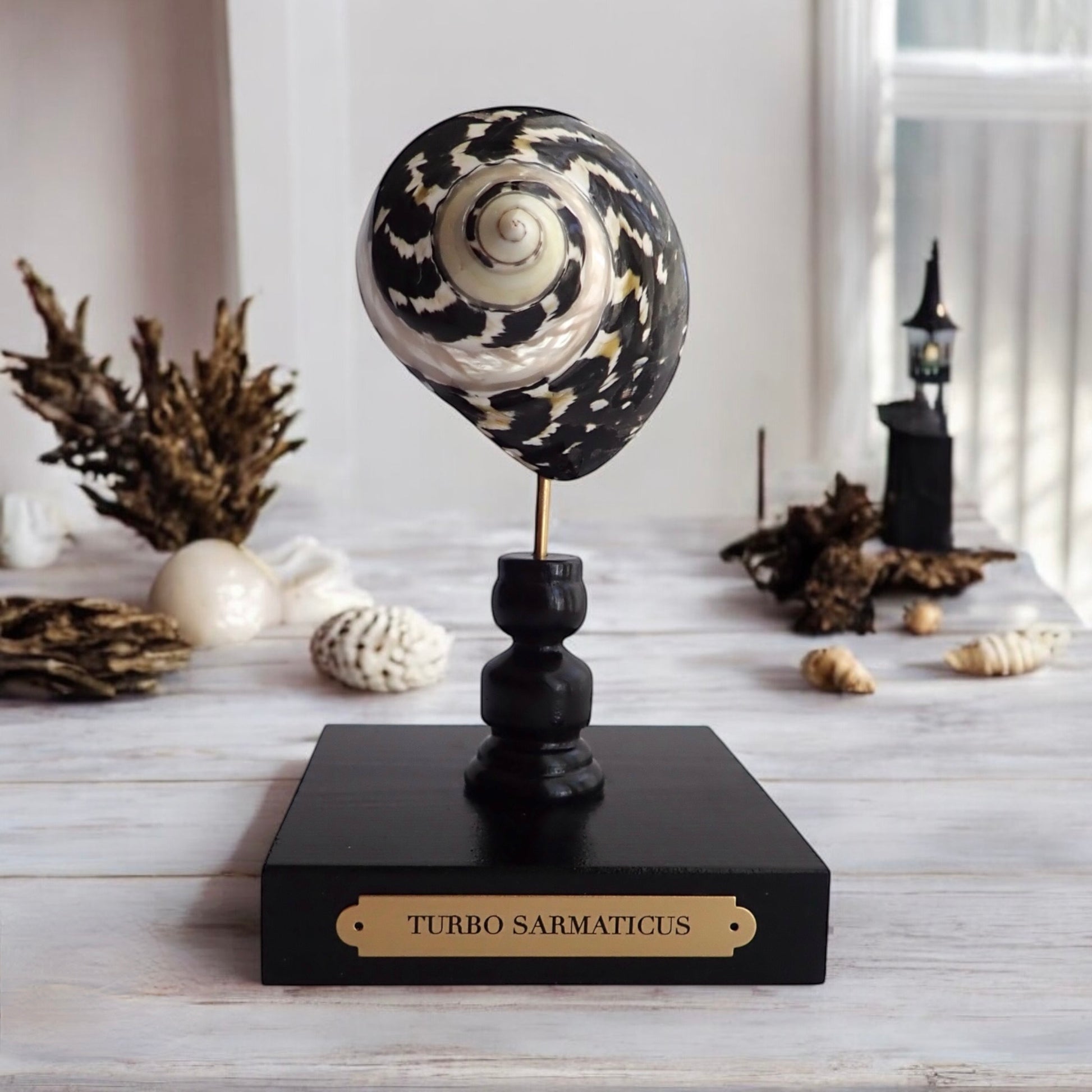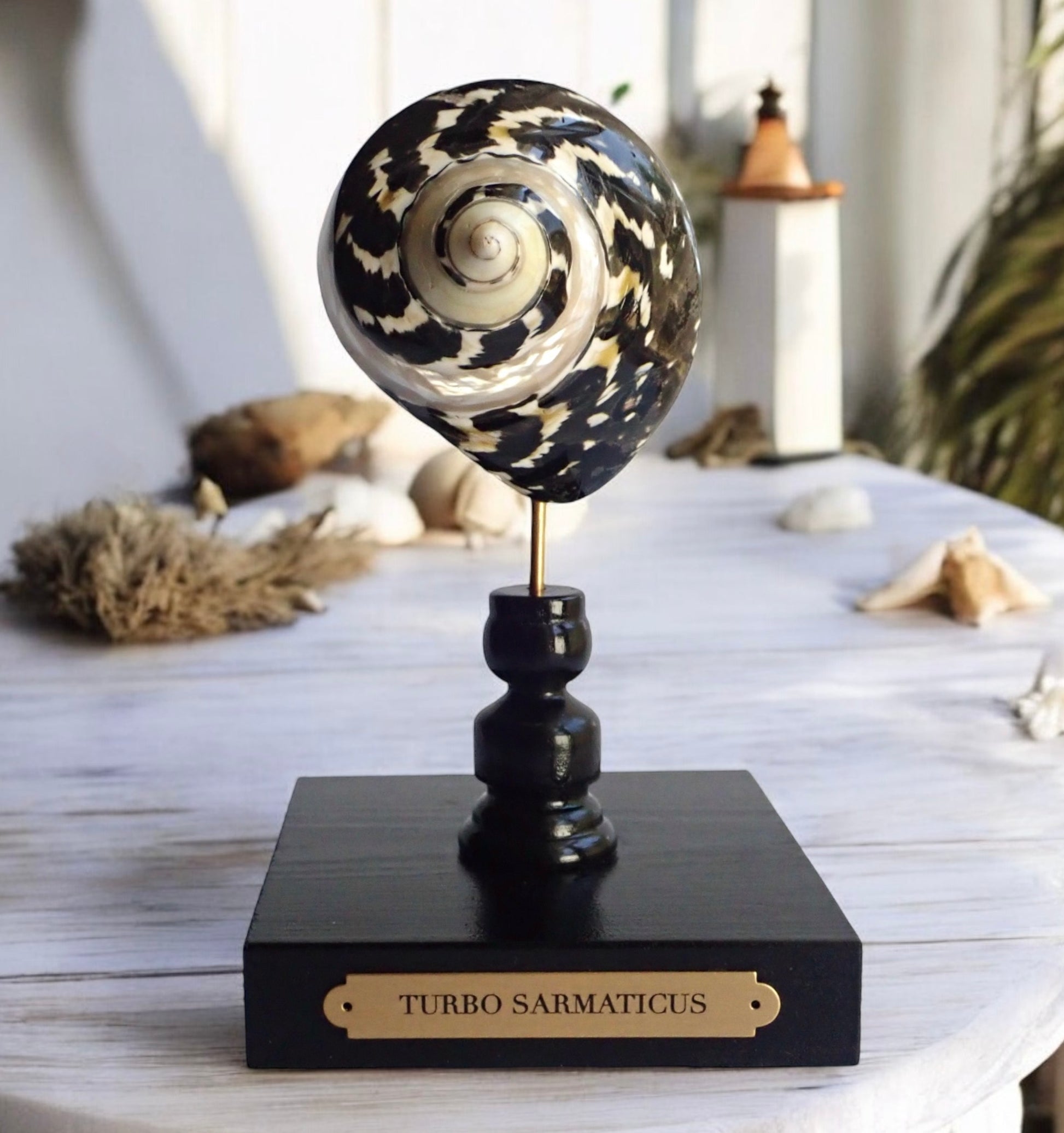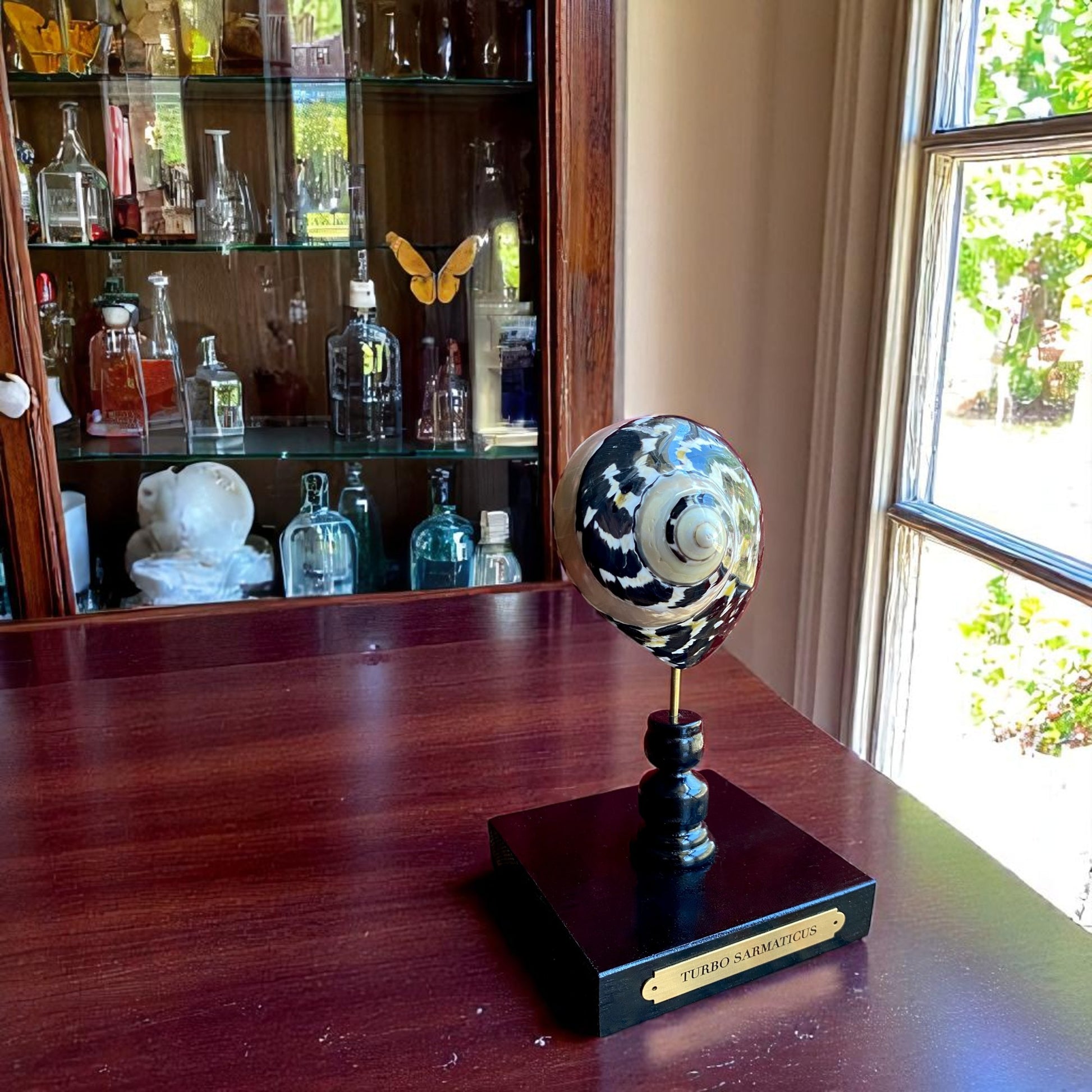 A stunning tropical shell displayed on a handmade glossy black stand with a brass plaque engraved with the Latin name for the species that called this shell its home.