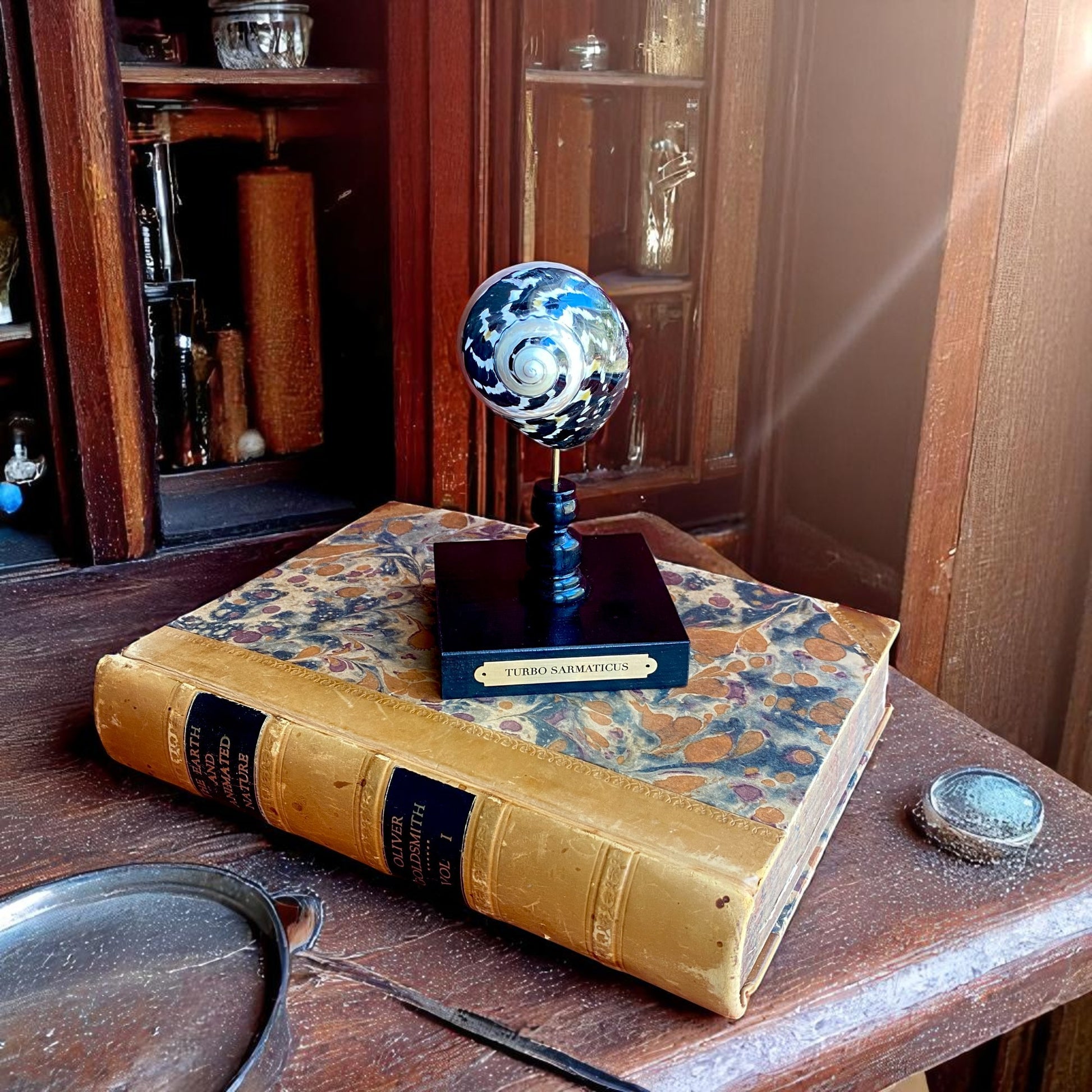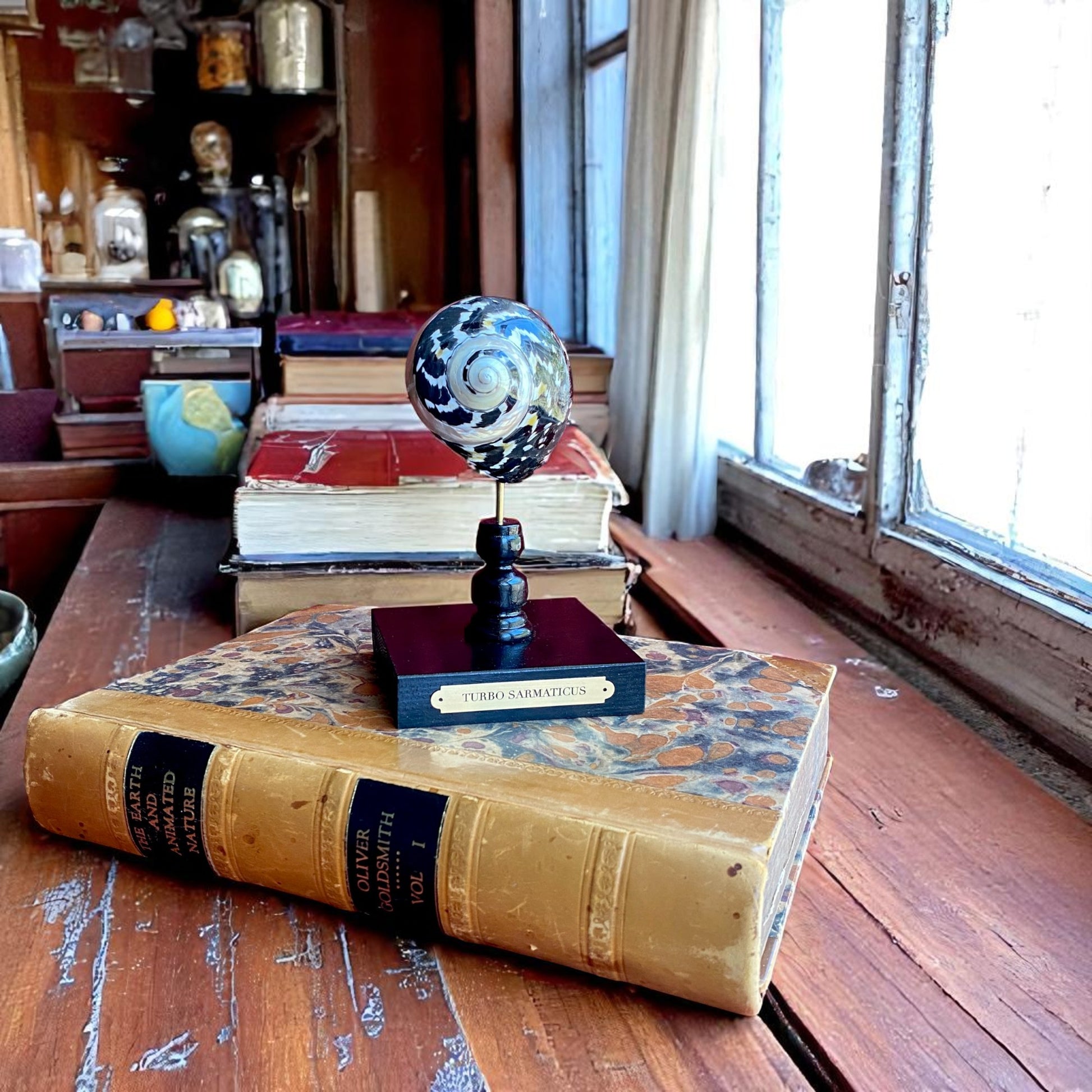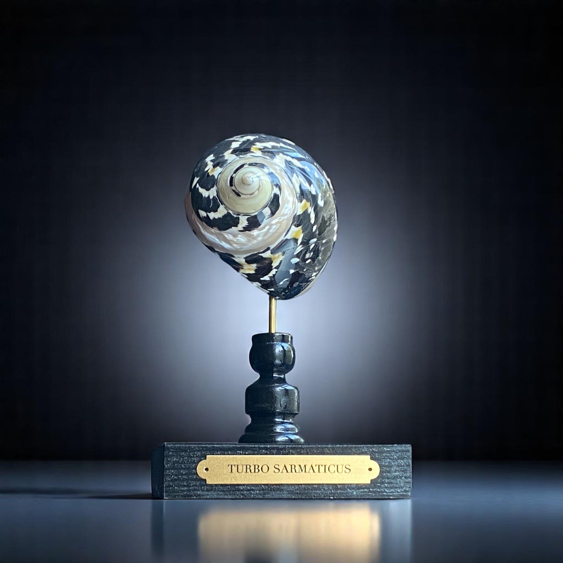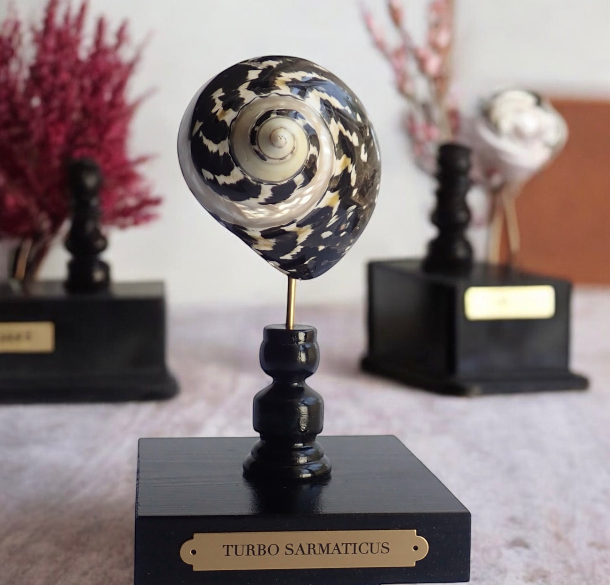 A stunning tropical shell displayed on a handmade glossy black stand with a brass plaque engraved with the Latin name for the species that called this shell its home.