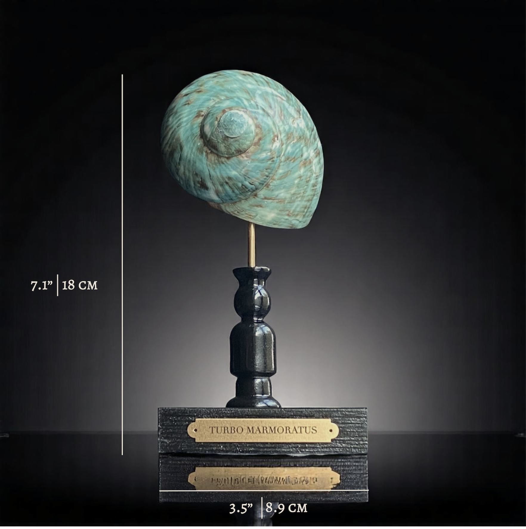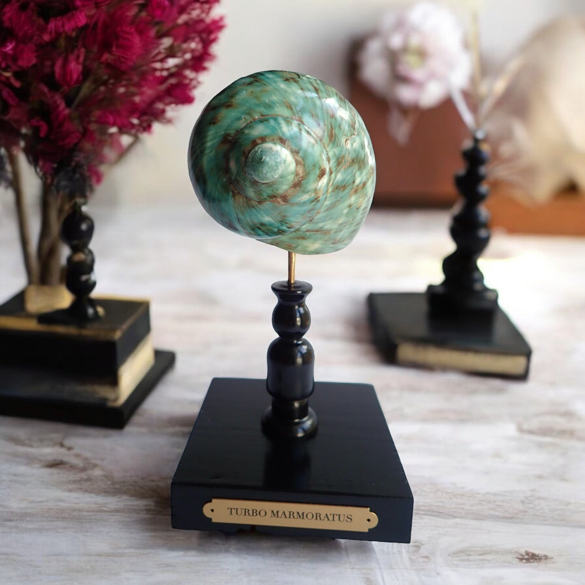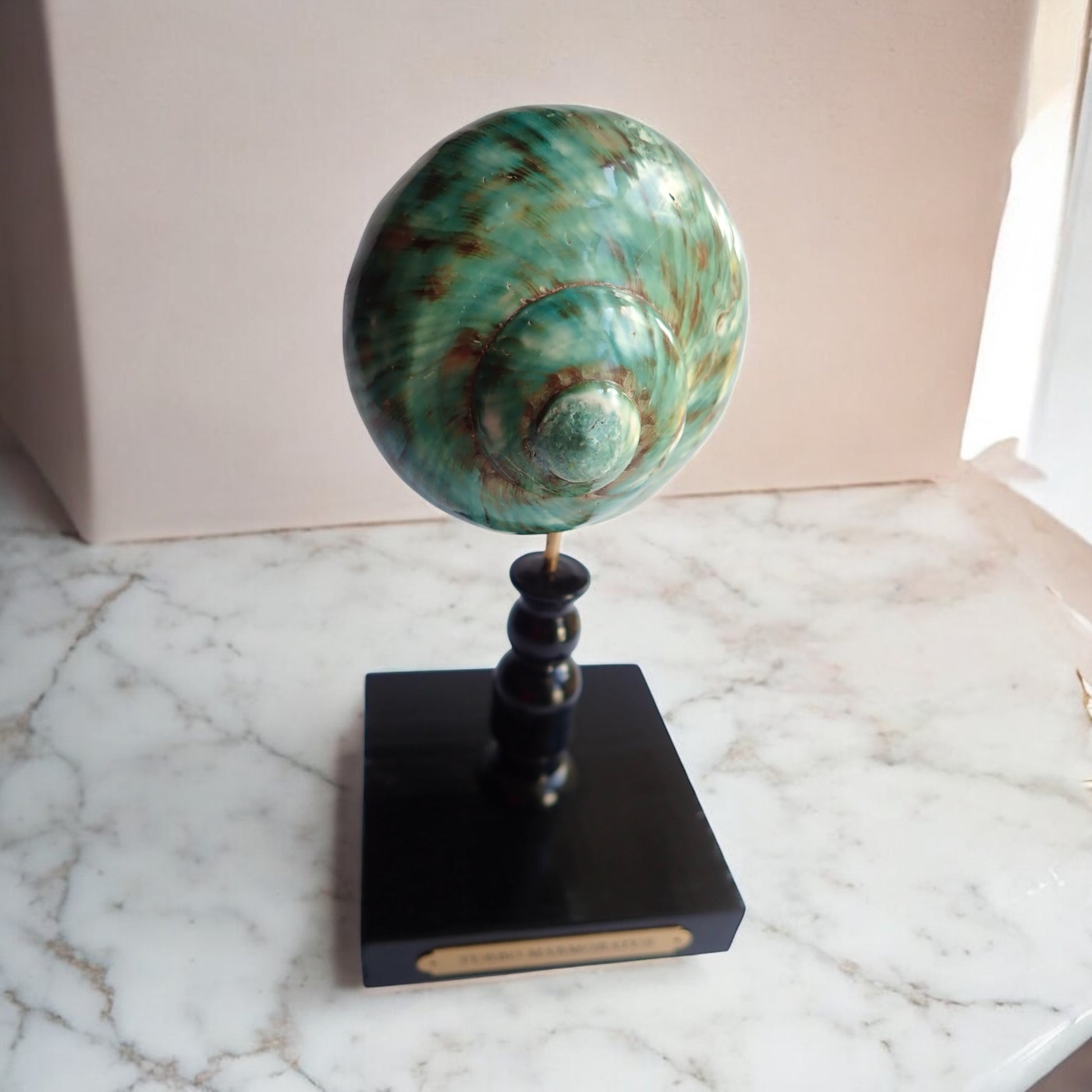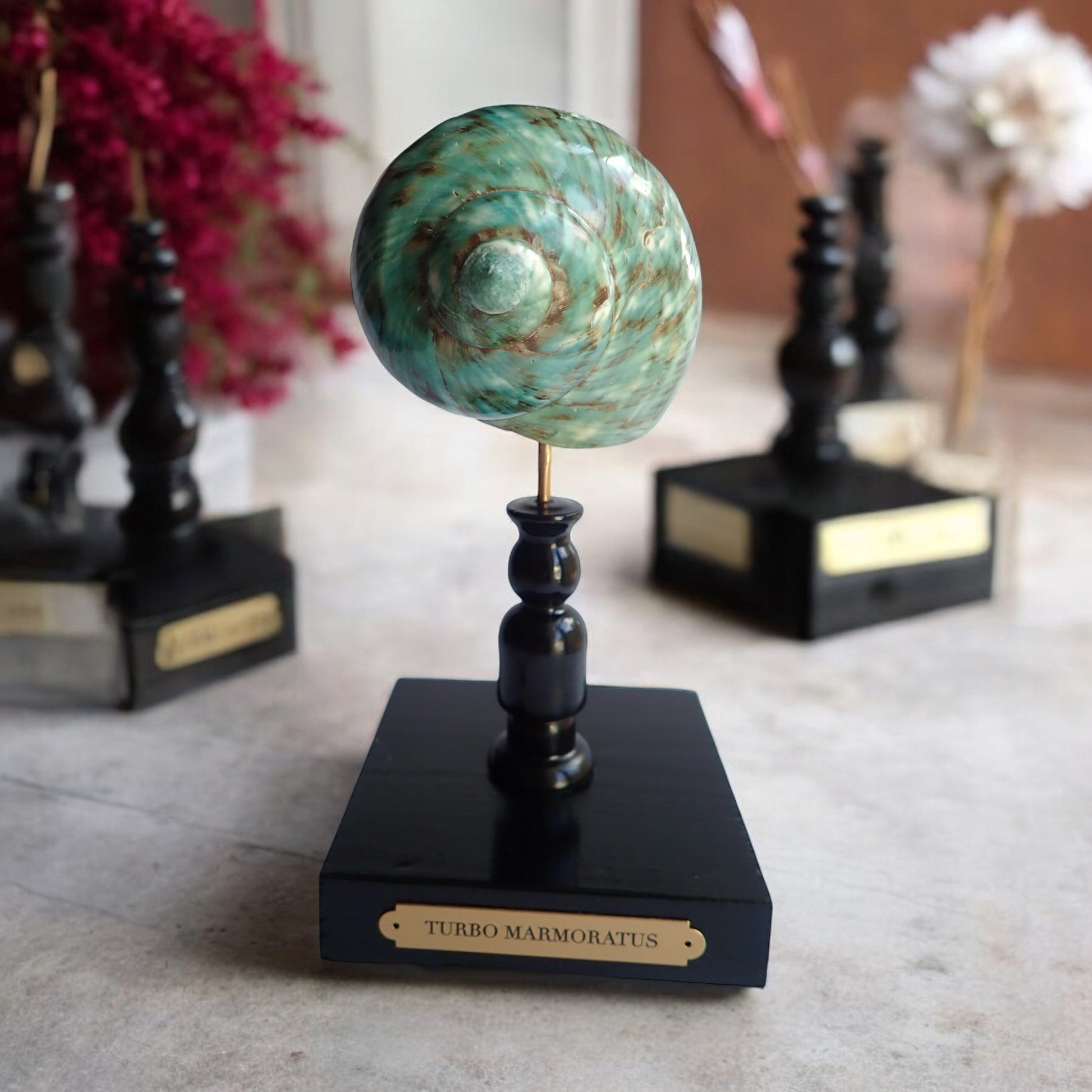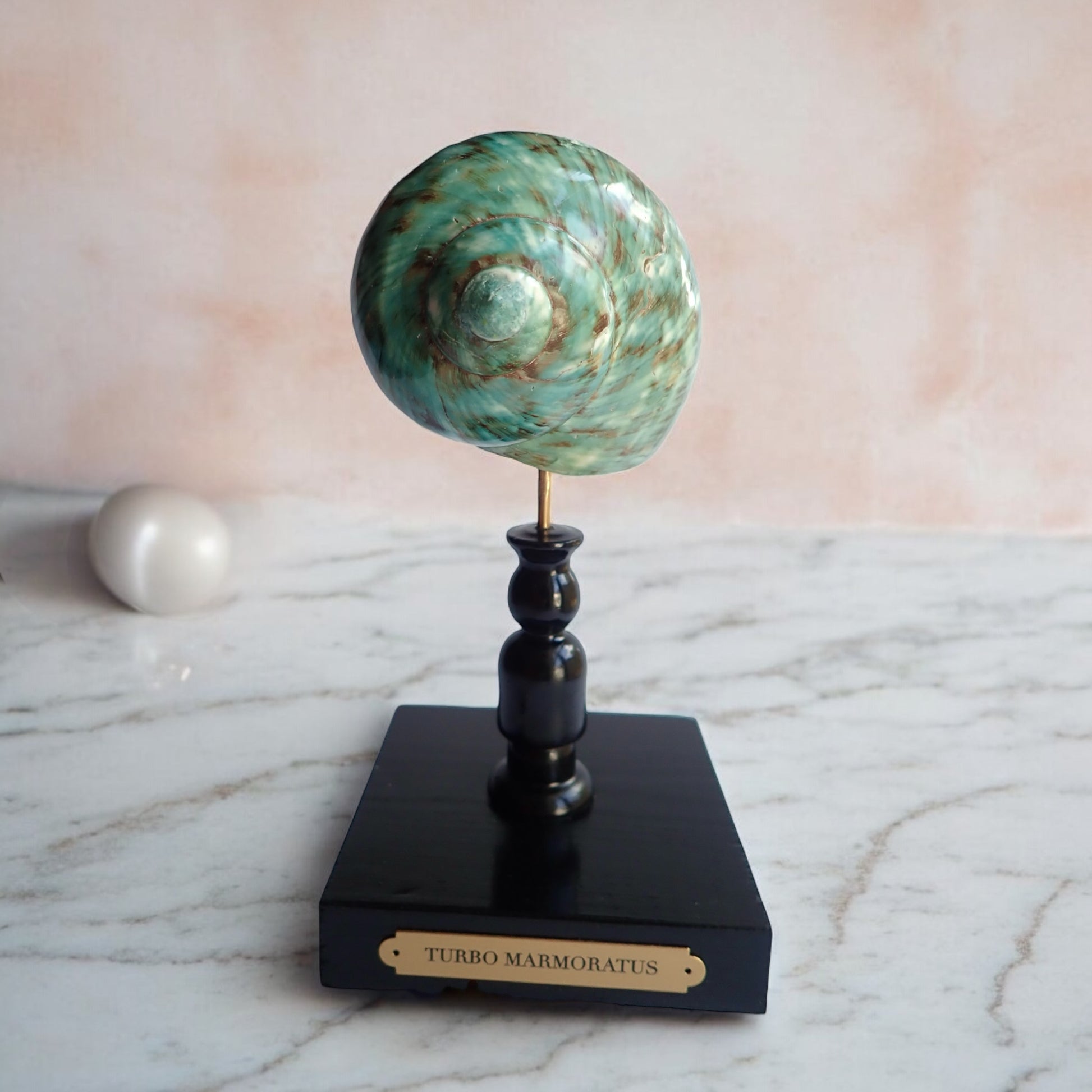The Green Turban's impressive size, intricate marbling, and iridescent interior make it a coveted specimen for collectors and decorators. When mounted on a glossy black stand with a brass plaque, it serves as an elegant centerpiece, showcasing the natural beauty of marine life.