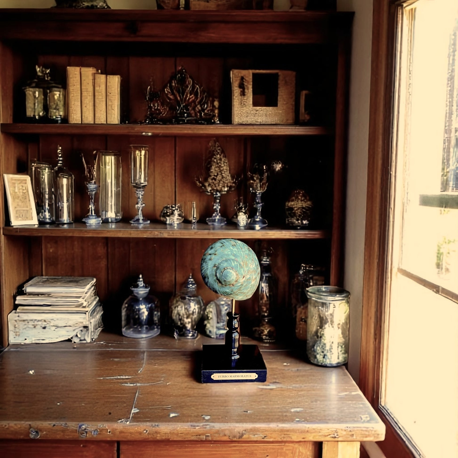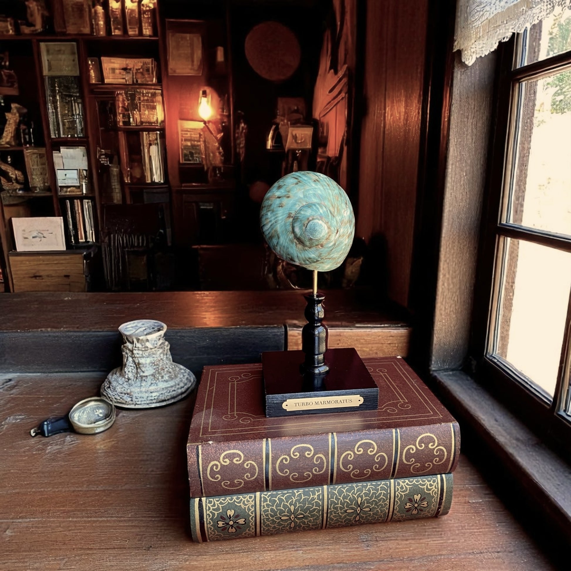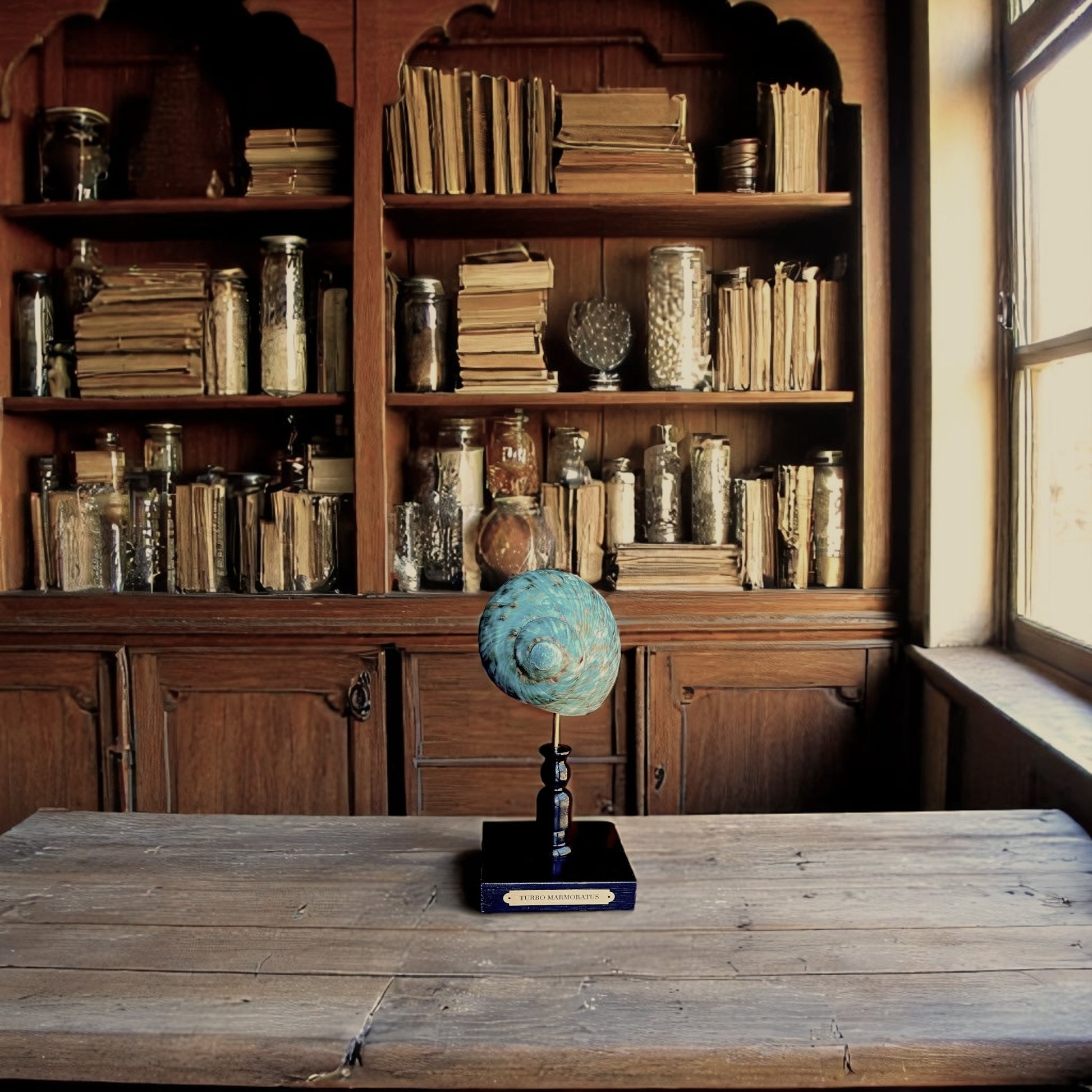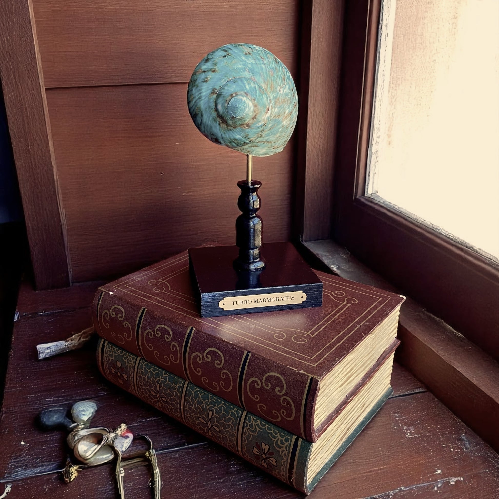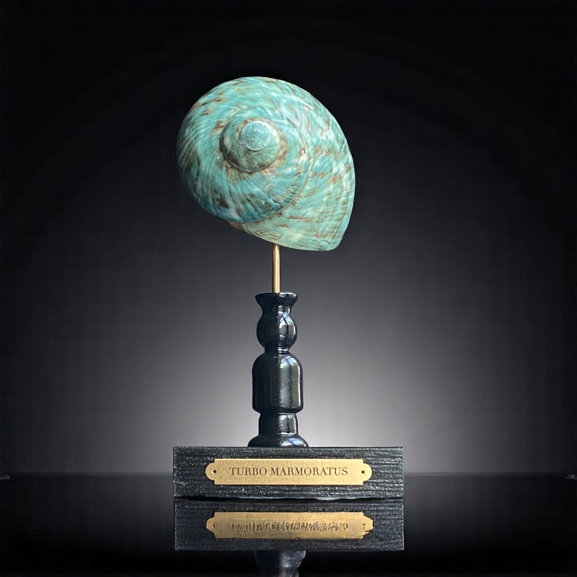 The Green Turban's impressive size, intricate marbling, and iridescent interior make it a coveted specimen for collectors and decorators. When mounted on a glossy black stand with a brass plaque, it serves as an elegant centerpiece, showcasing the natural beauty of marine life.