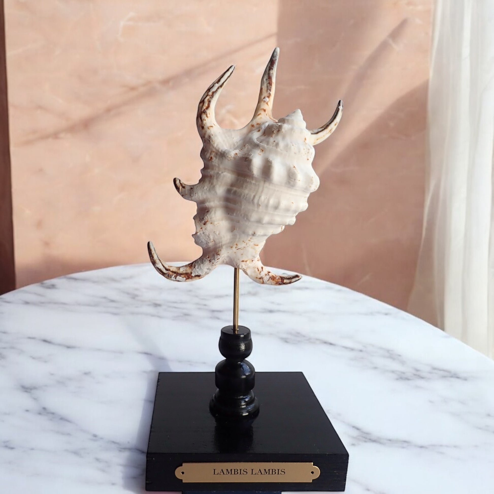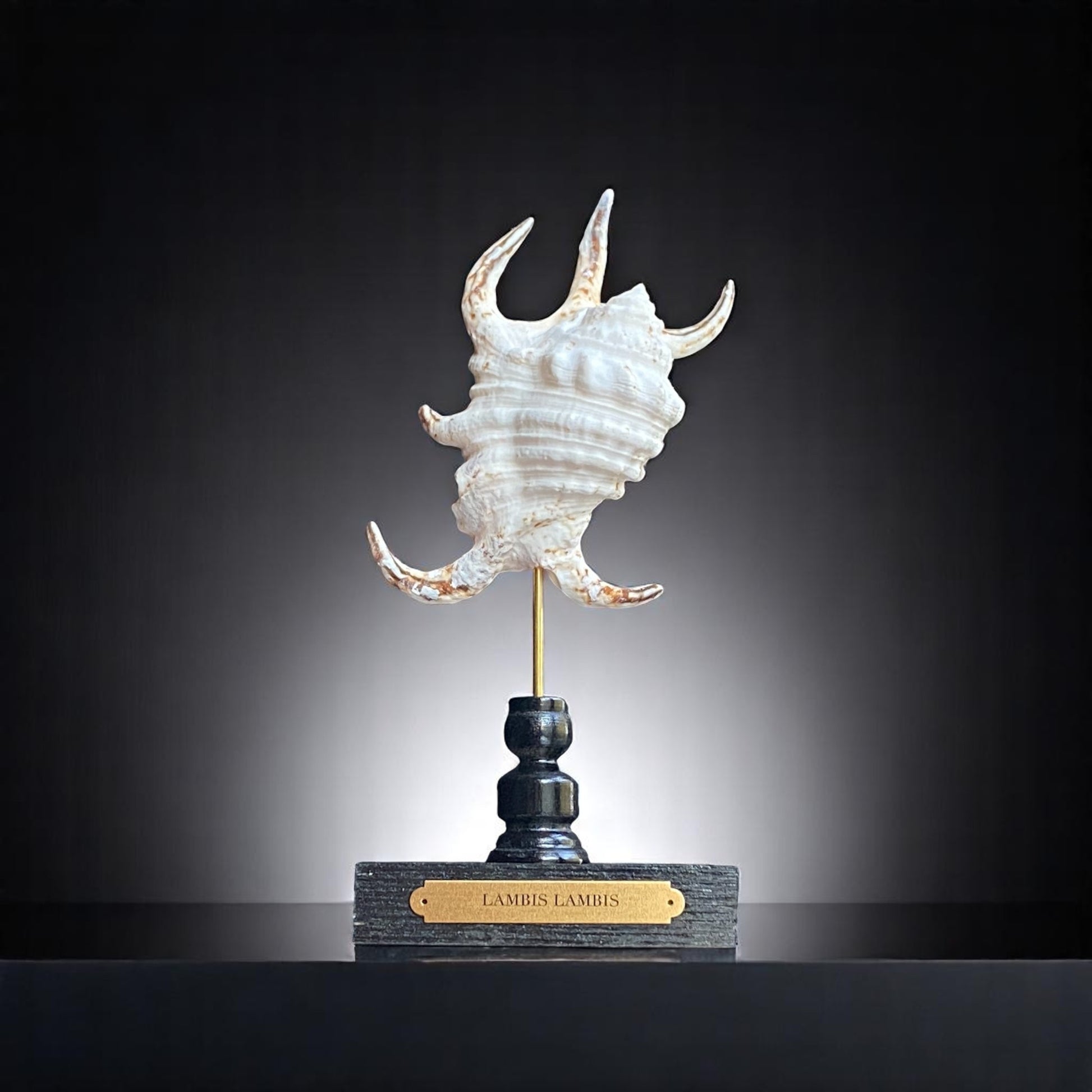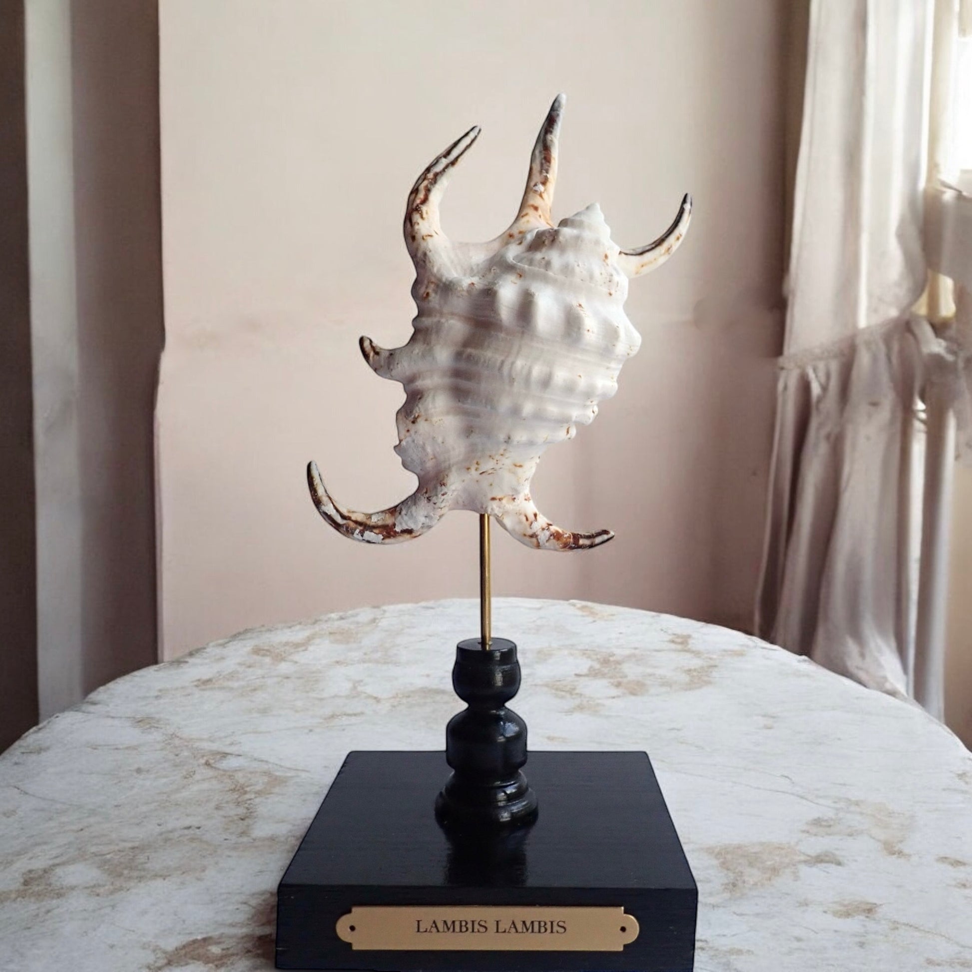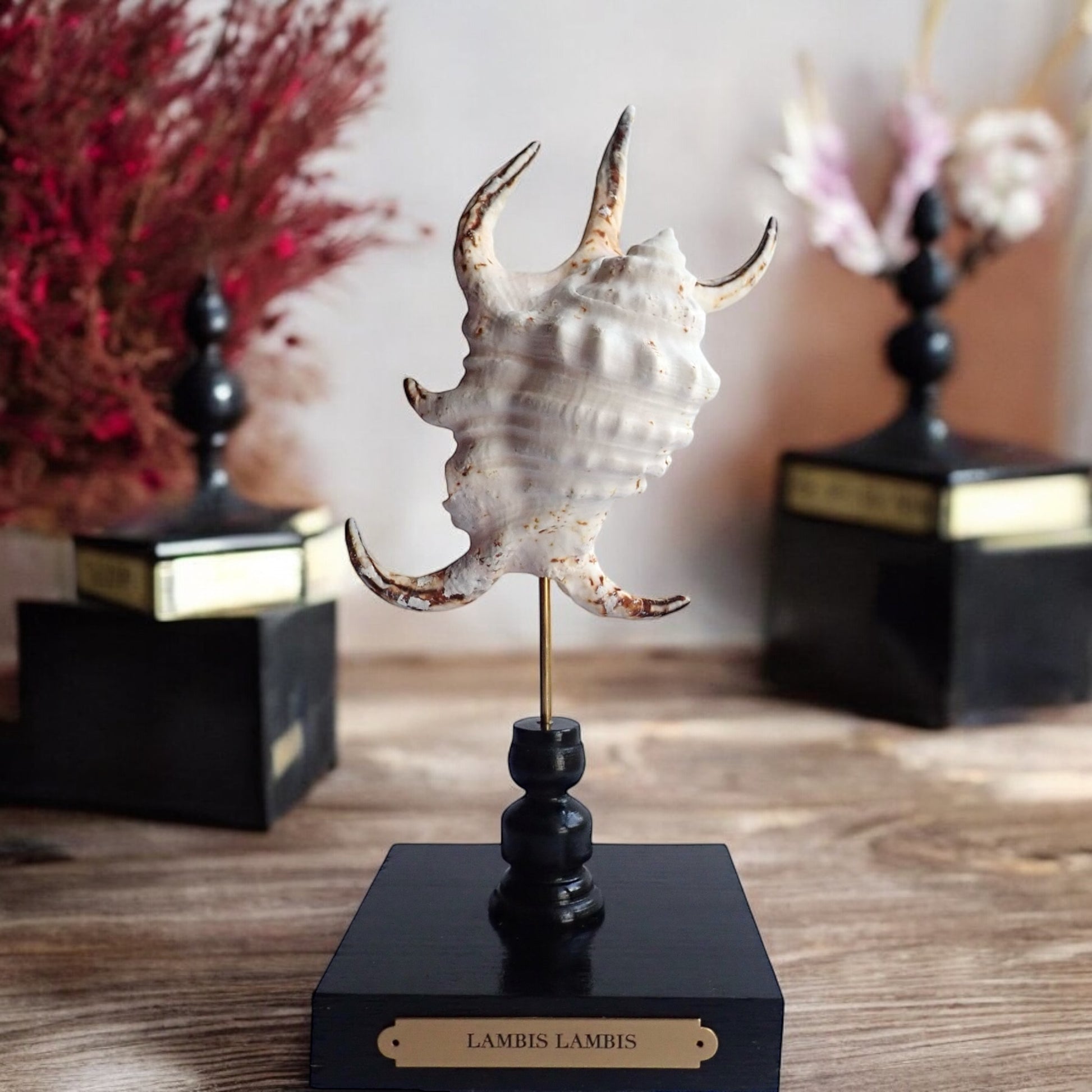The ornate shell of Lambis lambis, with its distinctive spines and vibrant coloration, makes it a highly sought-after specimen among shell collectors and marine enthusiasts. When mounted on a glossy black stand with a brass plaque, it serves as an elegant centerpiece, showcasing the intricate beauty of marine life.