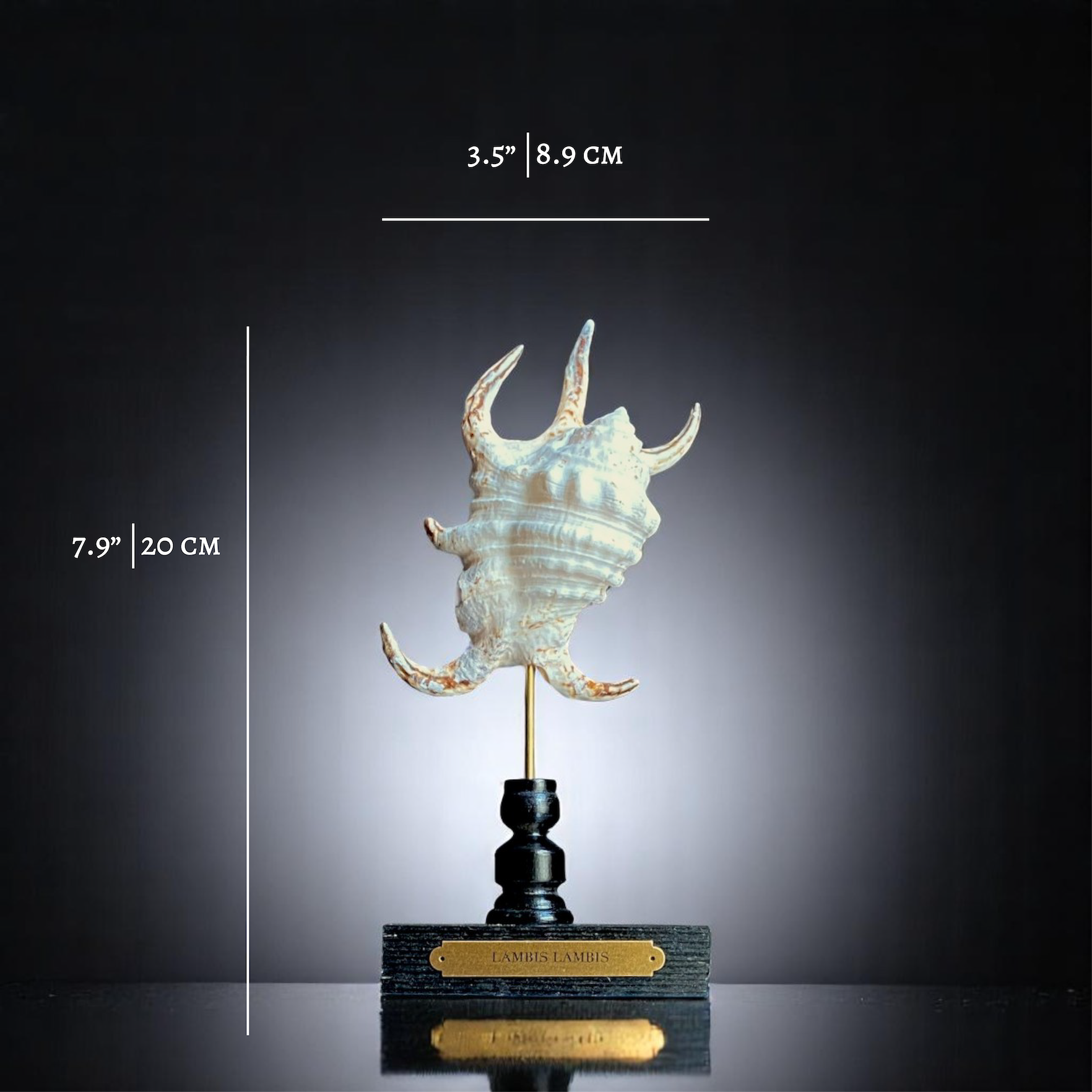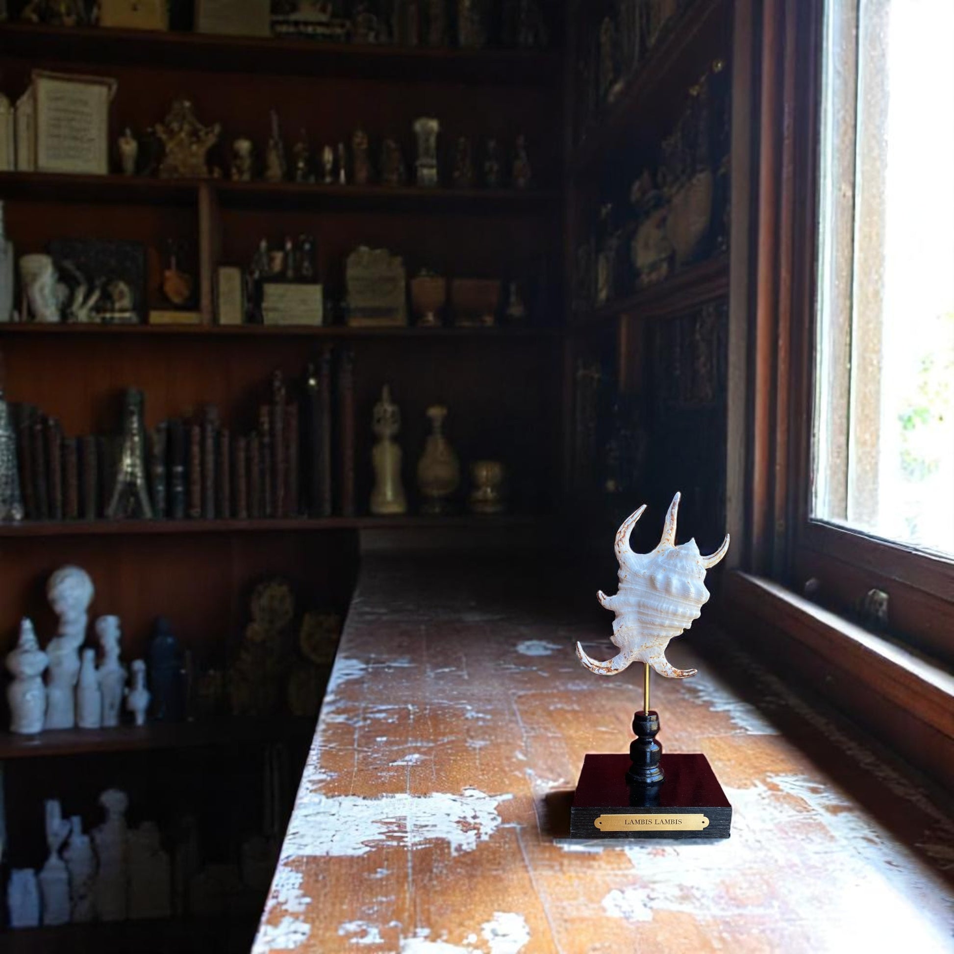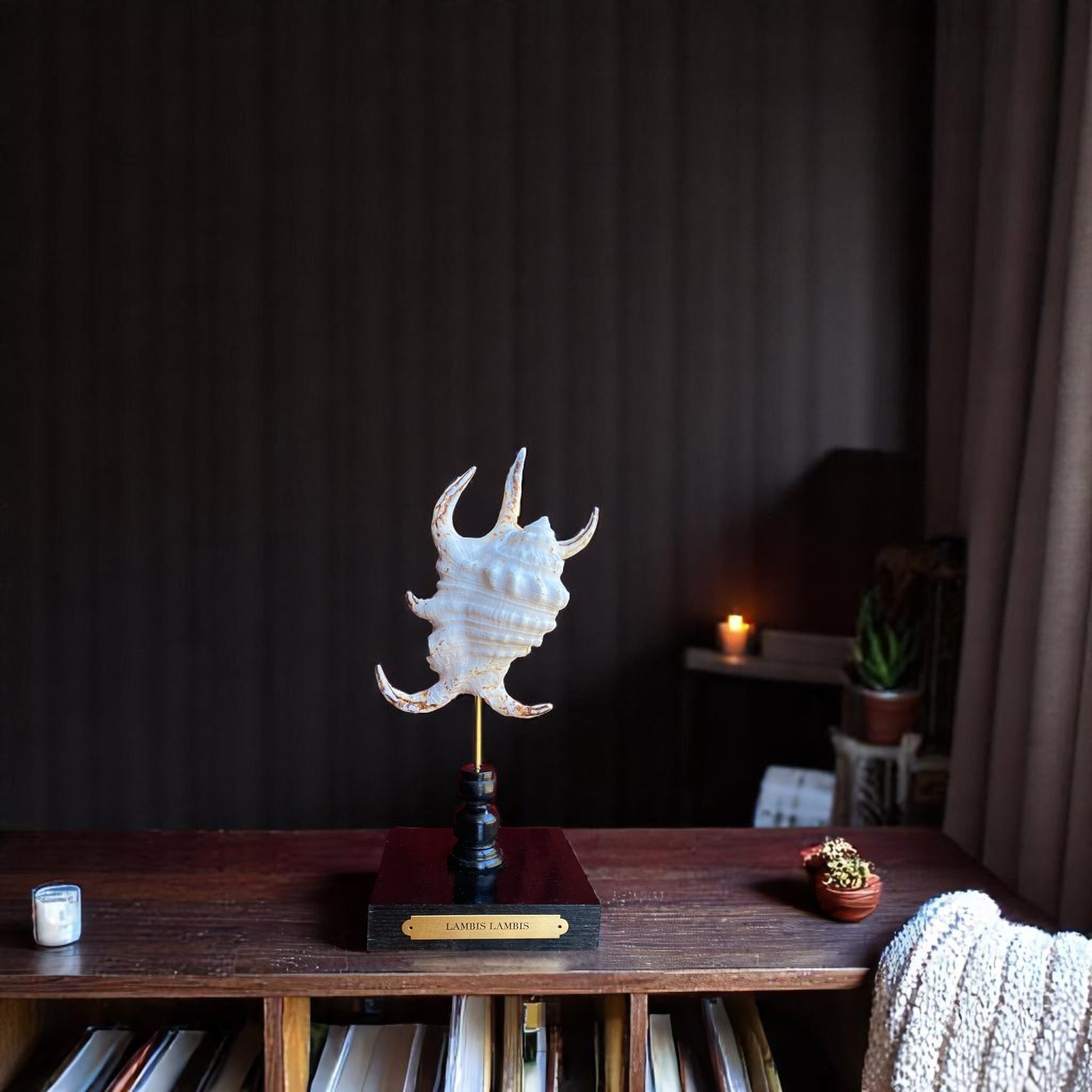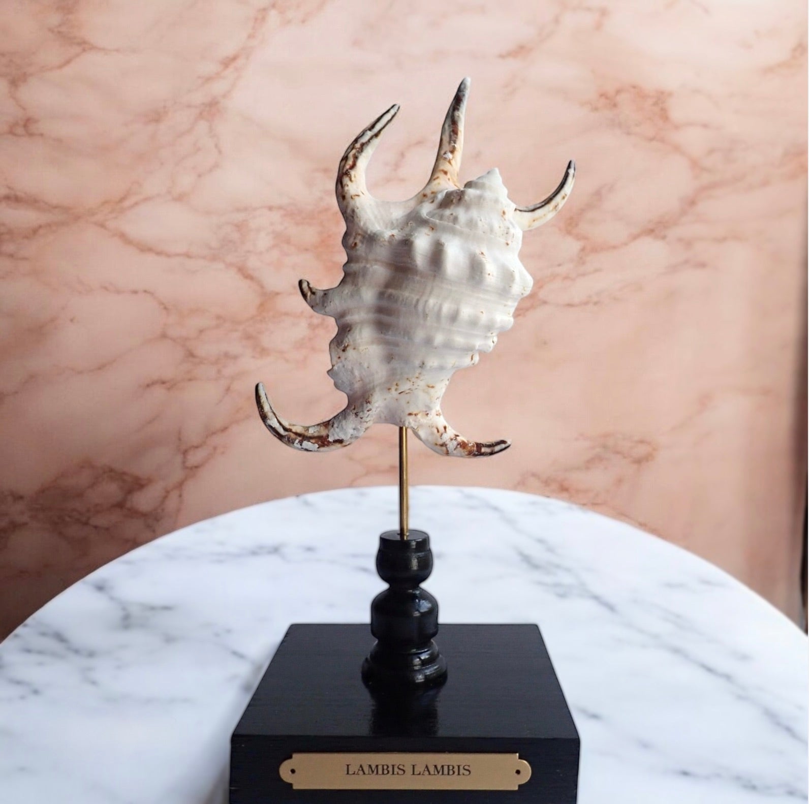 The ornate shell of Lambis lambis, with its distinctive spines and vibrant coloration, makes it a highly sought-after specimen among shell collectors and marine enthusiasts. When mounted on a glossy black stand with a brass plaque, it serves as an elegant centerpiece, showcasing the intricate beauty of marine life.