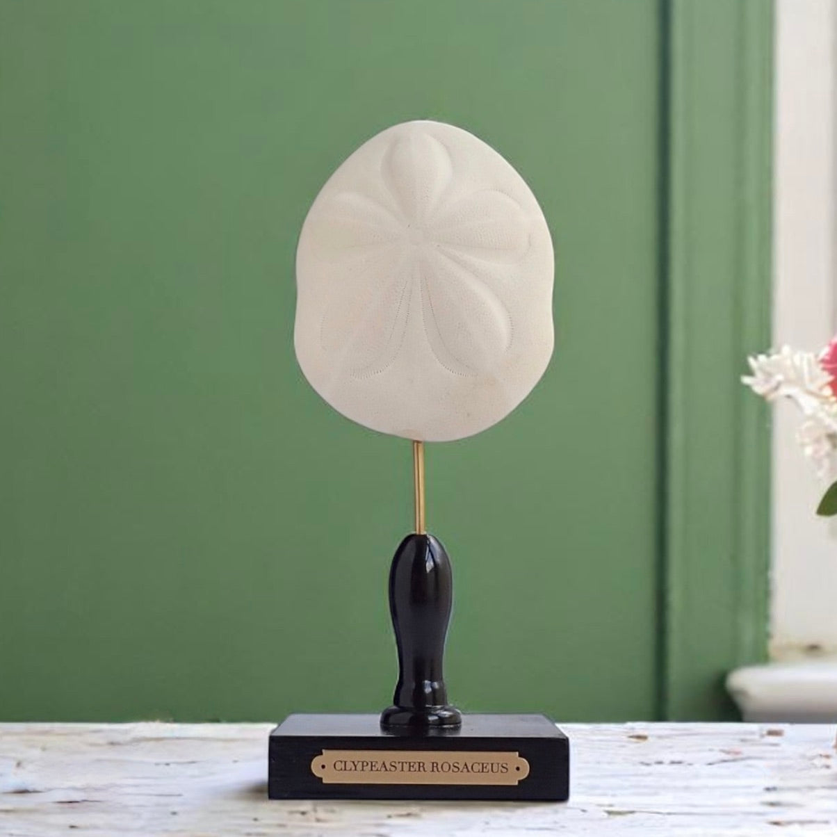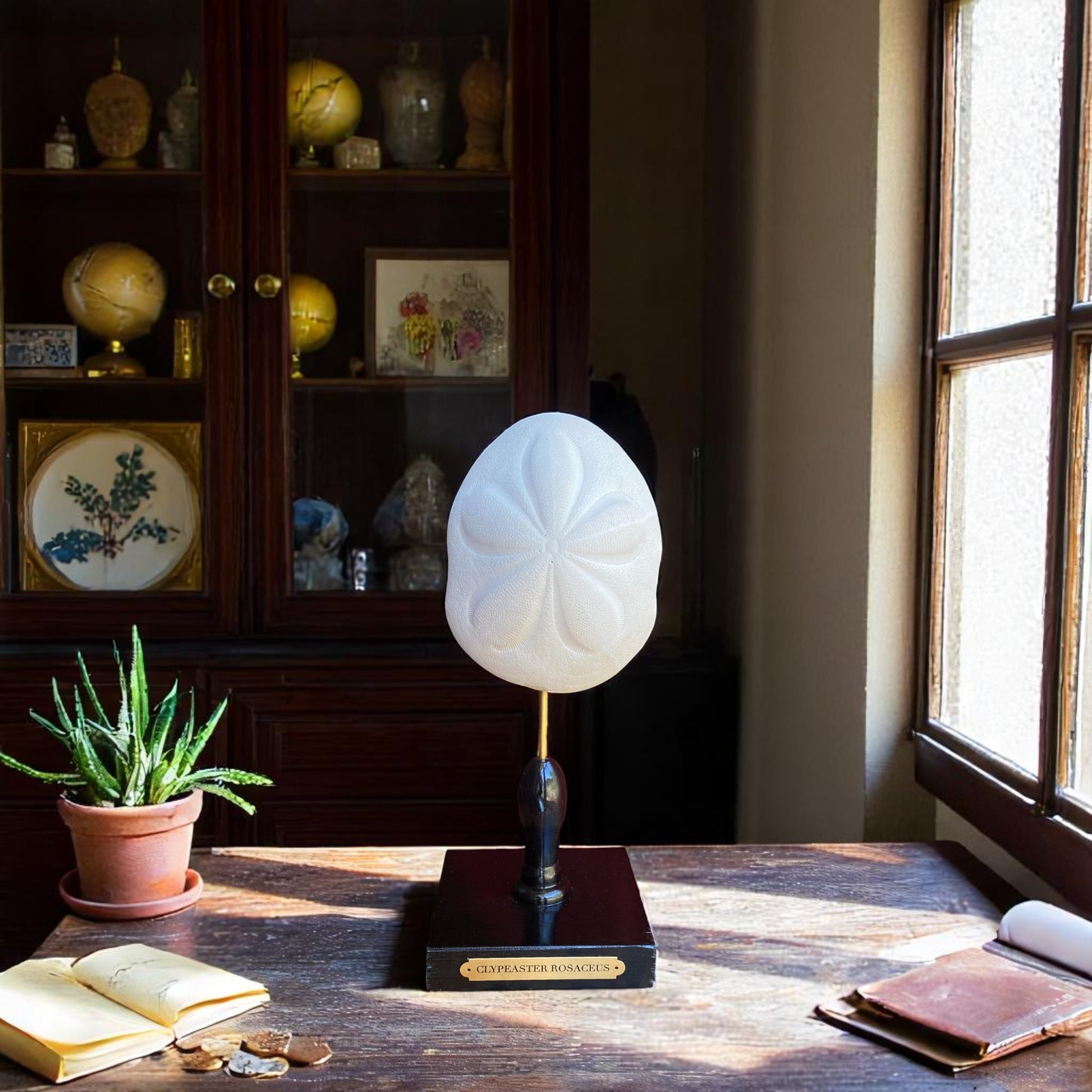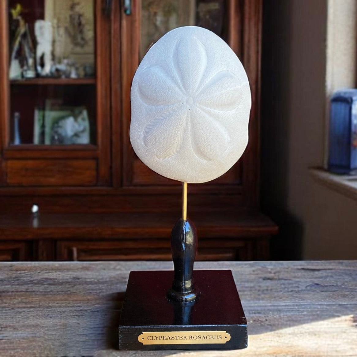 Due to its unique shape and size, the fat sea biscuit is a popular specimen among shell collectors and marine enthusiasts. When mounted on a glossy black stand with a brass plaque, it serves as an elegant centerpiece, showcasing the intricate beauty of marine life.
