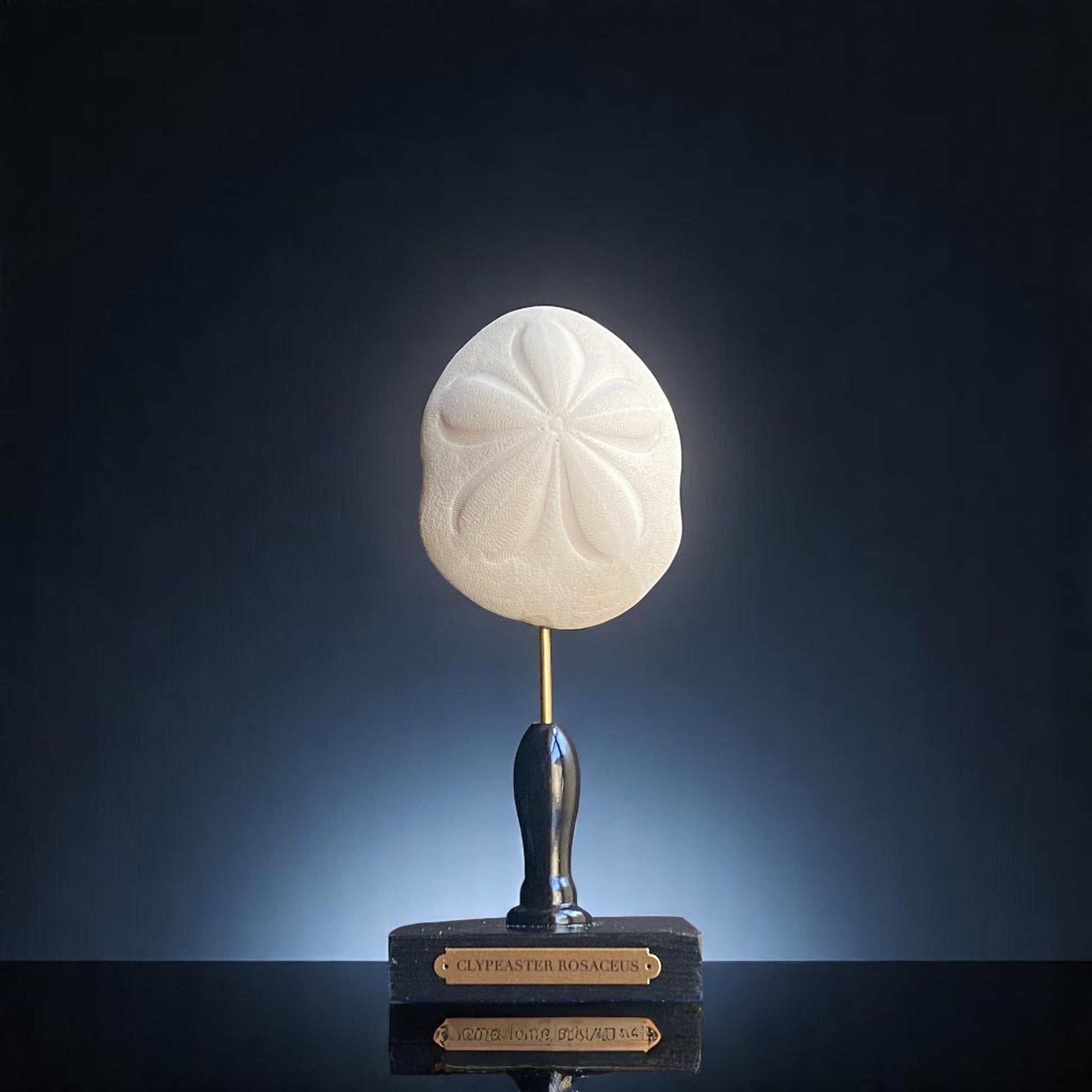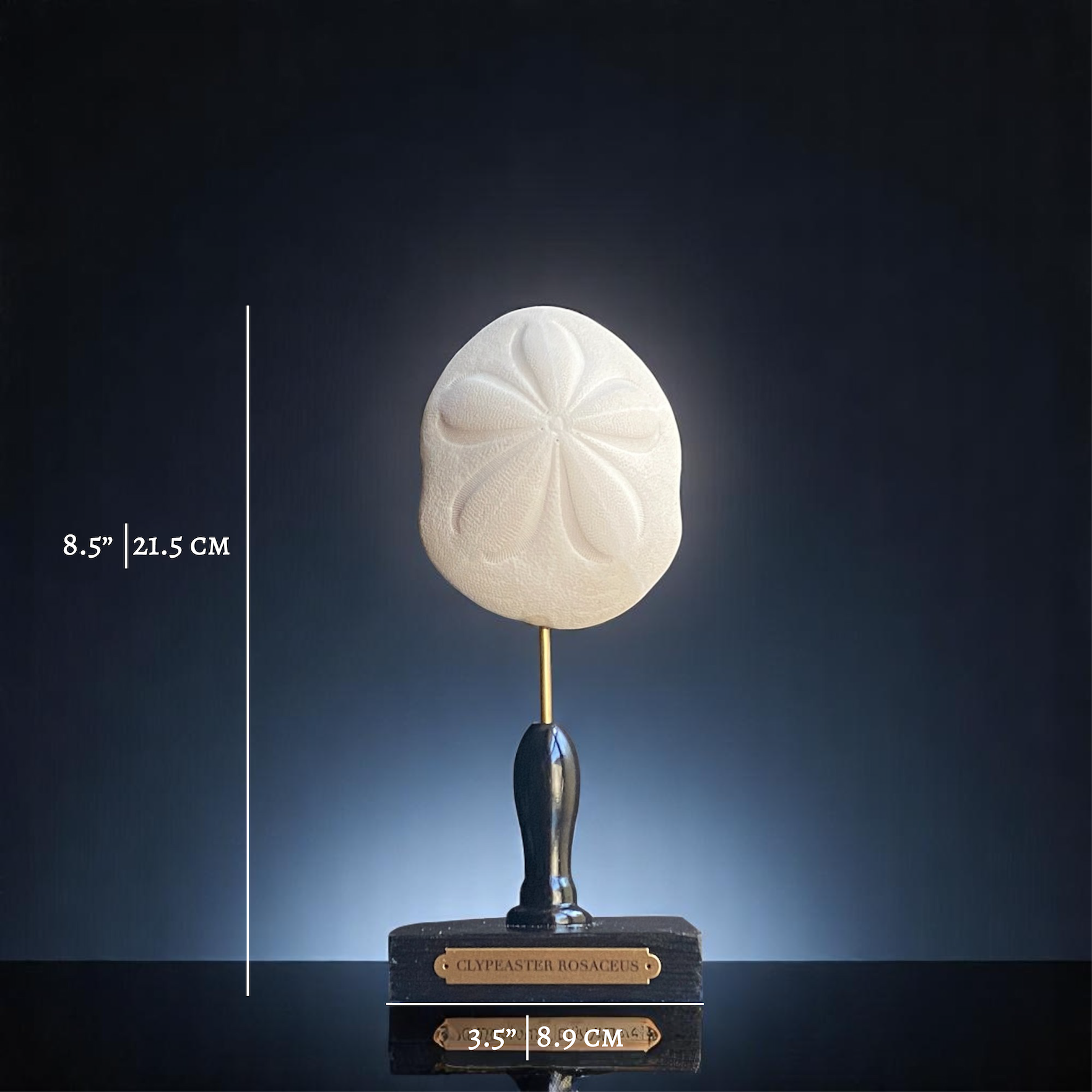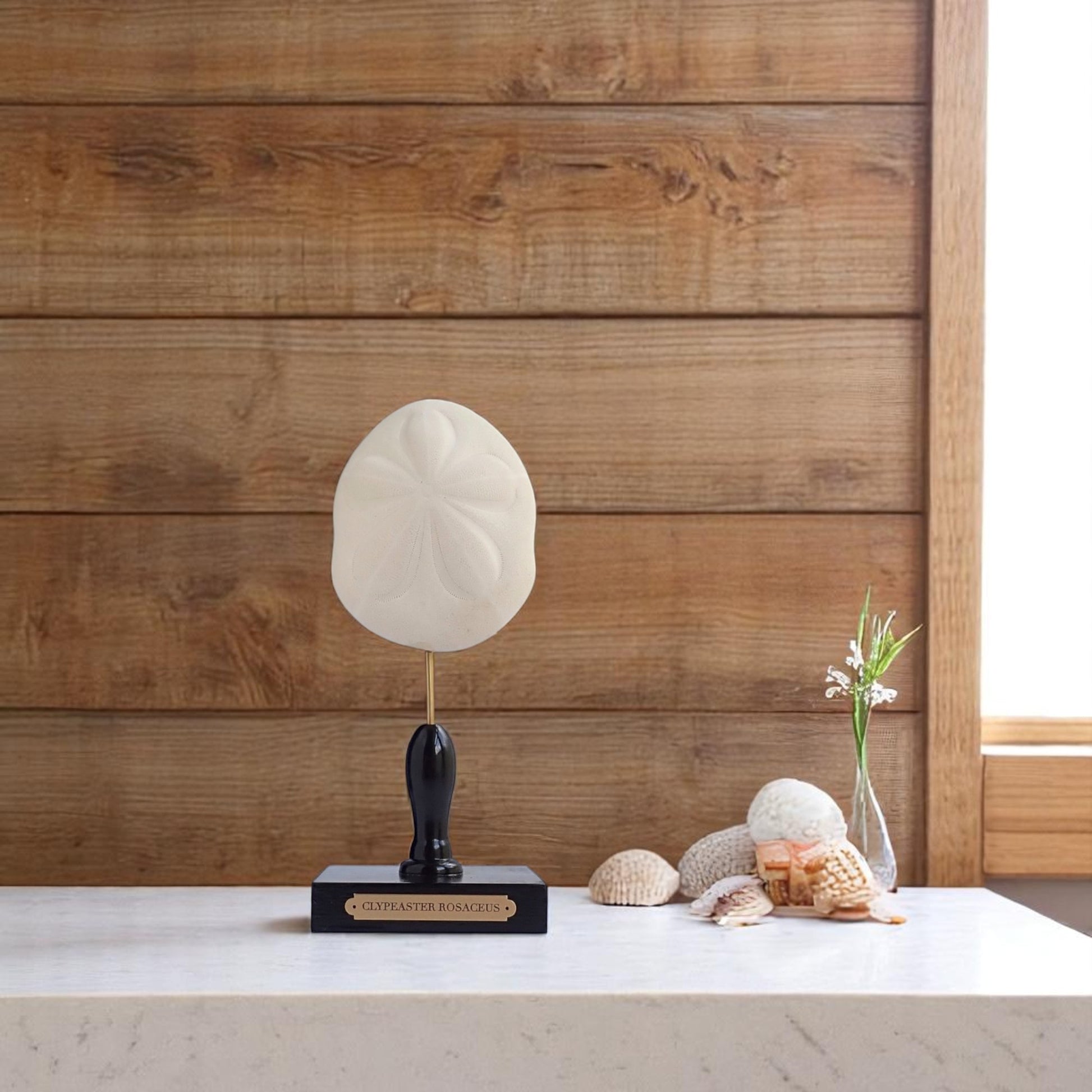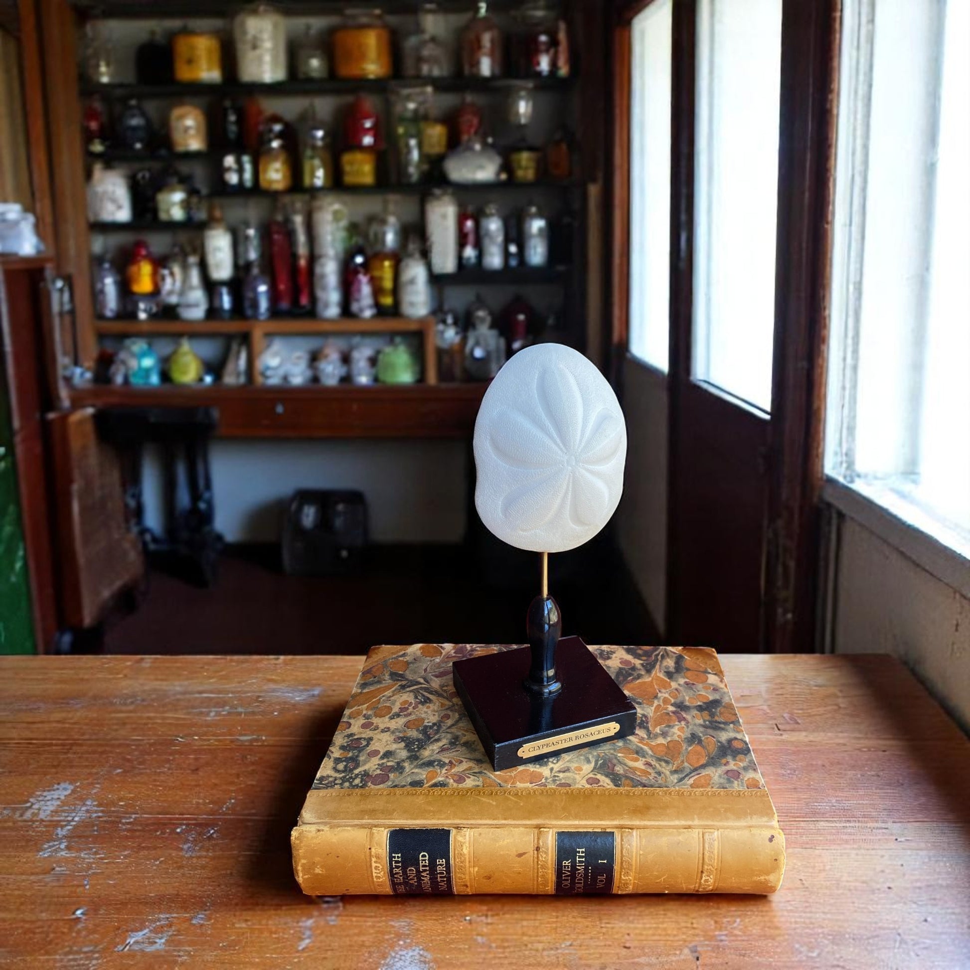 Due to its unique shape and size, the fat sea biscuit is a popular specimen among shell collectors and marine enthusiasts. When mounted on a glossy black stand with a brass plaque, it serves as an elegant centerpiece, showcasing the intricate beauty of marine life.