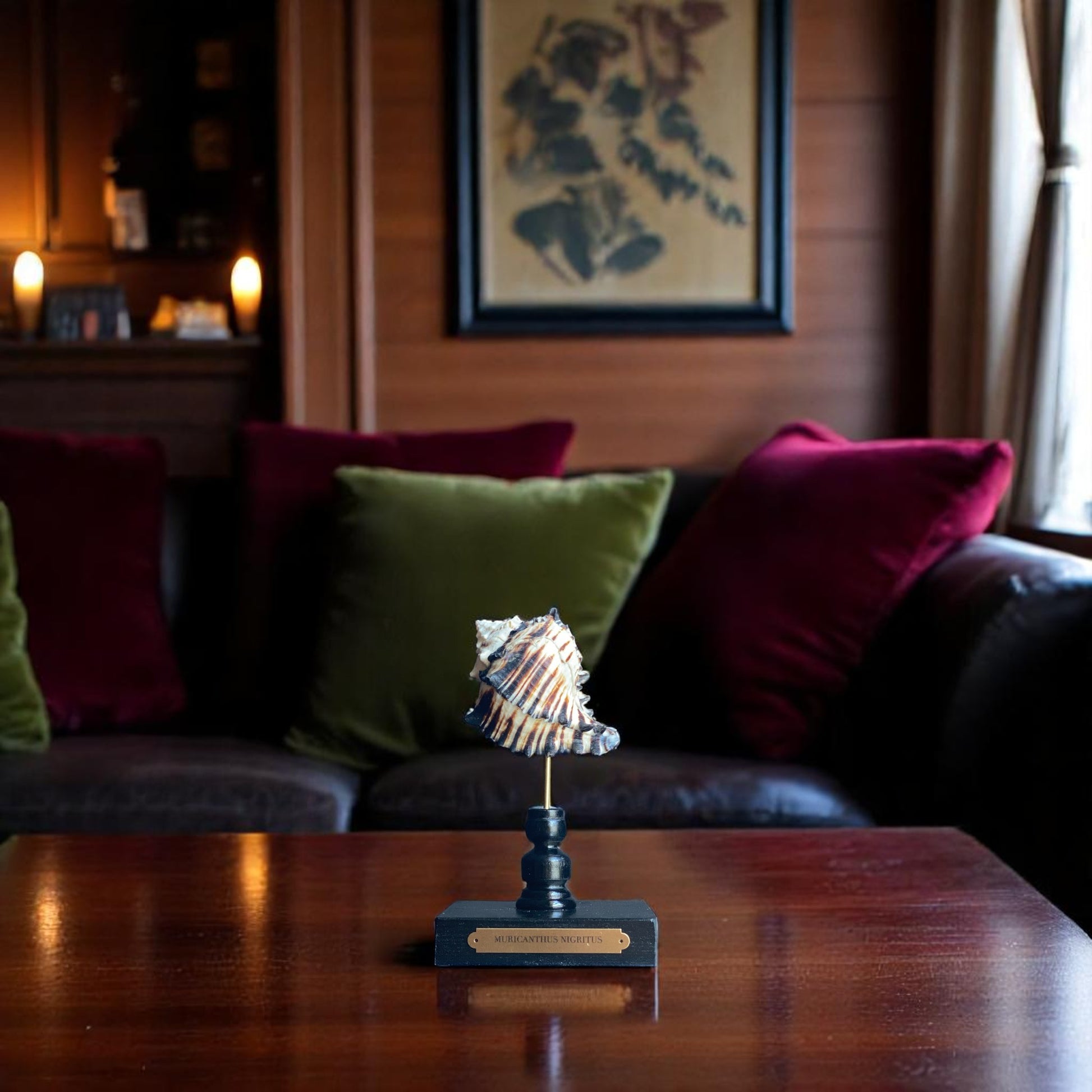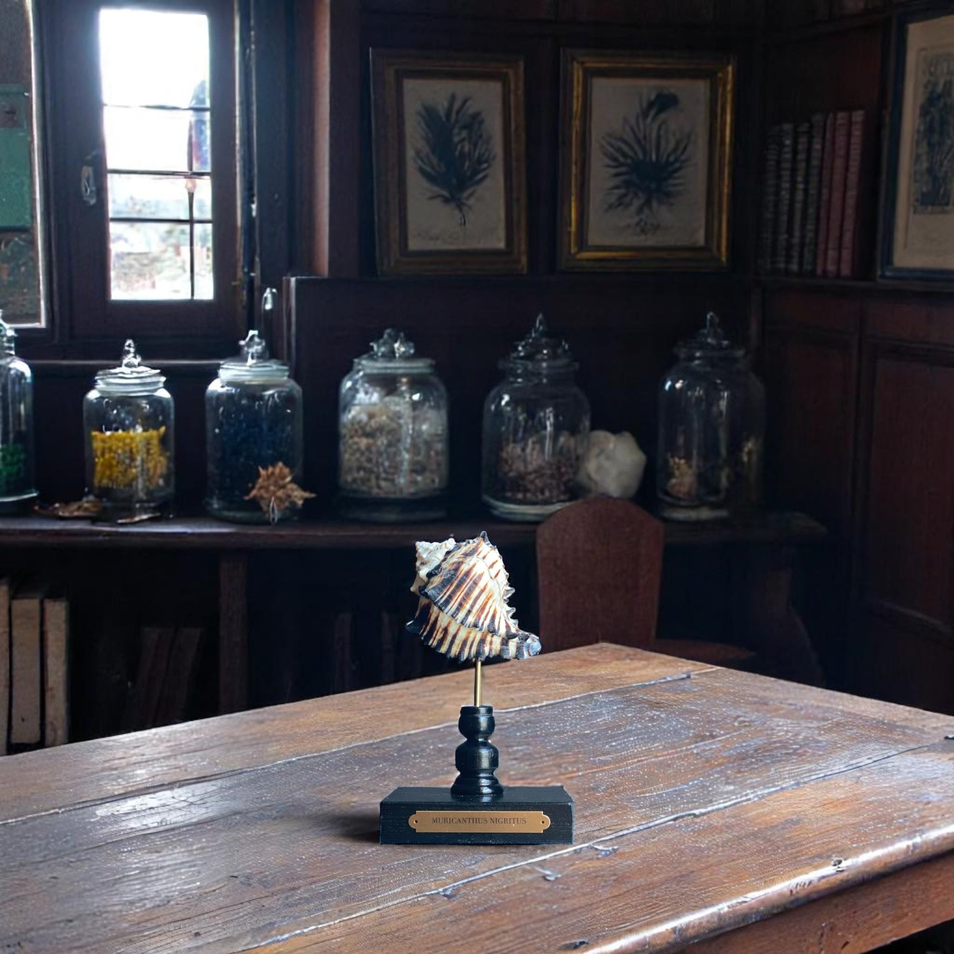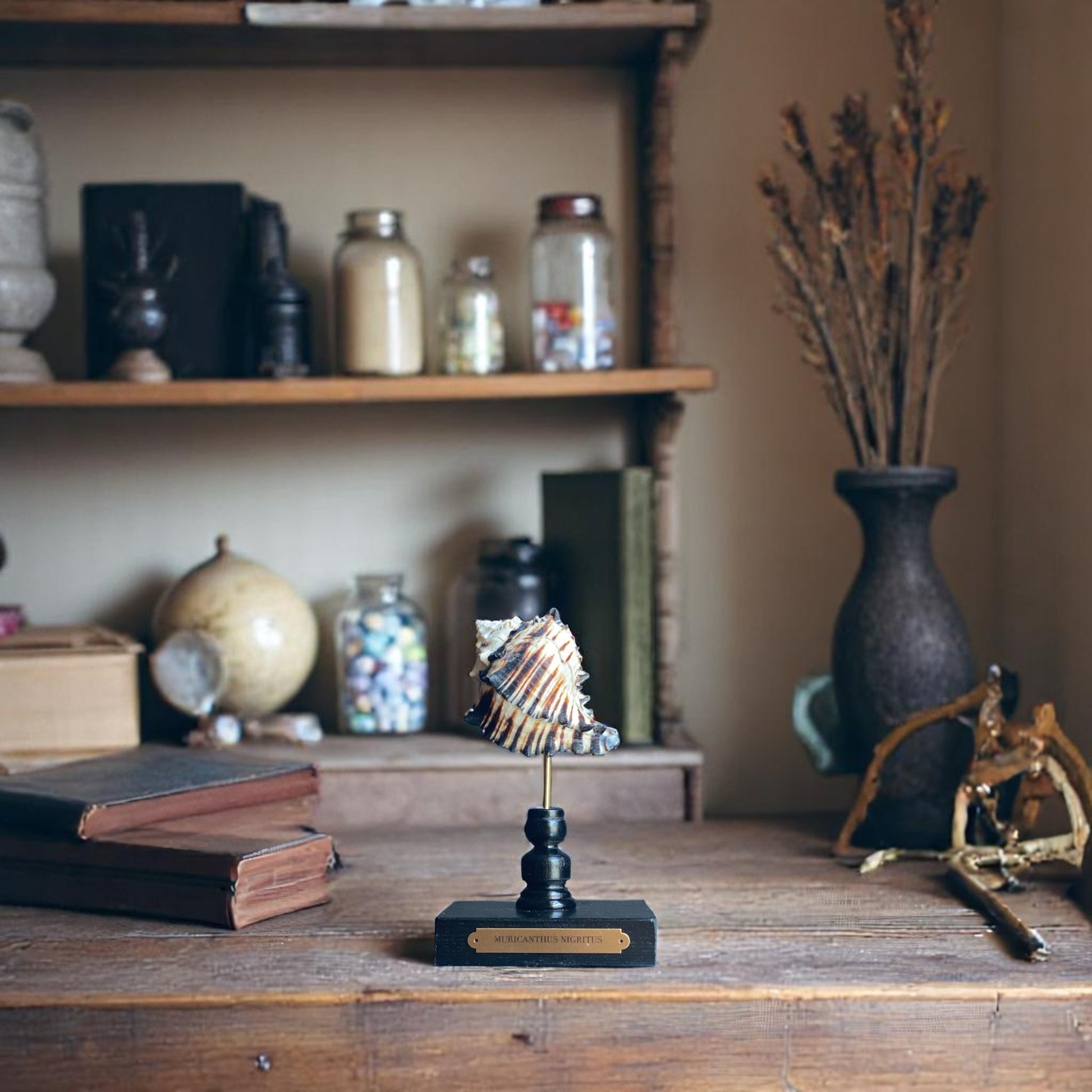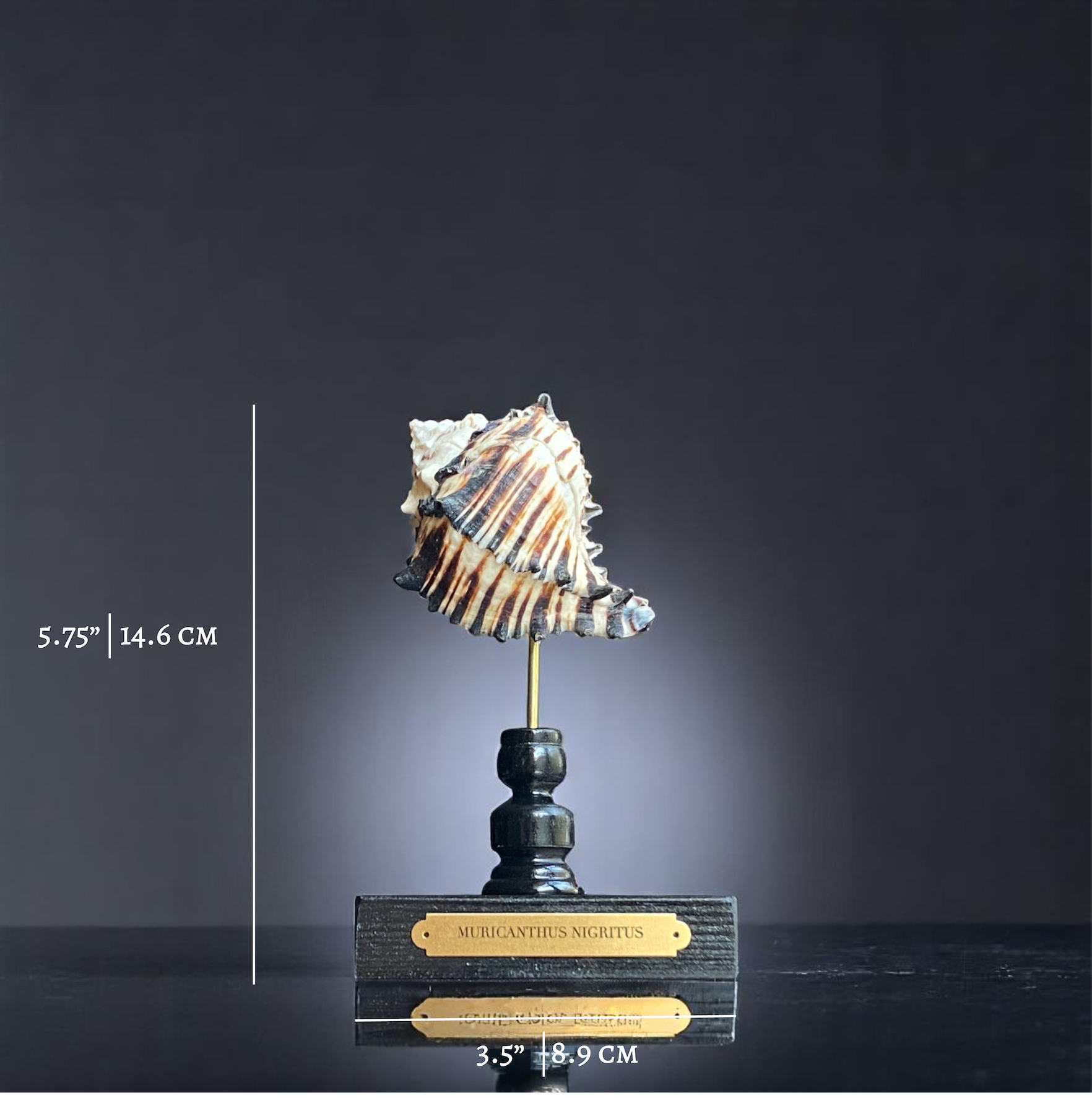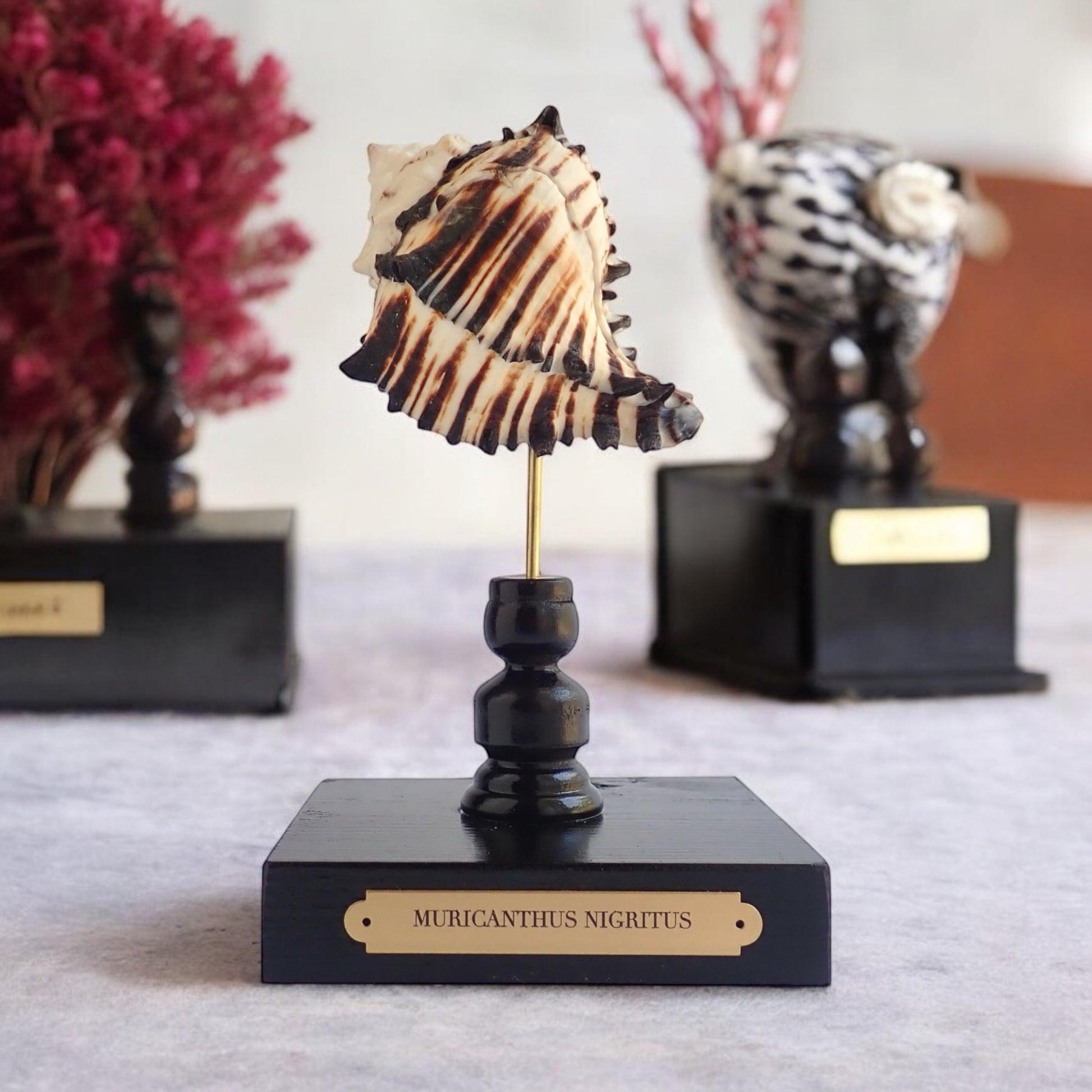 The Black Murex's coloration and spiny texture make it a standout display piece and when mounted on a glossy black stand with a brass plaque, it serves as an elegant centerpiece, showcasing the natural beauty of marine life.