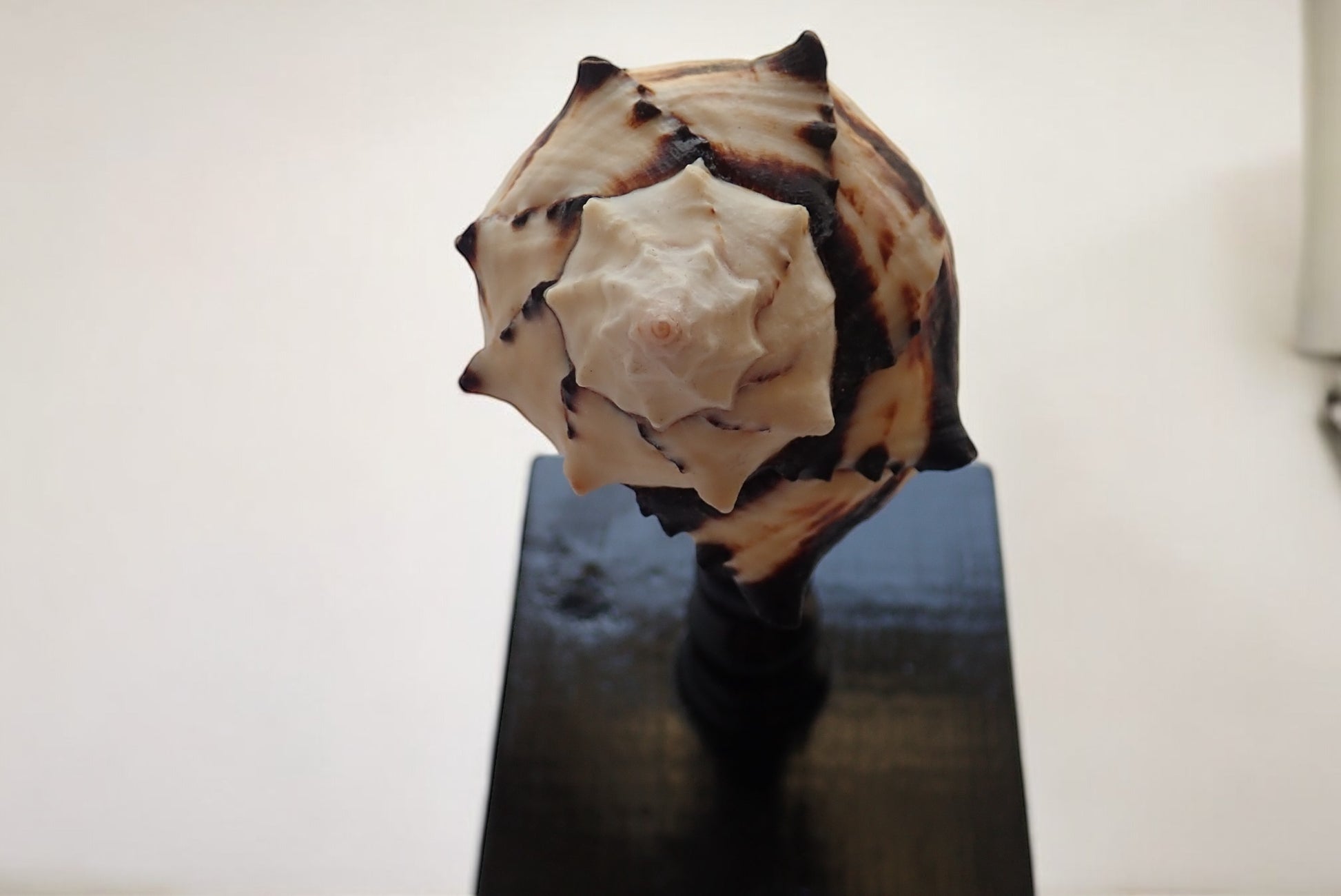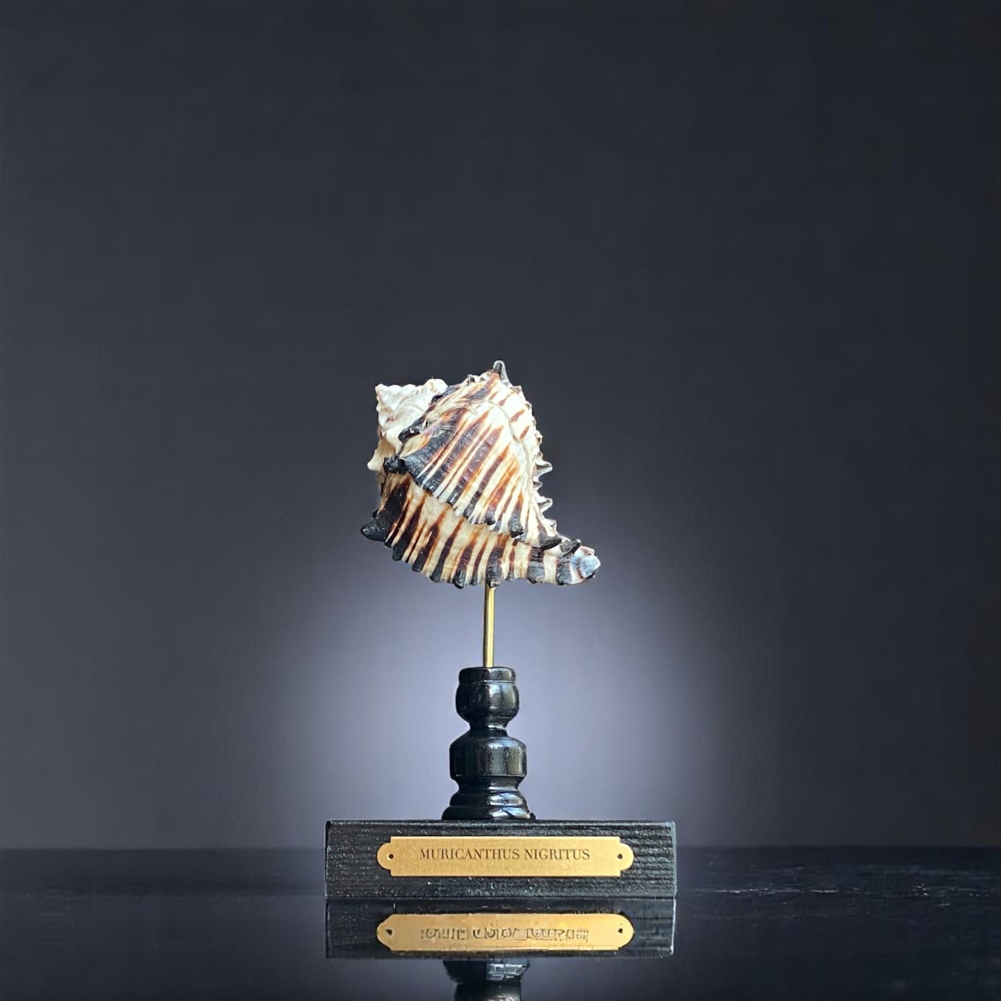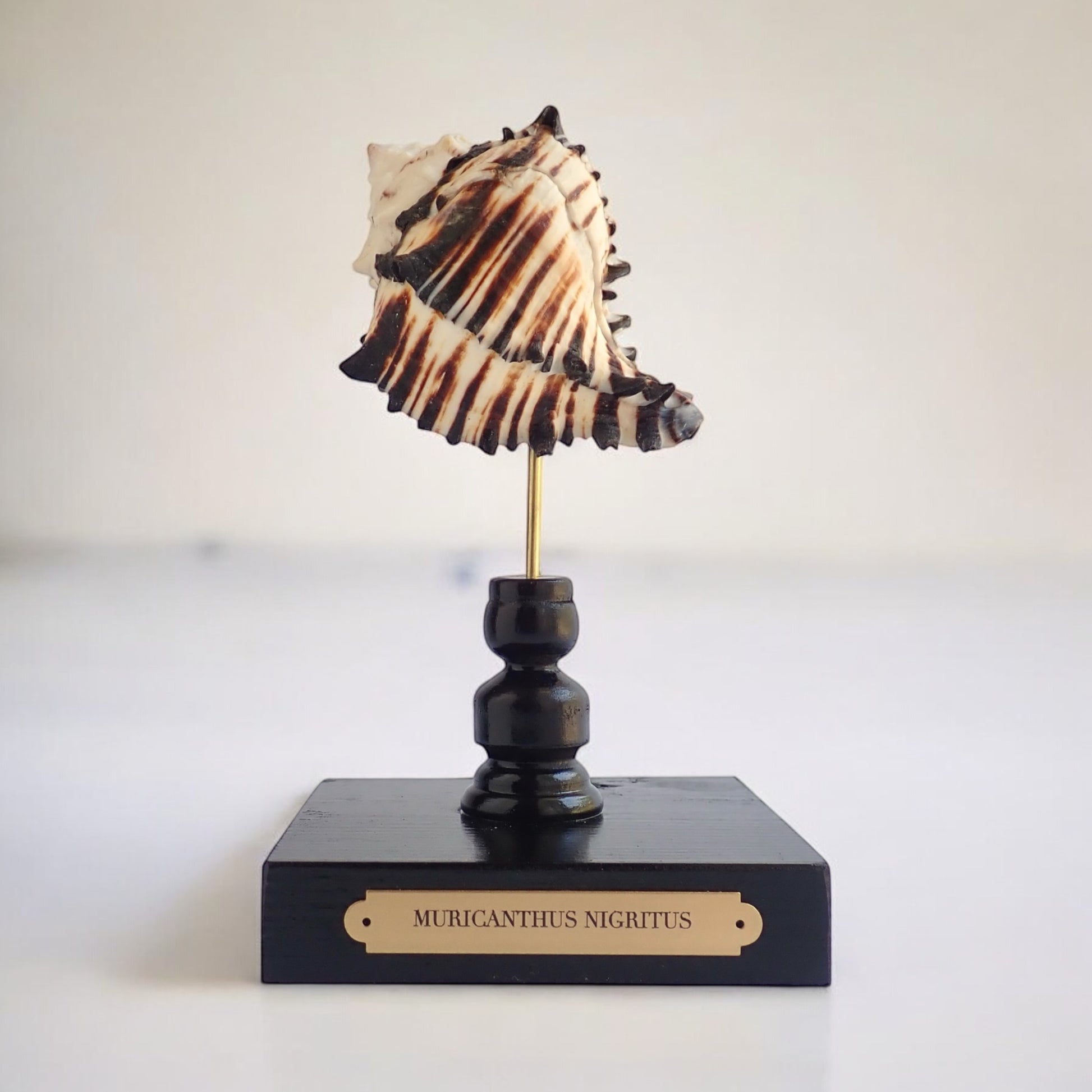 A stunning tropical shell displayed on a handmade glossy black stand with a brass plaque engraved with the Latin name for the species that called this shell its home.