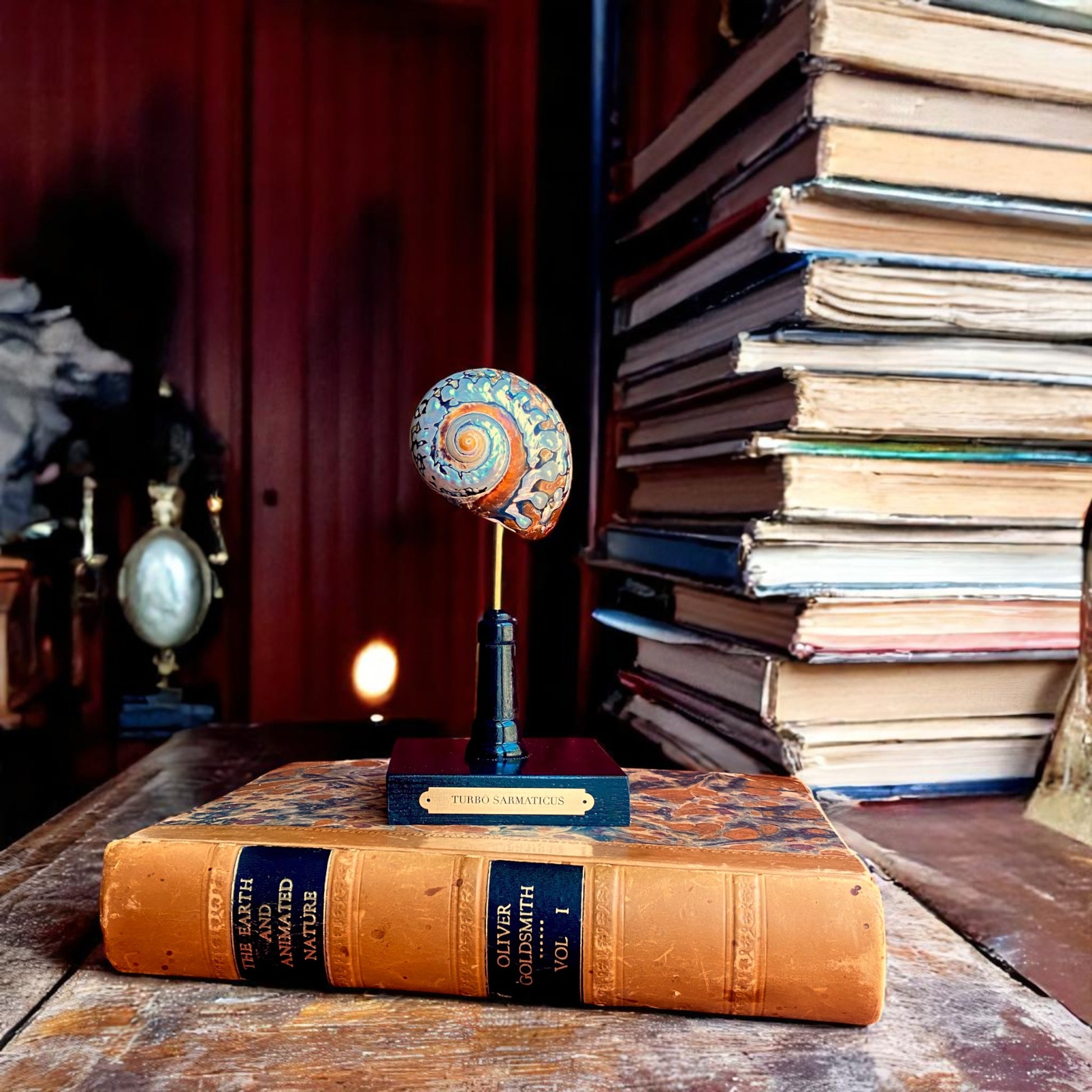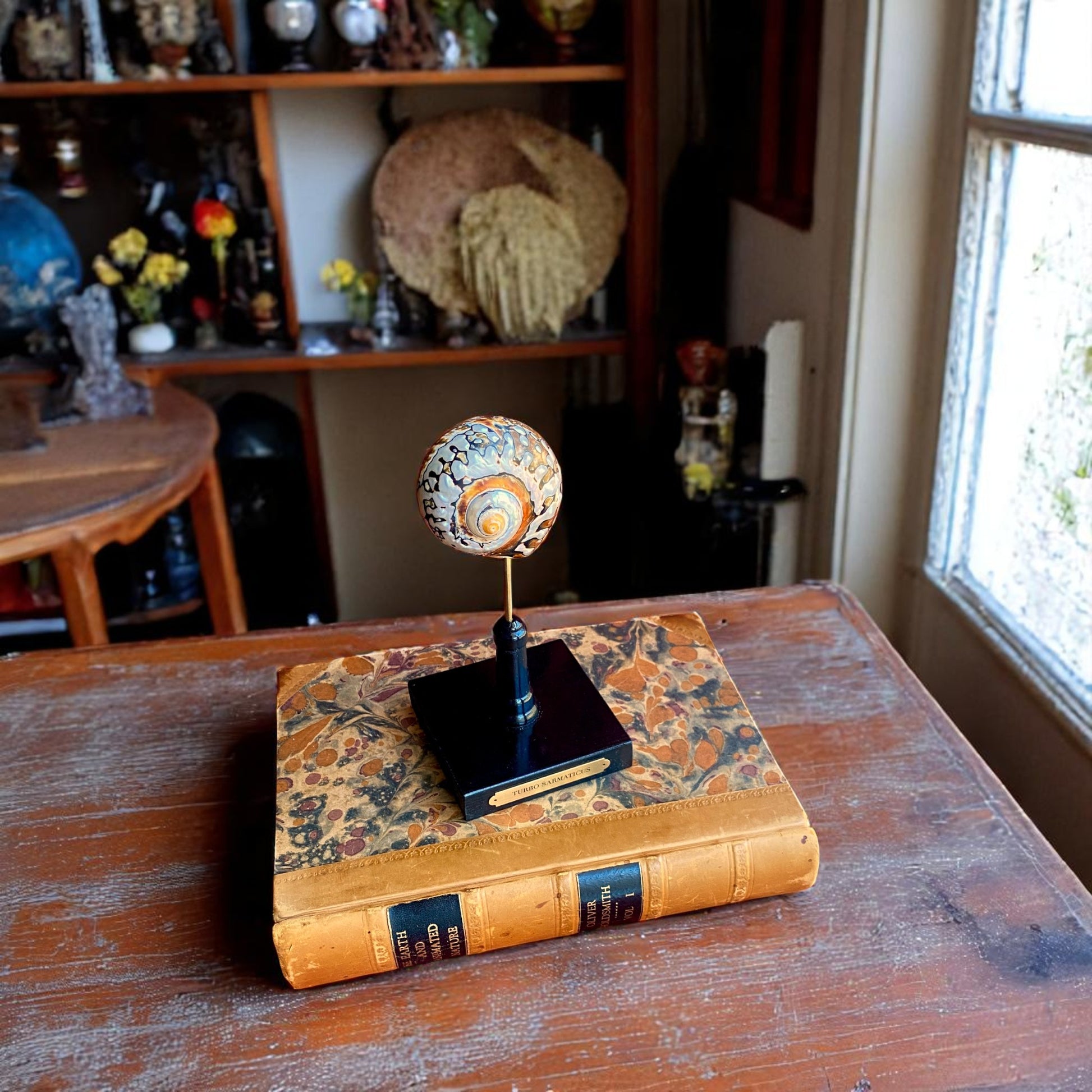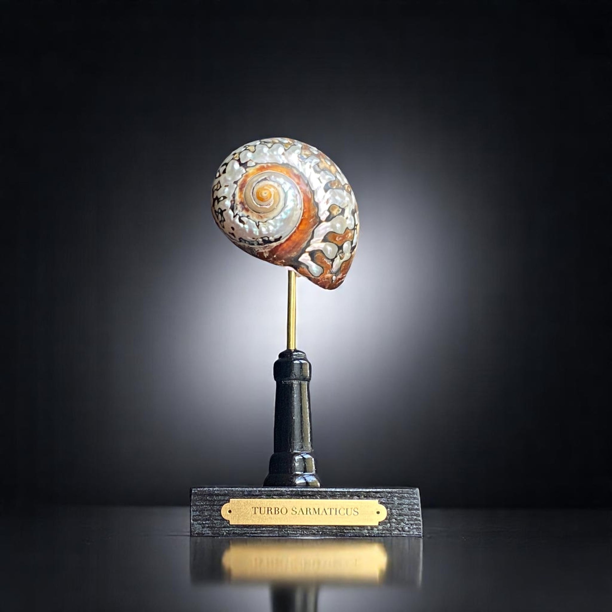 A stunning tropical shell displayed on a handmade glossy black stand with a brass plaque engraved with the Latin name for the species that called this shell its home.