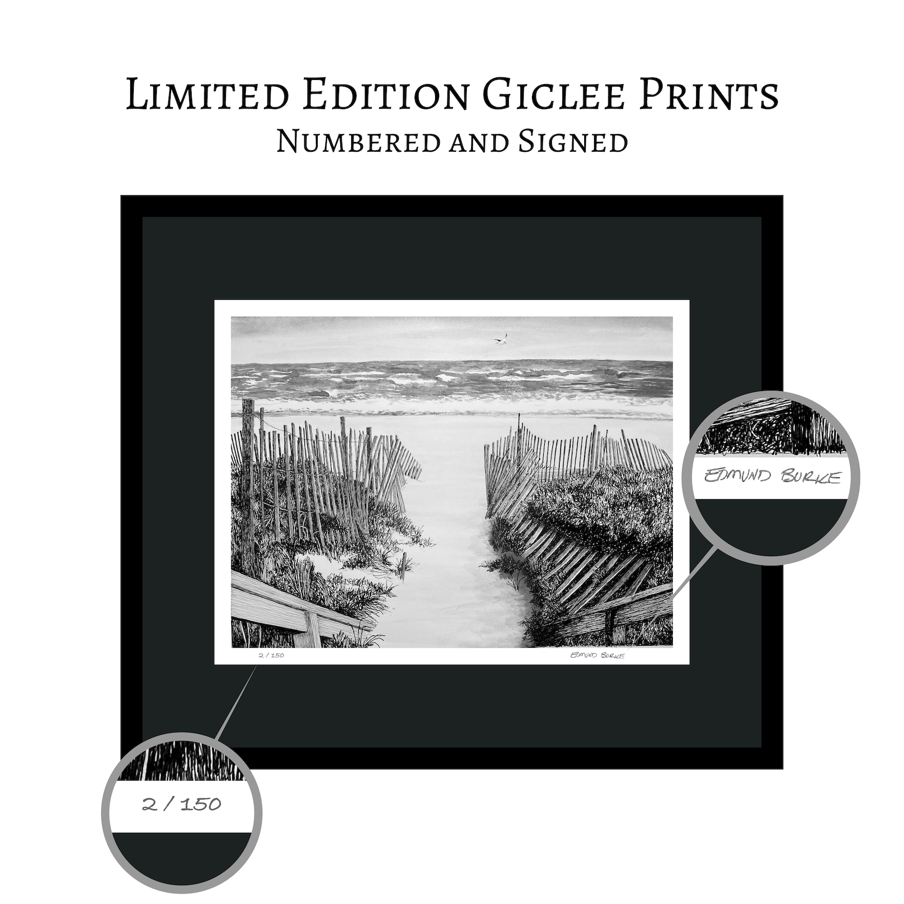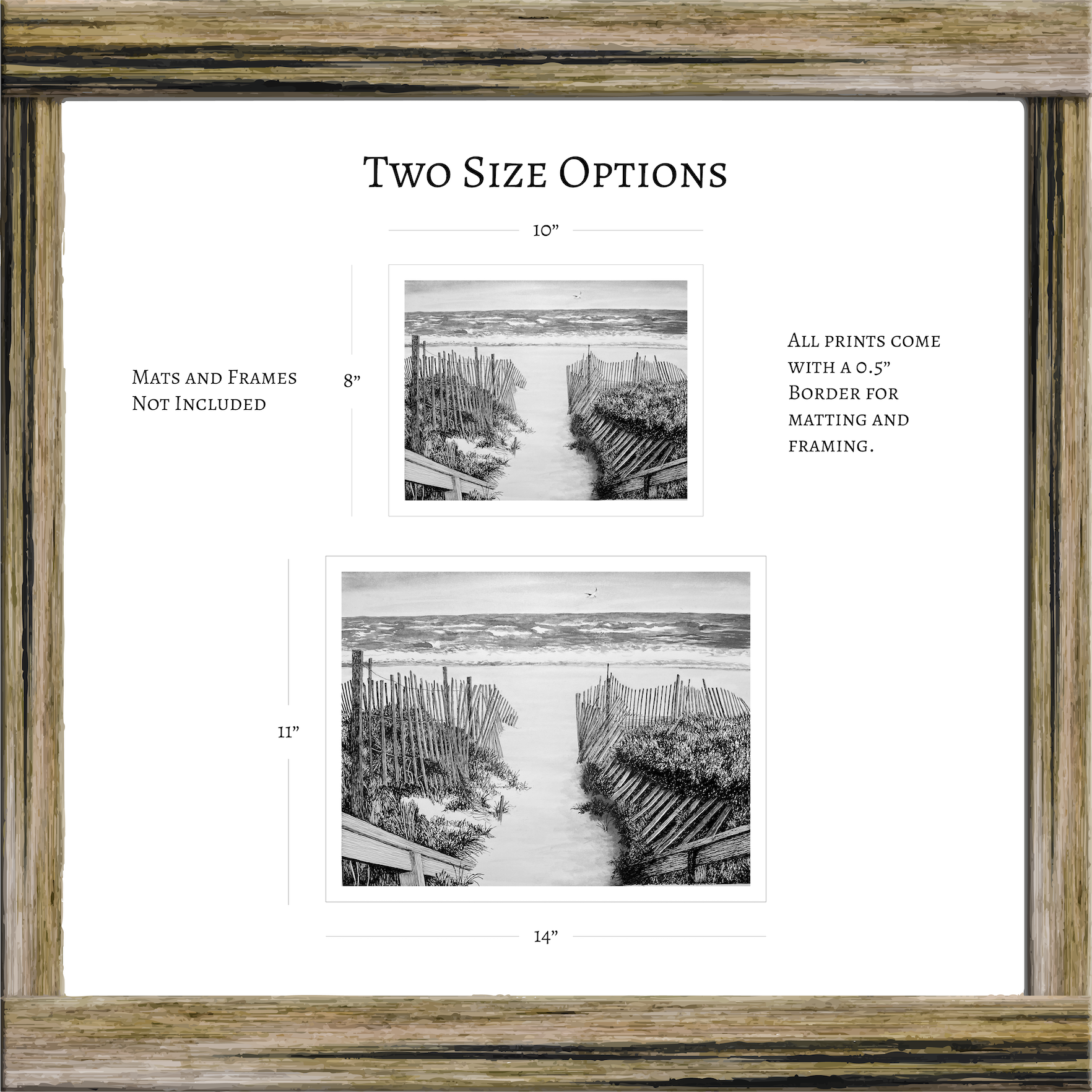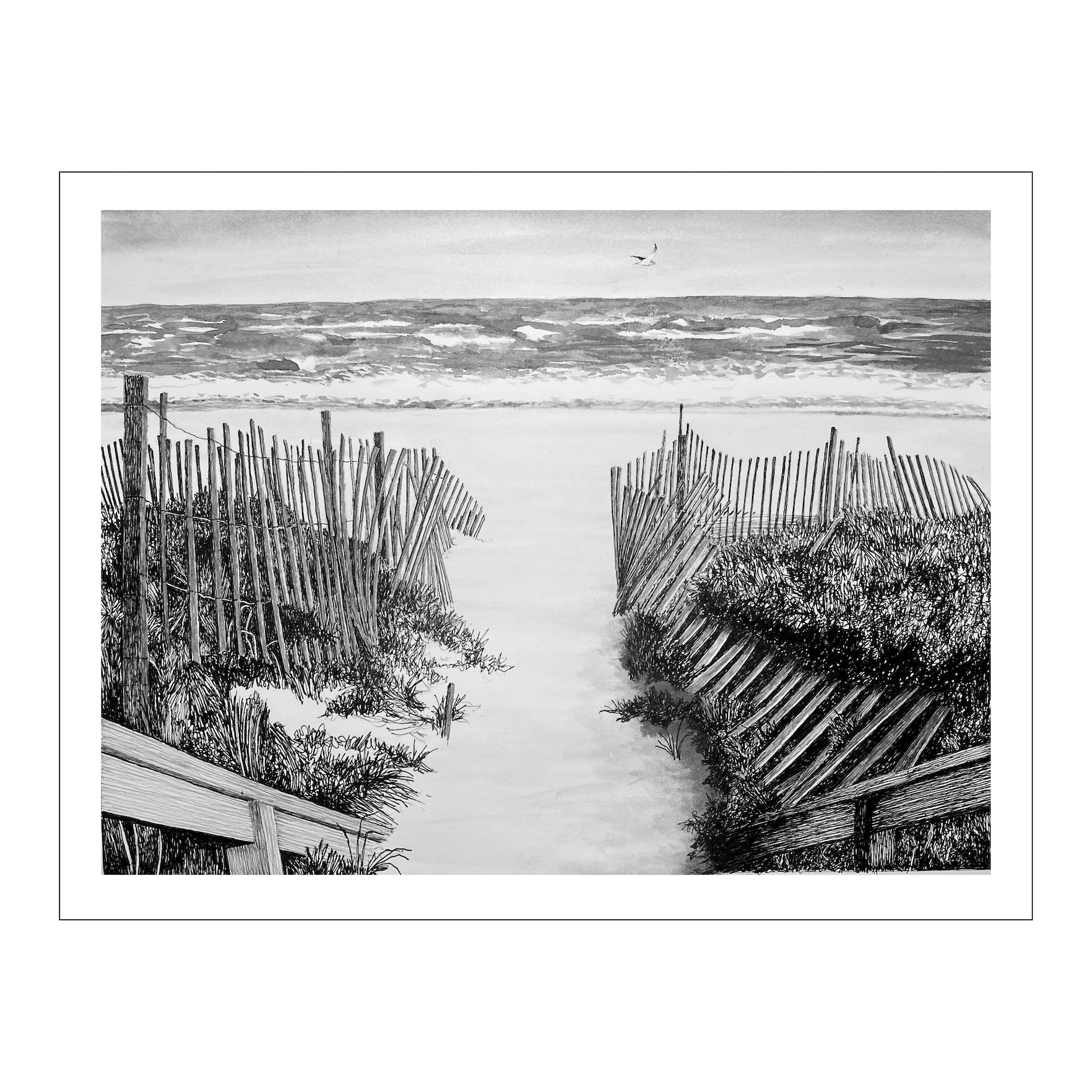 Step into the quiet beauty of Fire Island with this original pen & ink print capturing a classic beach access path winding through sand dunes and beach grass. Rendered in intricate line work, this black and white illustration evokes the timeless, peaceful essence of summer strolls to the shore.