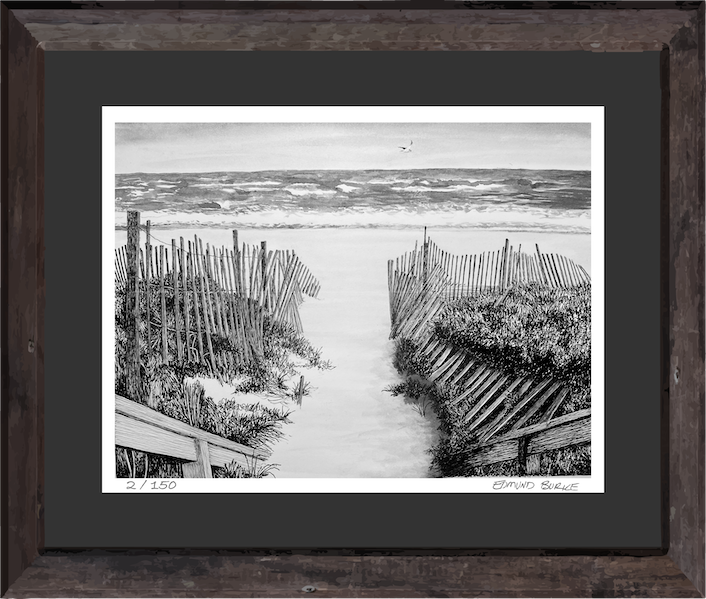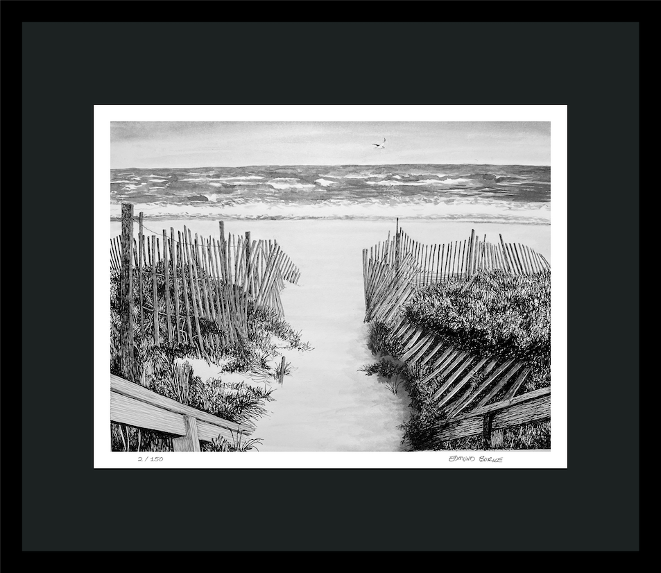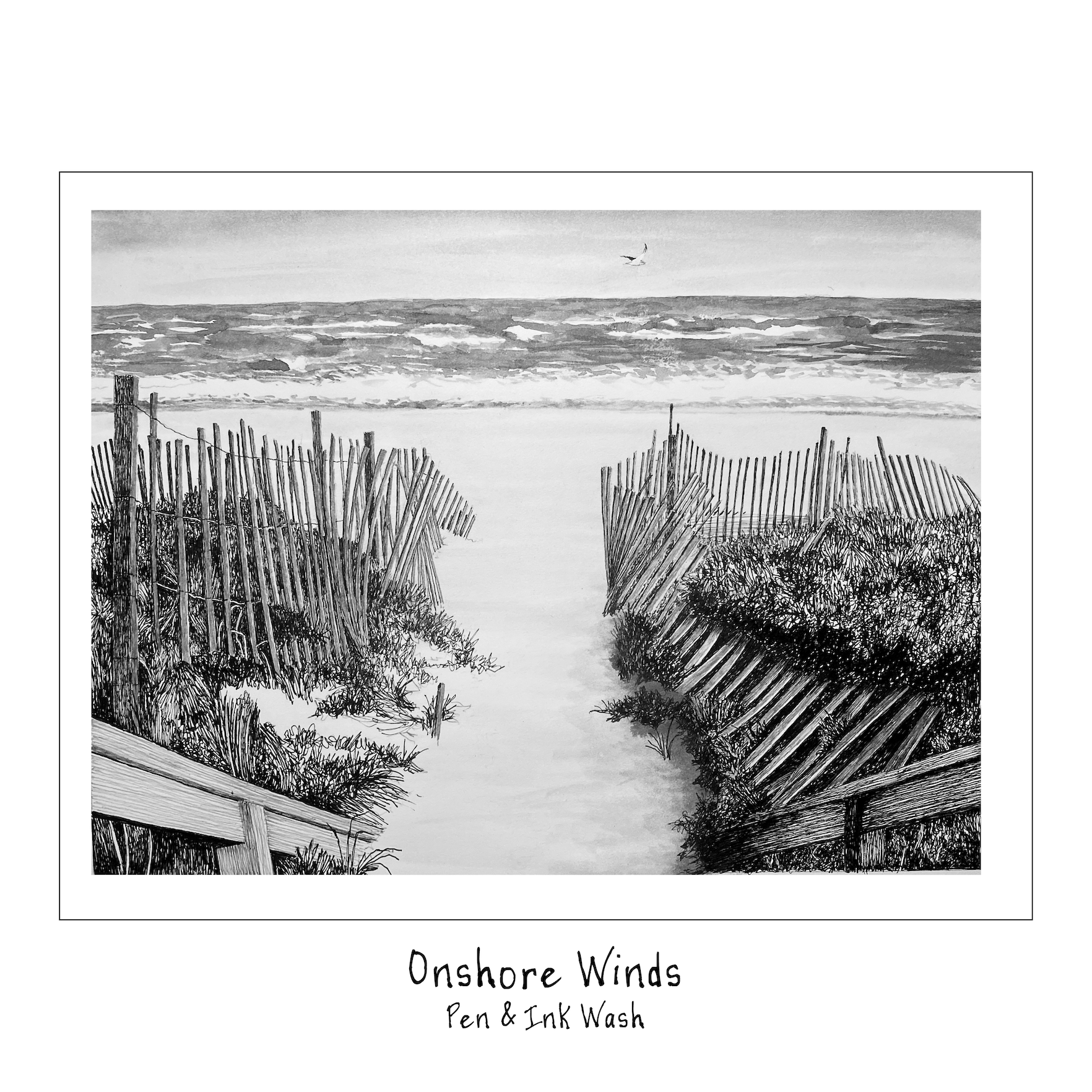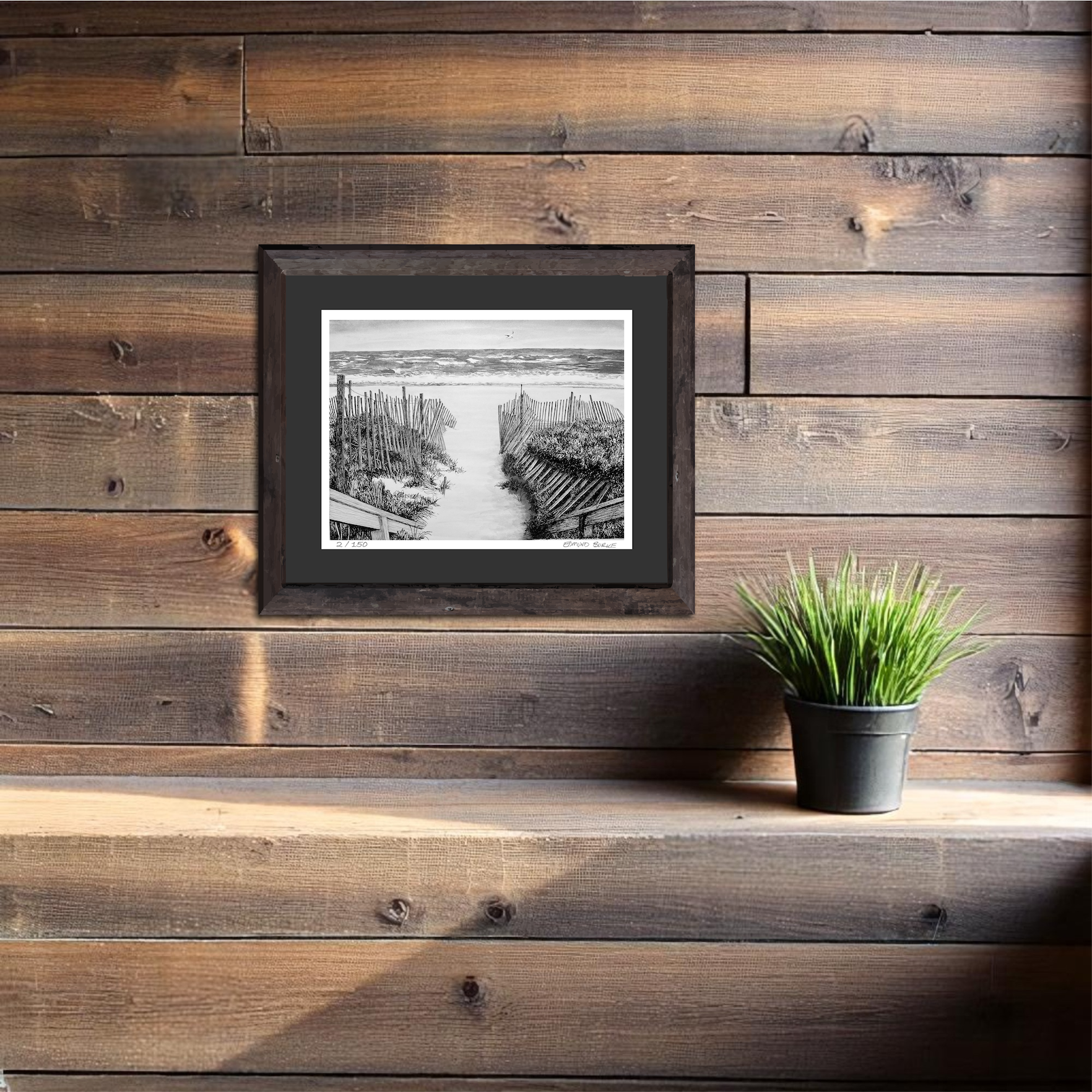 Step into the quiet beauty of Fire Island with this original pen & ink print capturing a classic beach access path winding through sand dunes and beach grass. Rendered in intricate line work, this black and white illustration evokes the timeless, peaceful essence of summer strolls to the shore.