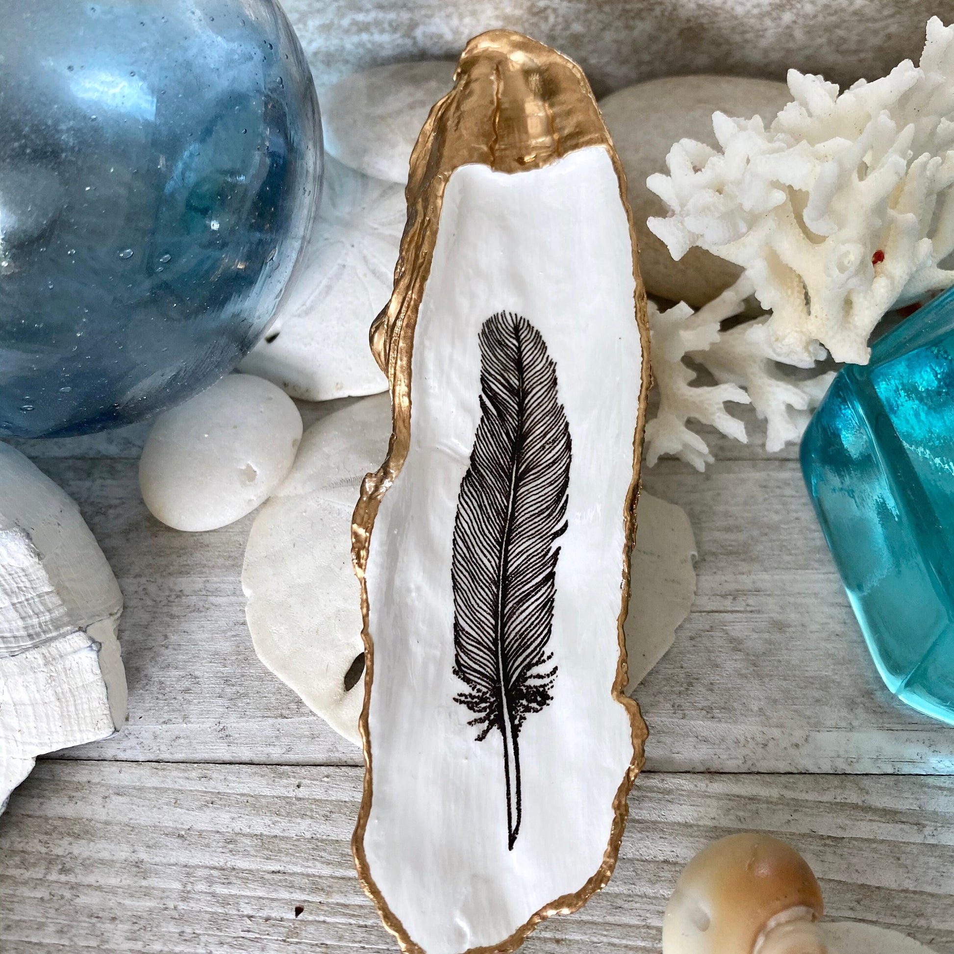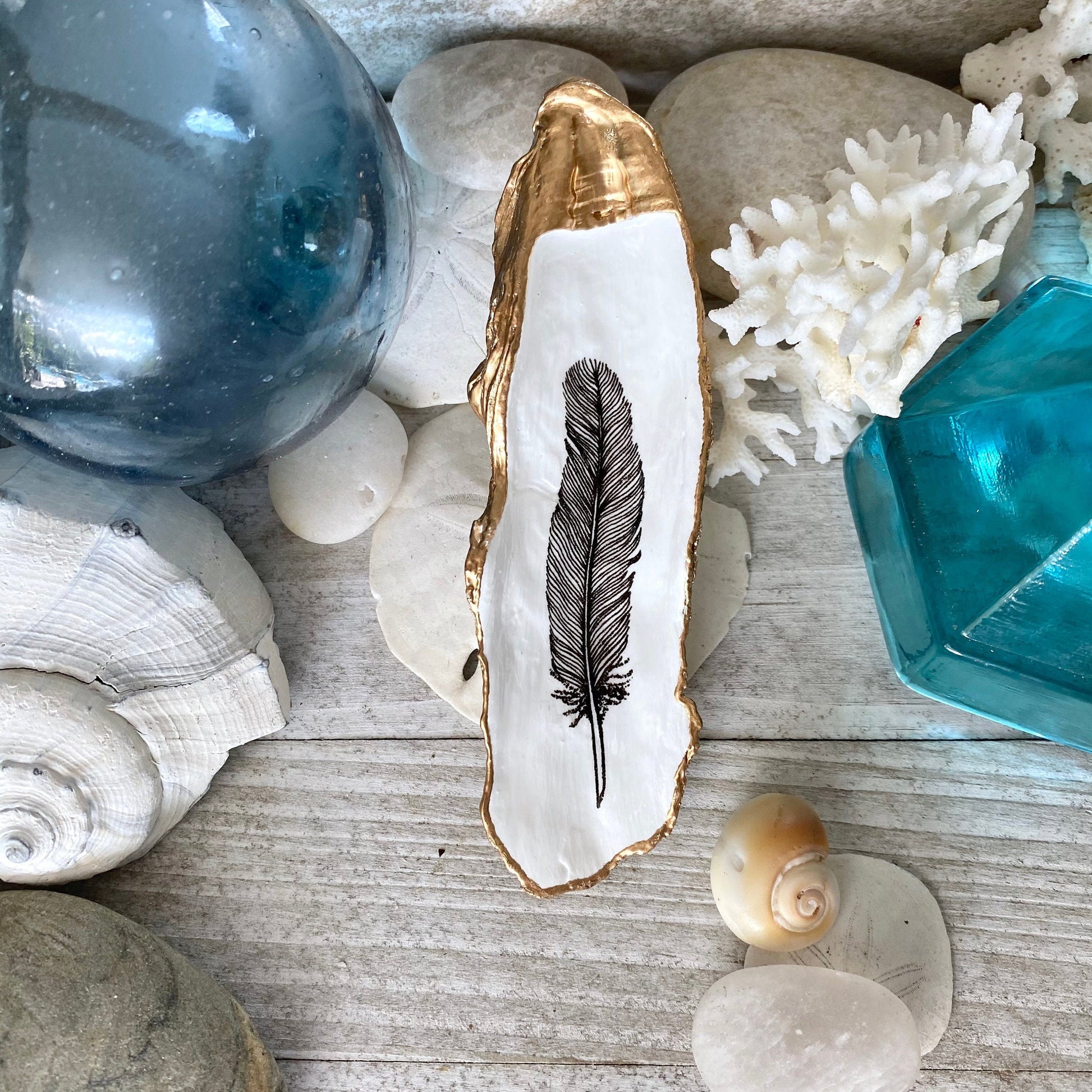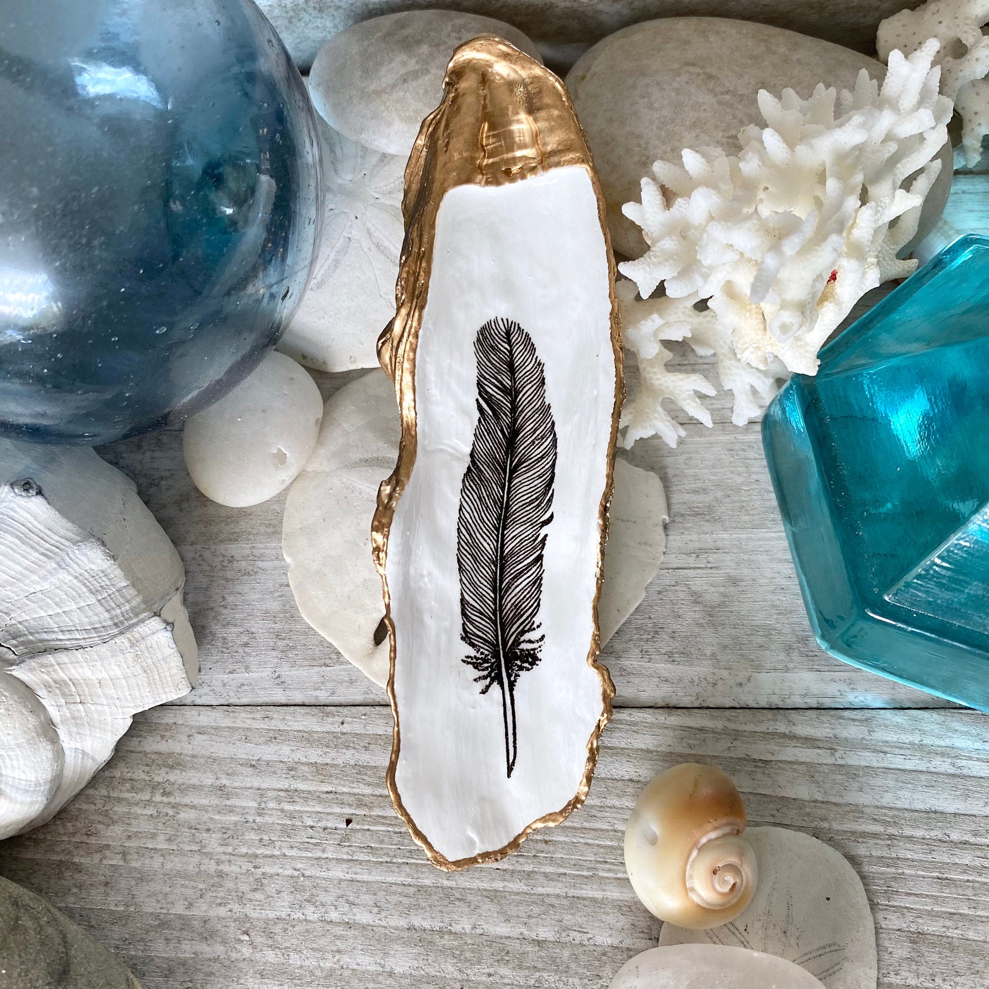 Decoupage Oyster Shell Jewelry Dish, Feather Design, Beach House Decor Accent