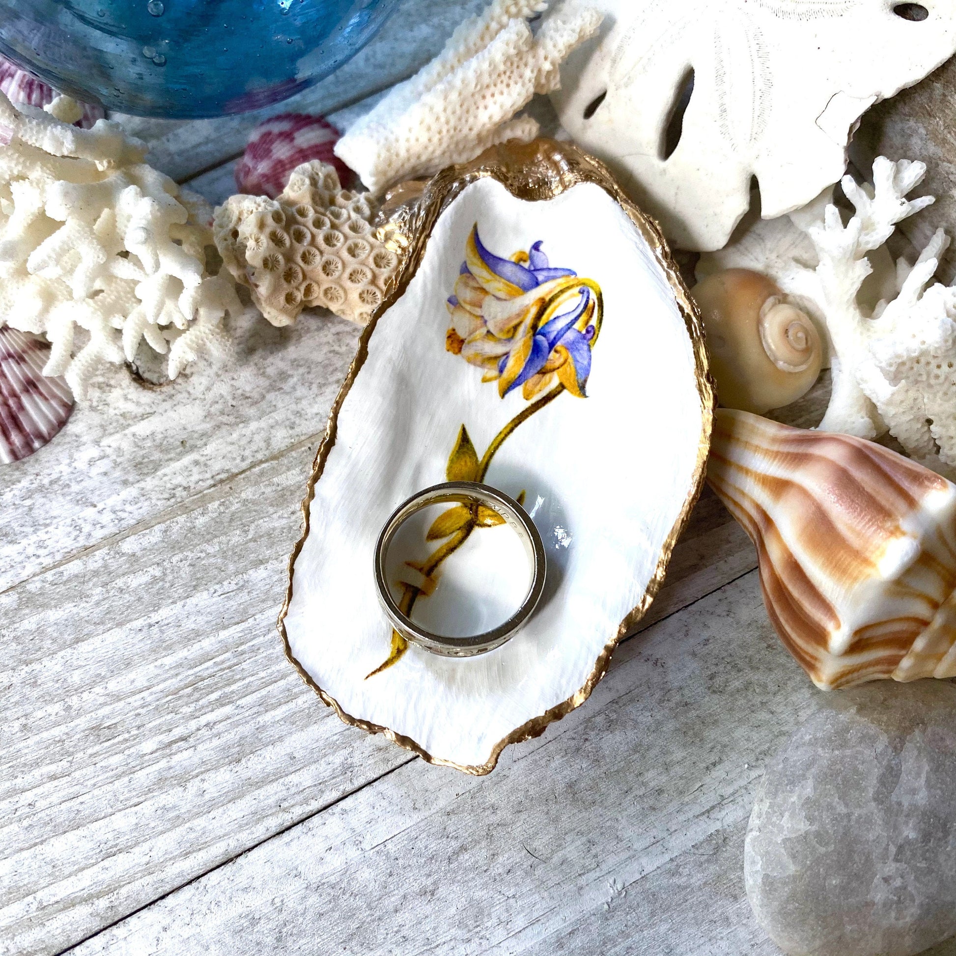 Decoupage Oyster Shell Trinket Dish Columbine Flower Art