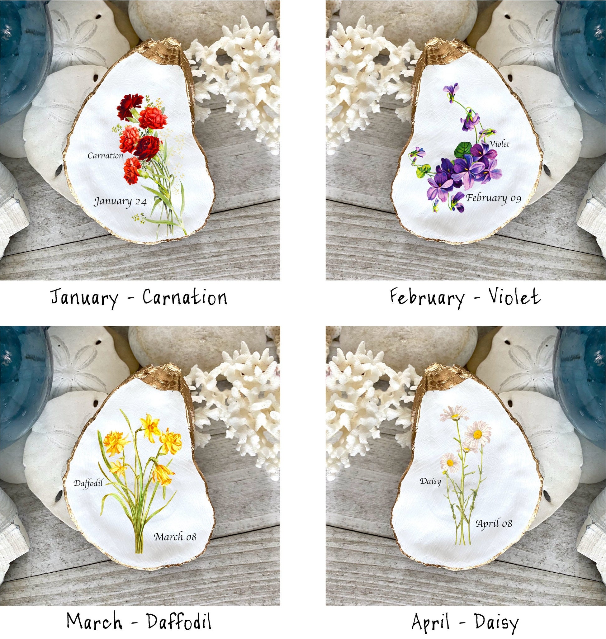 Personalized Birth Month Flower Jewelry Dishes crafted from natural oyster shells make the perfect birthday gift for all sea lovers.