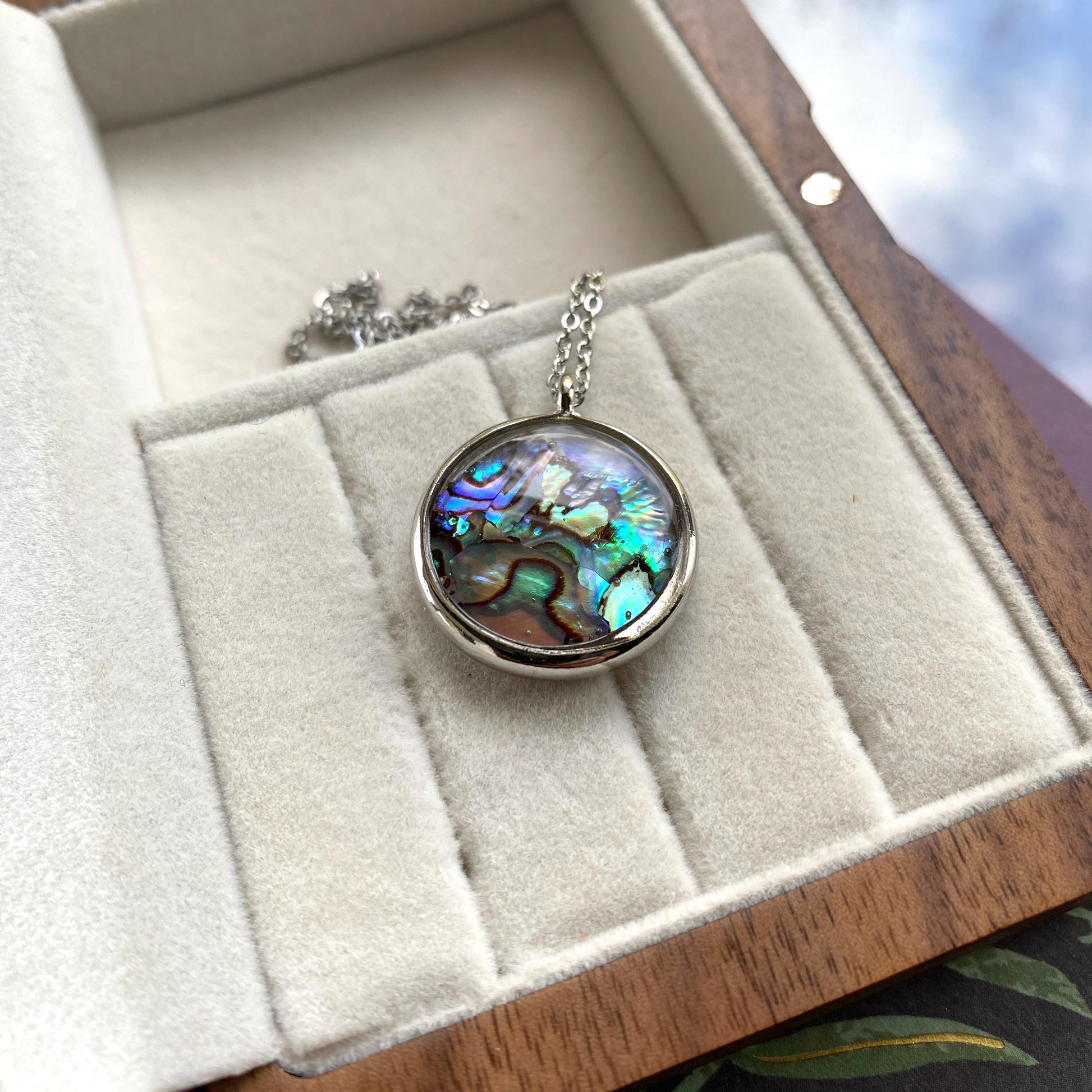 Captivating abalone shell shards, collected off the serene beaches on the Gulf Coast of Florida and pieced together to form a beautiful mosaic. No living creatures were harmed or displaced by the collection of these beauties. The shards are arranged inside a silver bezel and encased in a thick layer of resin. Would make an amazing and thoughtful gift for anyone who shares our fascination with the ocean and its creatures.