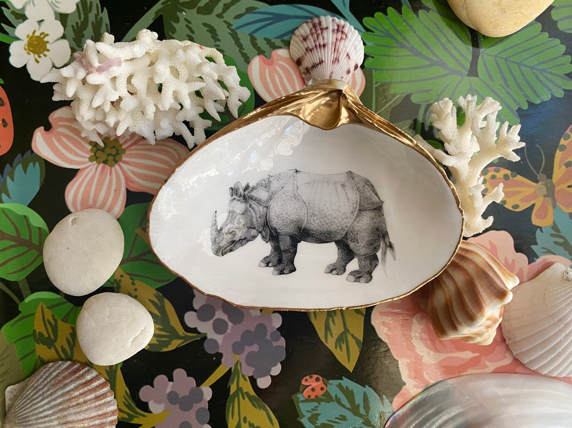 Rhinoceros Art Decoupage Clam Shell Ring Dish – Dürer-Inspired Nature Lover Gift