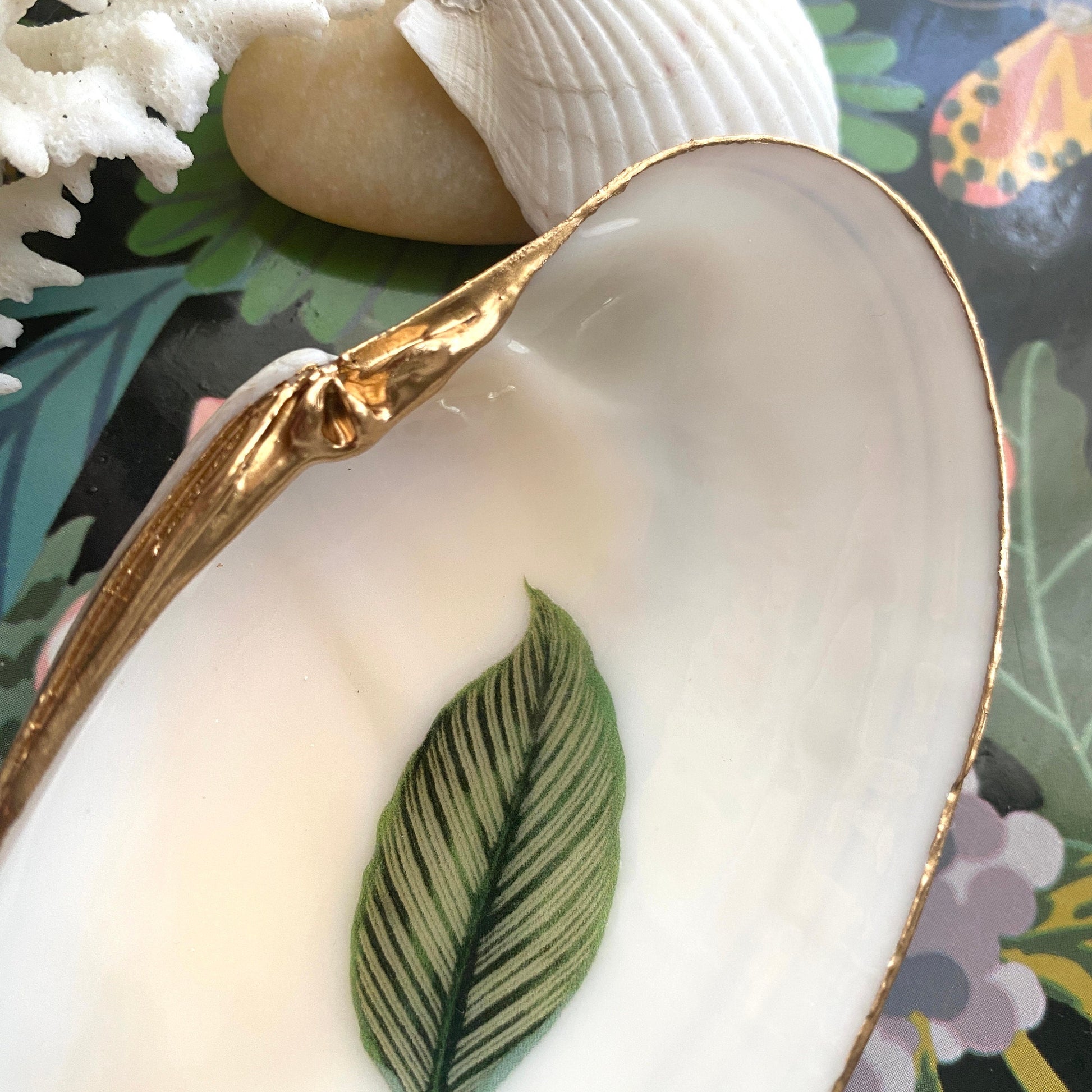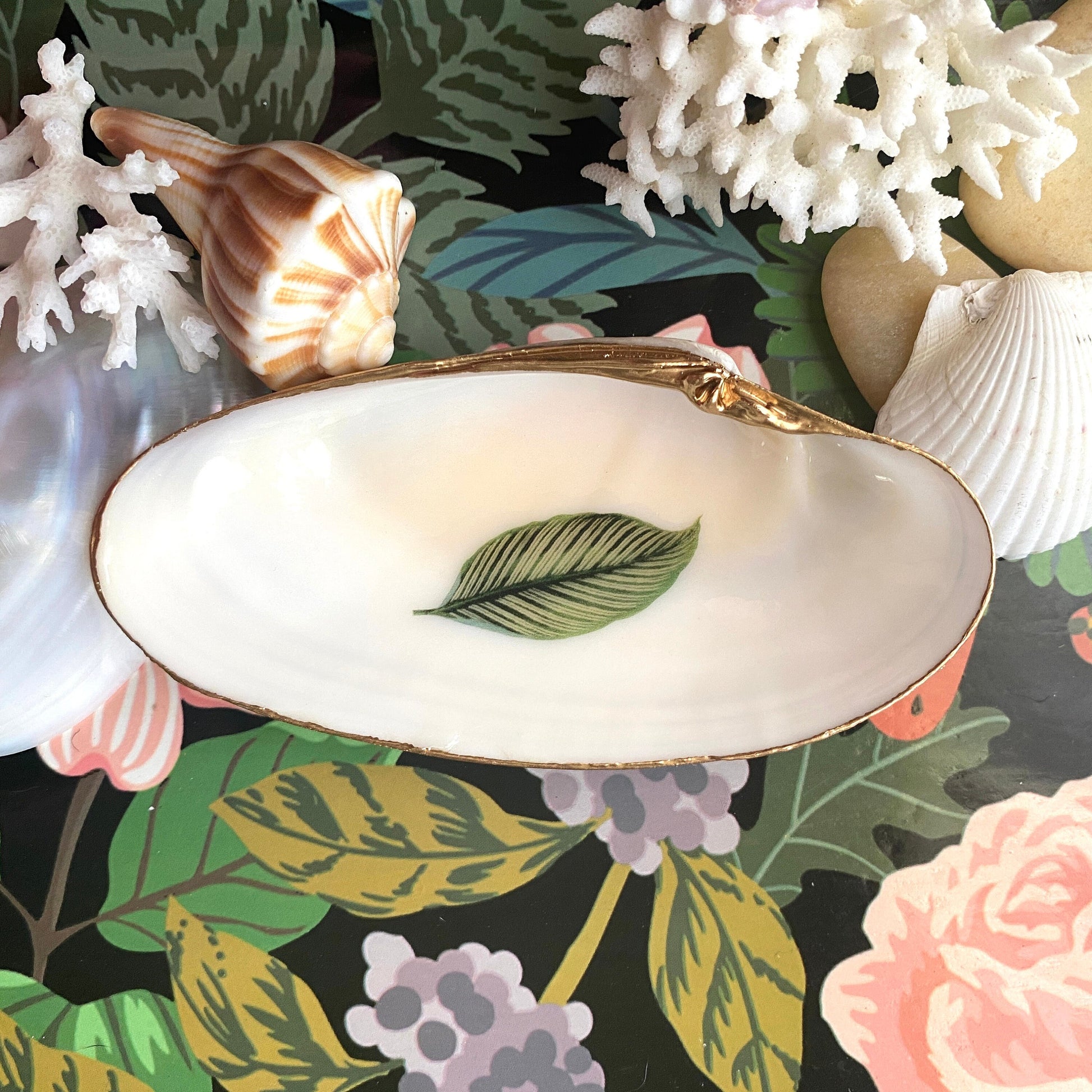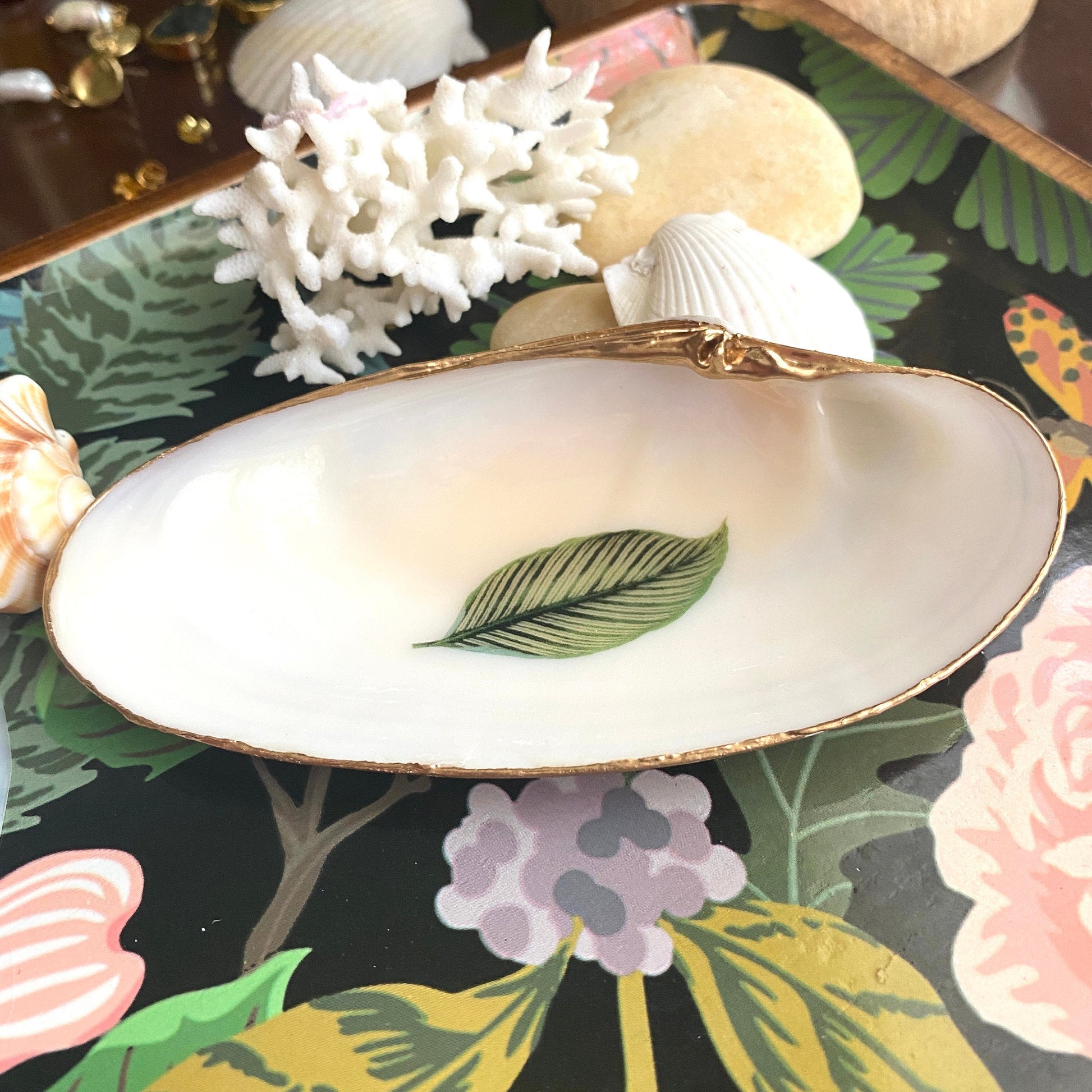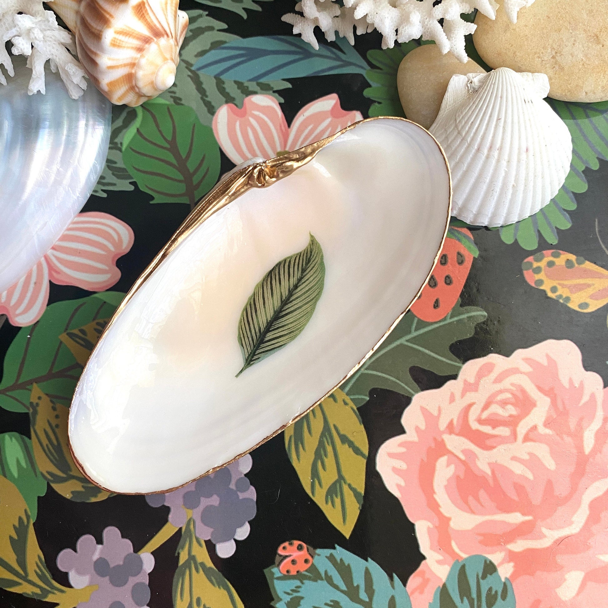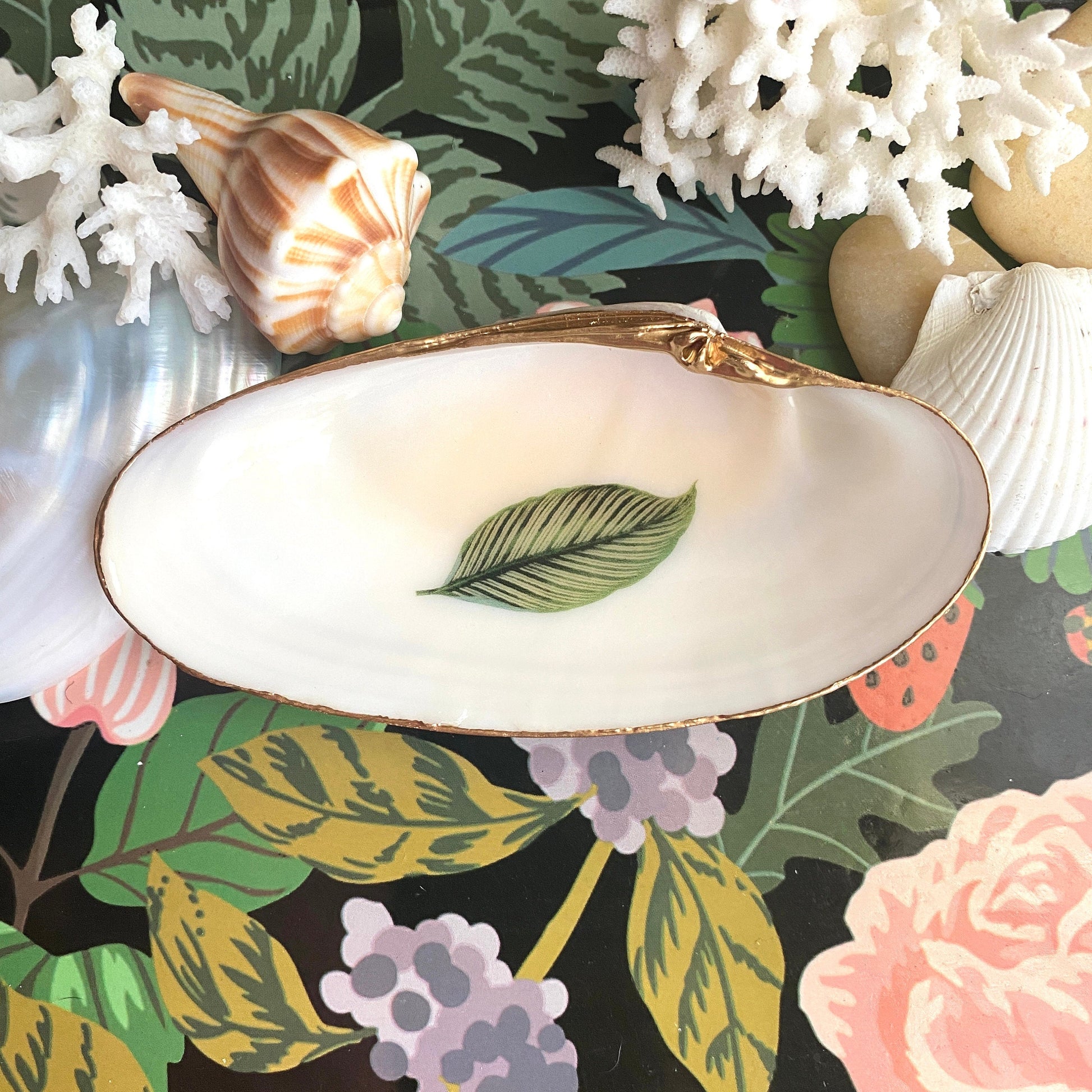 A delicate clam shell from Florida's Gulf Coast adorned with a lovely single leaf, sealed in a high gloss finish, and edged with a fine rim of liquid gold leaf. An elegant trinket dish. Perfect for gifting for bridesmaids, housewarming, or any occasion.