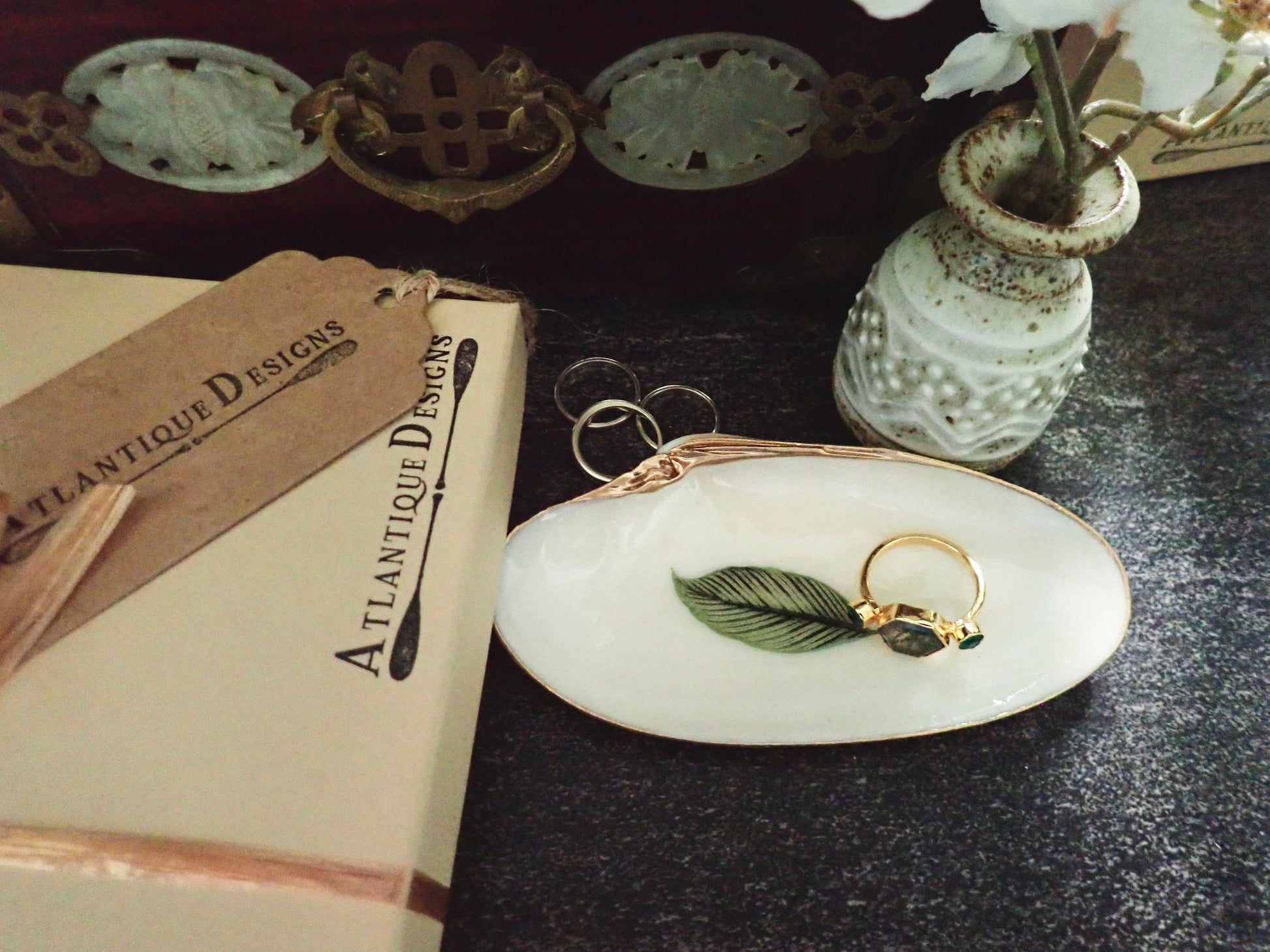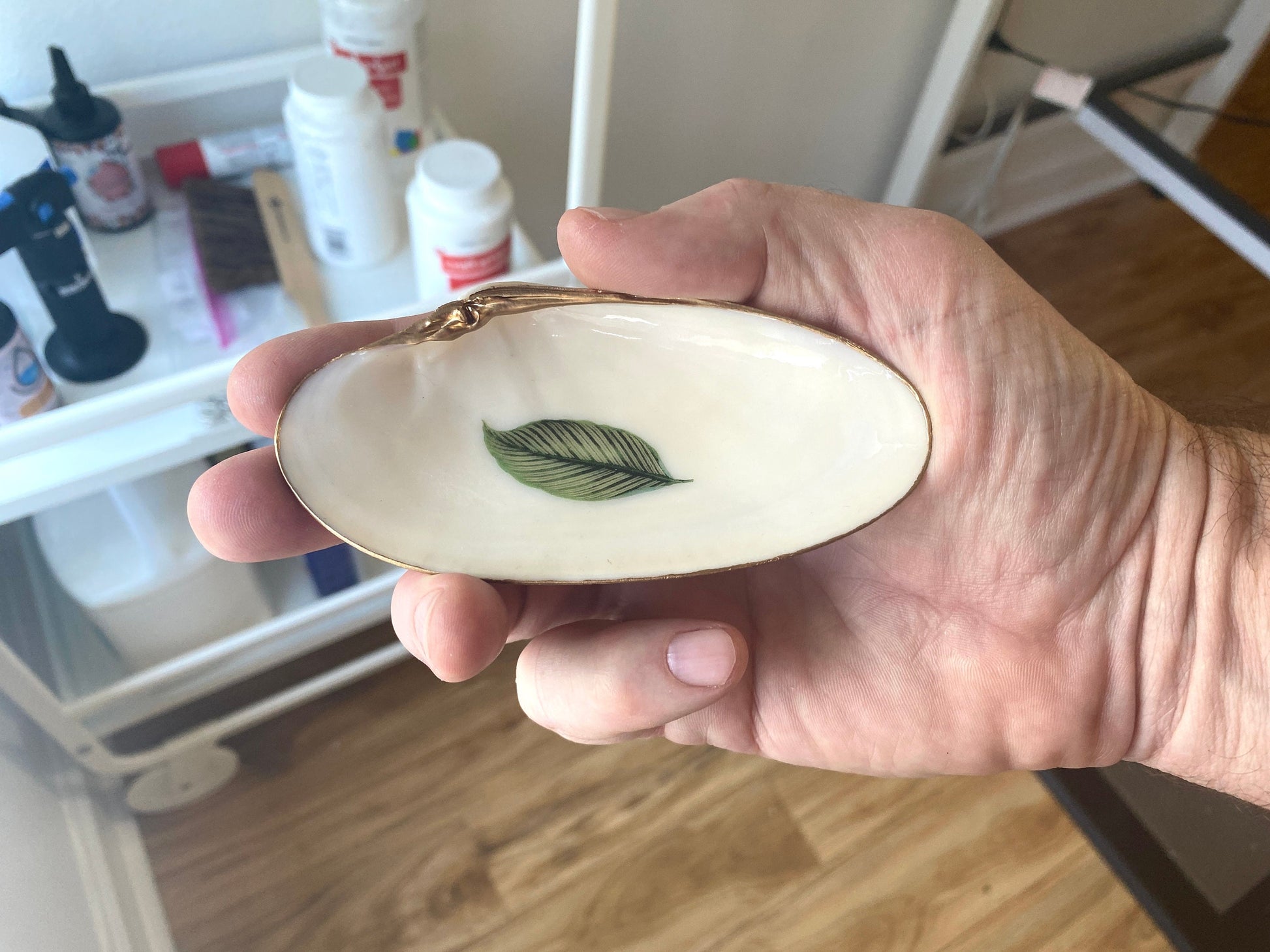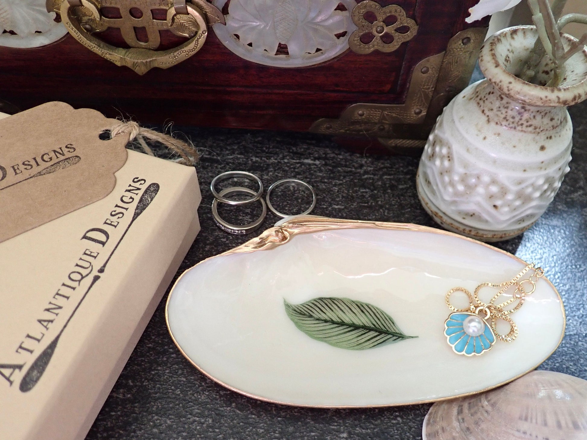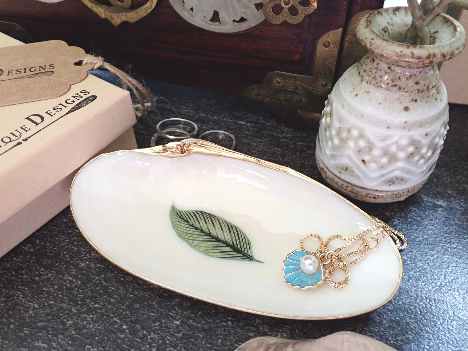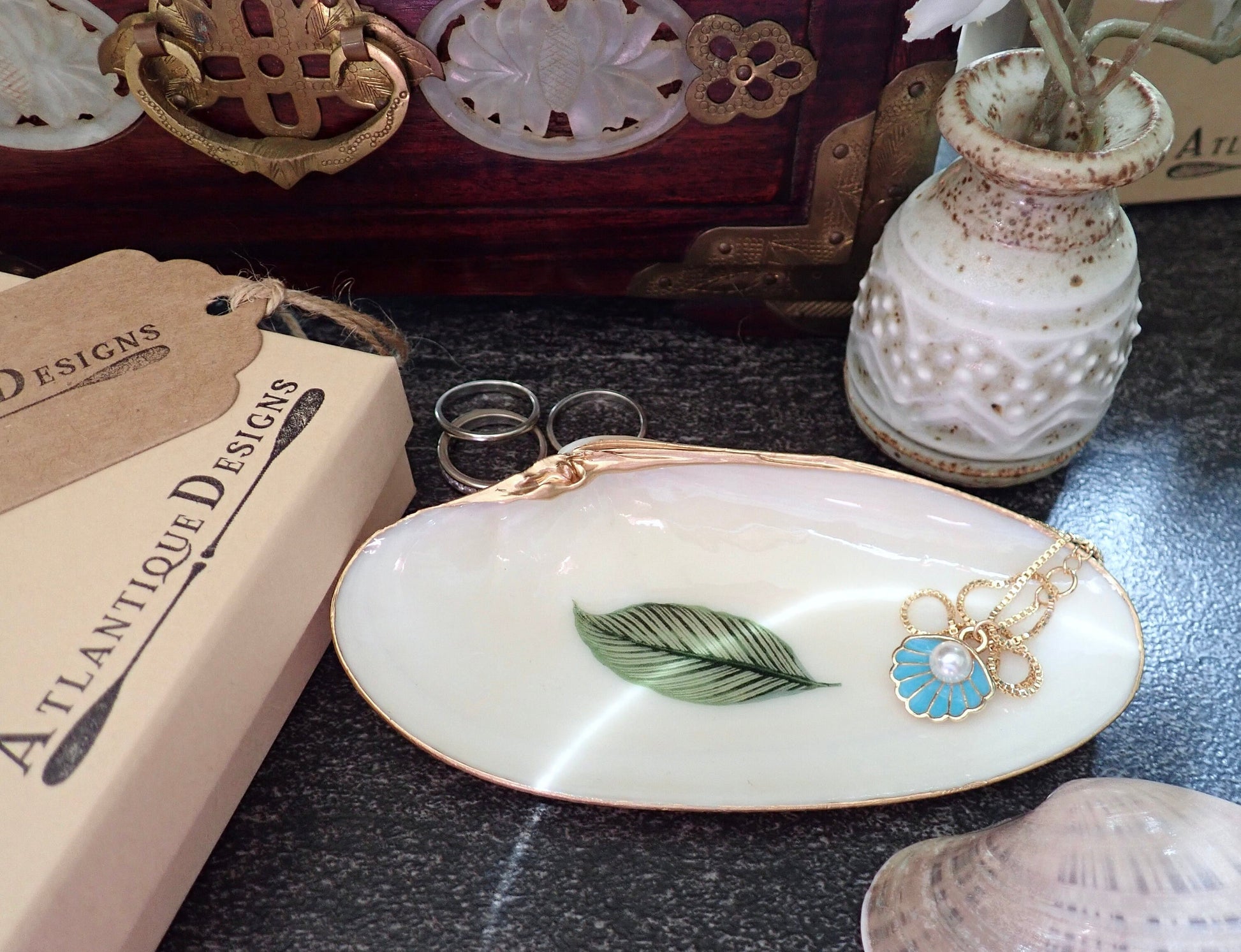 A delicate clam shell from Florida's Gulf Coast adorned with a lovely single leaf, sealed in a high gloss finish, and edged with a fine rim of liquid gold leaf. An elegant trinket dish. Perfect for gifting for bridesmaids, housewarming, or any occasion.