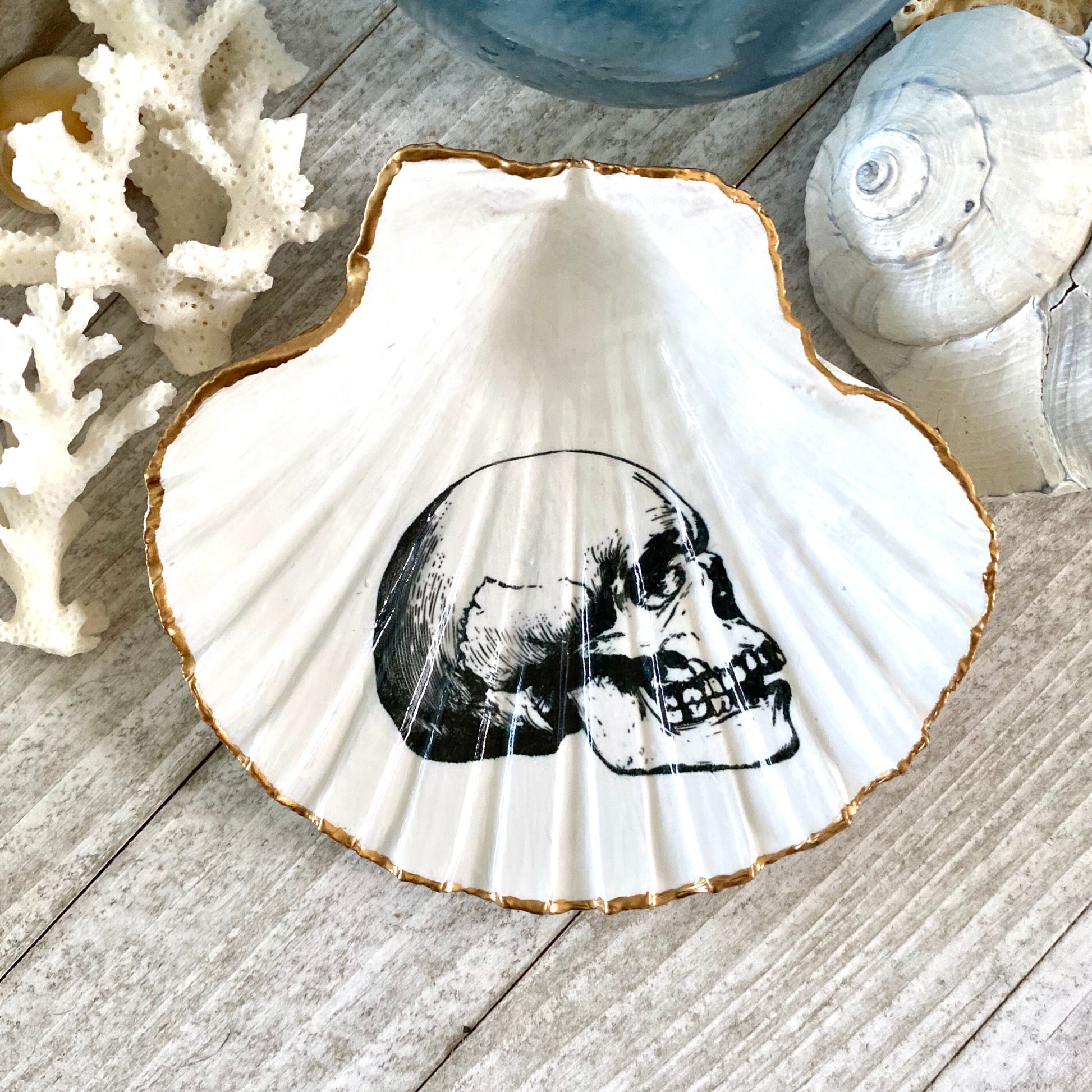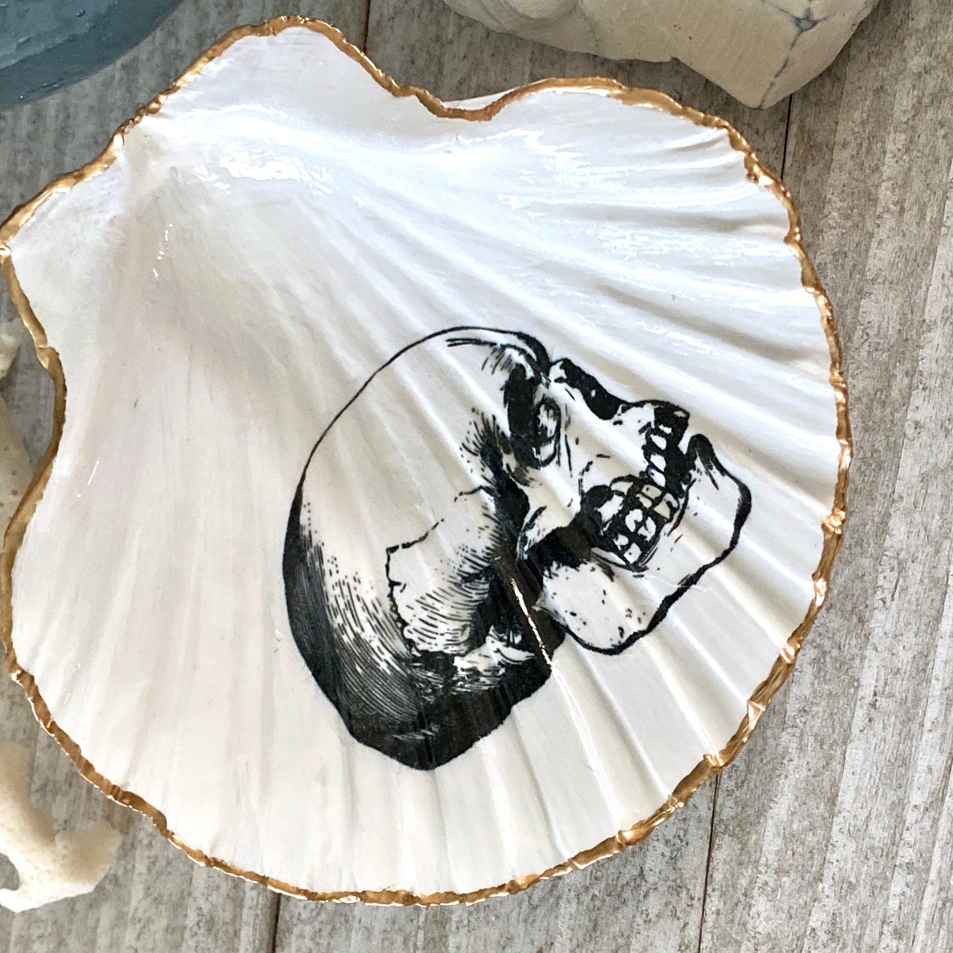 Decoupage Scallop Shell Trinket Dish Skull Art