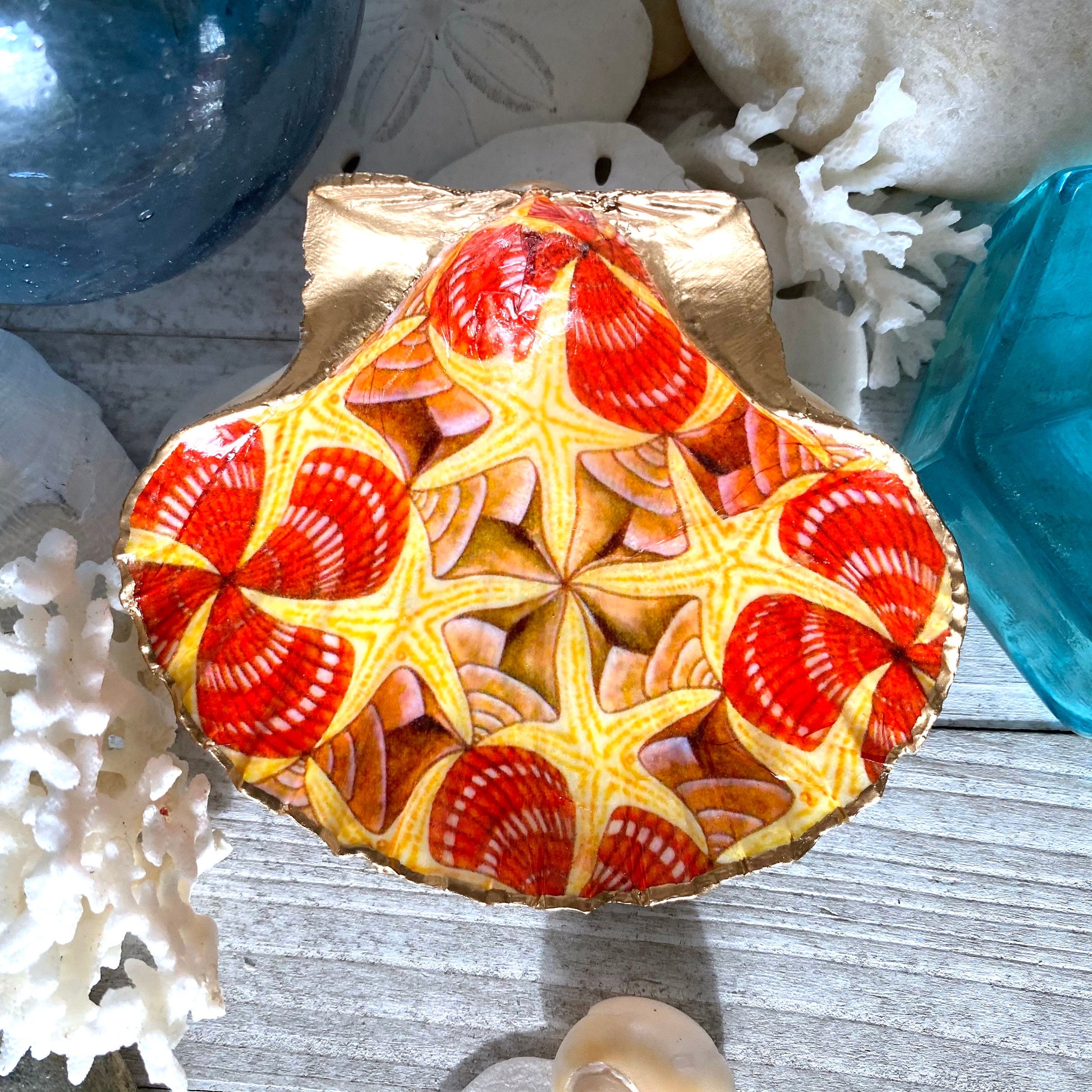 These decoupaged shells are hand-crafted with a fine level of detail. Images are carefully set on a base of white or pearl paint and sealed with multiple layers of lacquer to give a refined porcelain feel and look to them. A delicate edging of liquid gold leaf gives the finishing touch. Shell backs are left in their beautiful and natural state. These shells are thoroughly cleaned with soap and water - no harsh chemicals used.