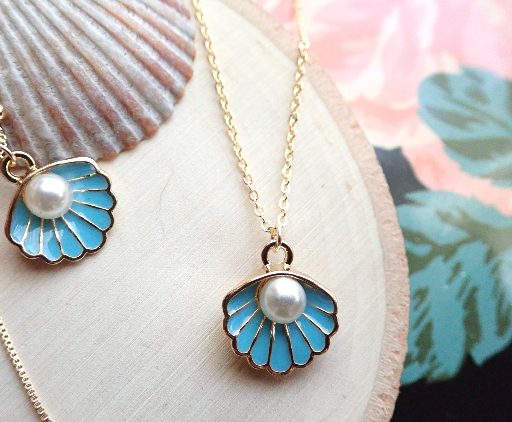 ★Dimensions- 14k gold plated scallop shell with light blue enamel and faux 6mm pearl. The pendant is 15mm wide by 16mm tall including the loop at the top.
