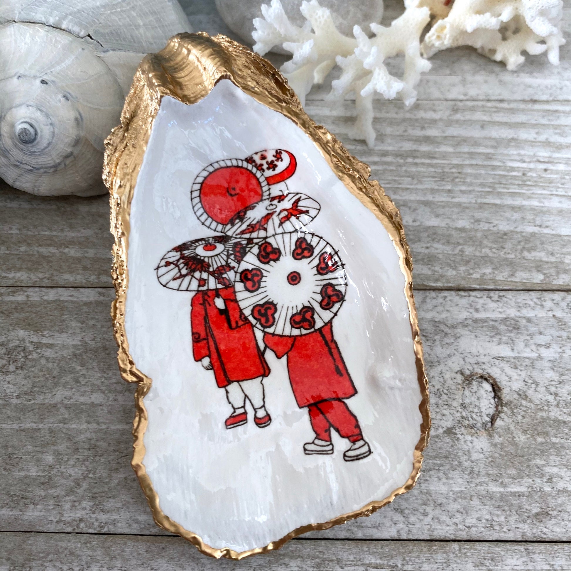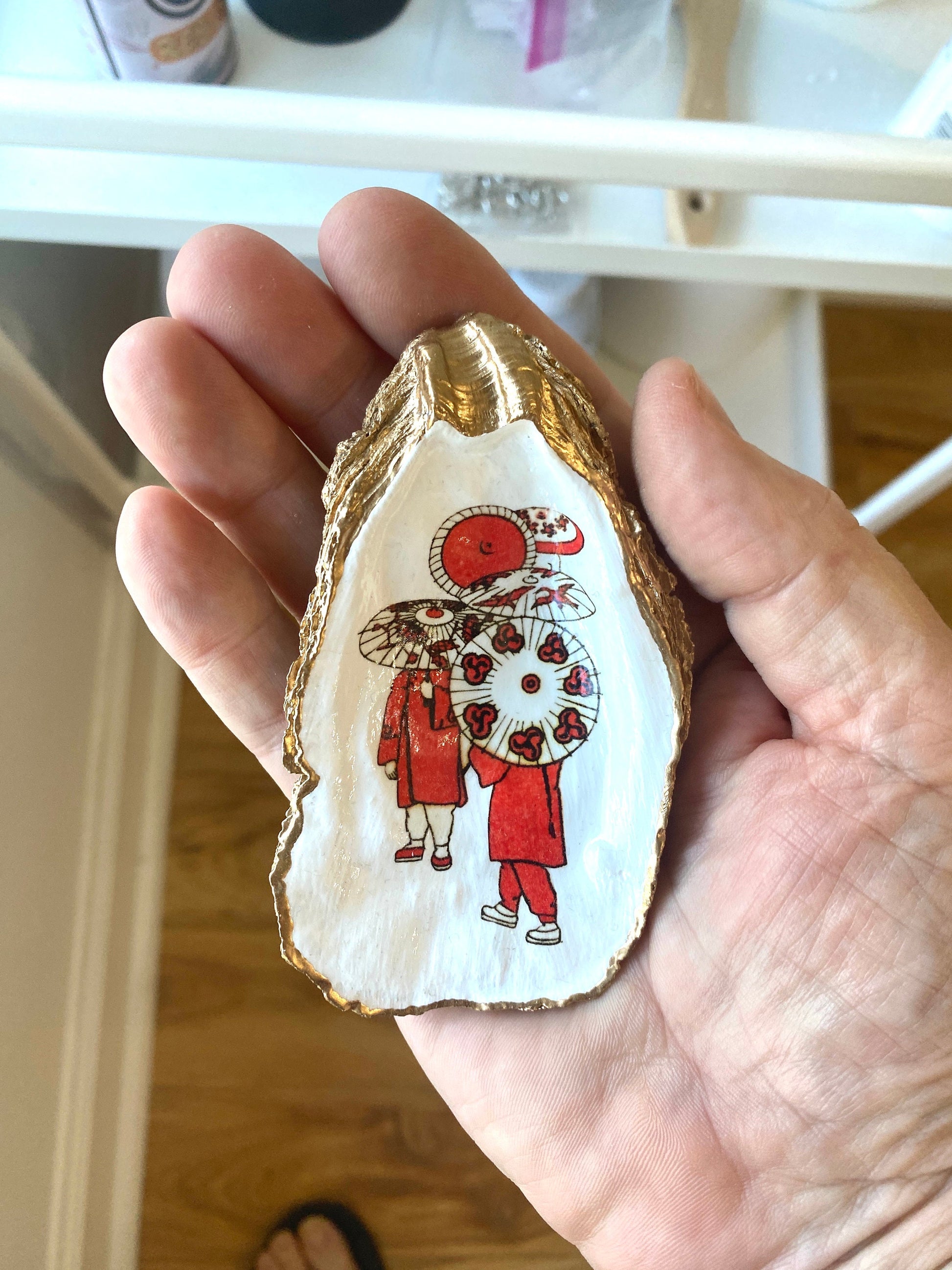 Decoupage Oyster Shell Trinket Dish – Vintage Asian Art, Beach House Accent