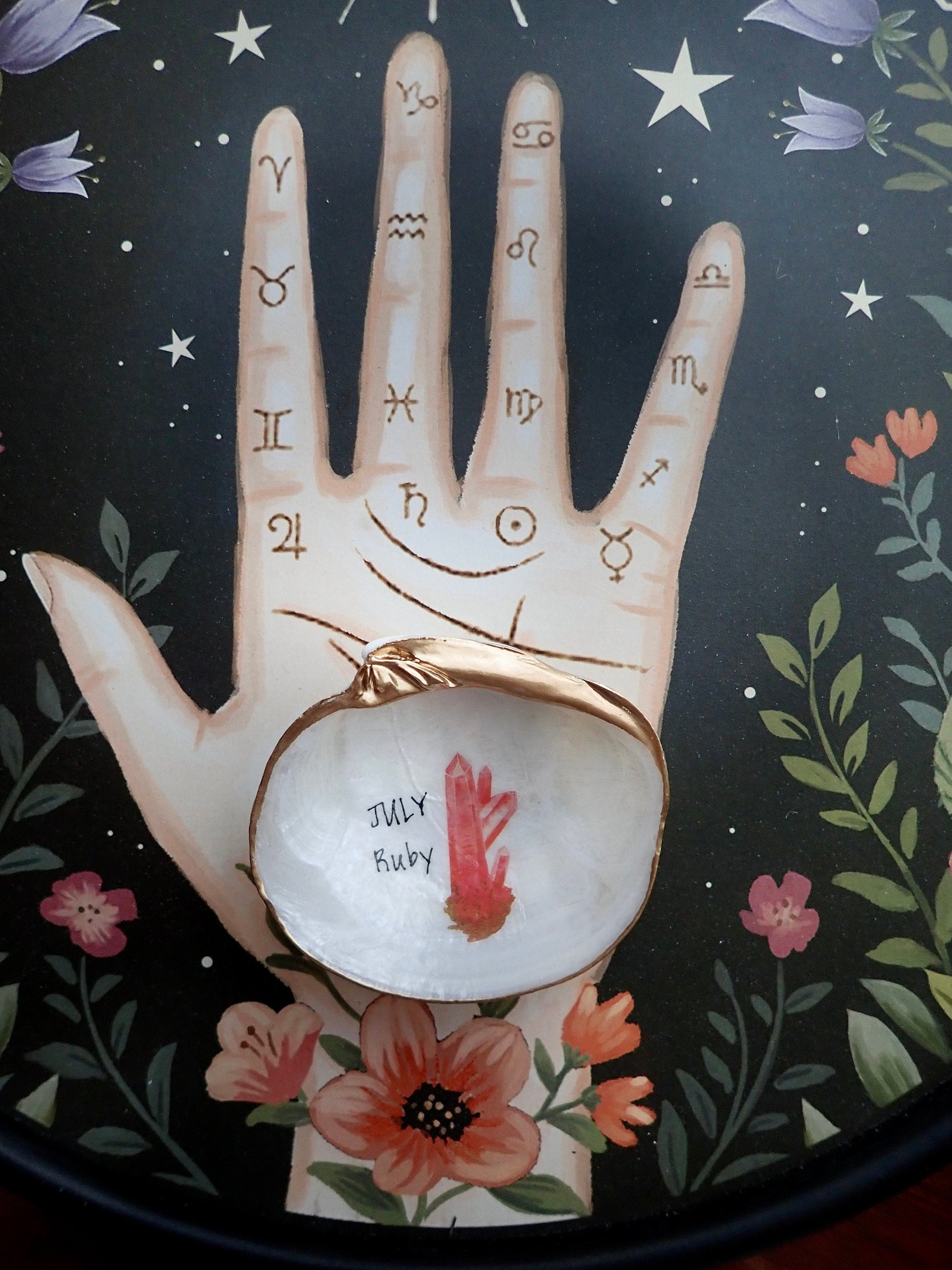 A beautiful illustration of July's birthstone, ruby, is set inside a delicate clam shell hand selected from Florida's Gulf Coast. It is sealed in a high gloss finish, and edged with a fine rim of liquid gold leaf. An elegant little trinket dish perfect for earrings, pins, and other small treasures. Rubies are the birthstone for July and the traditional gift for 40th wedding anniversaries.